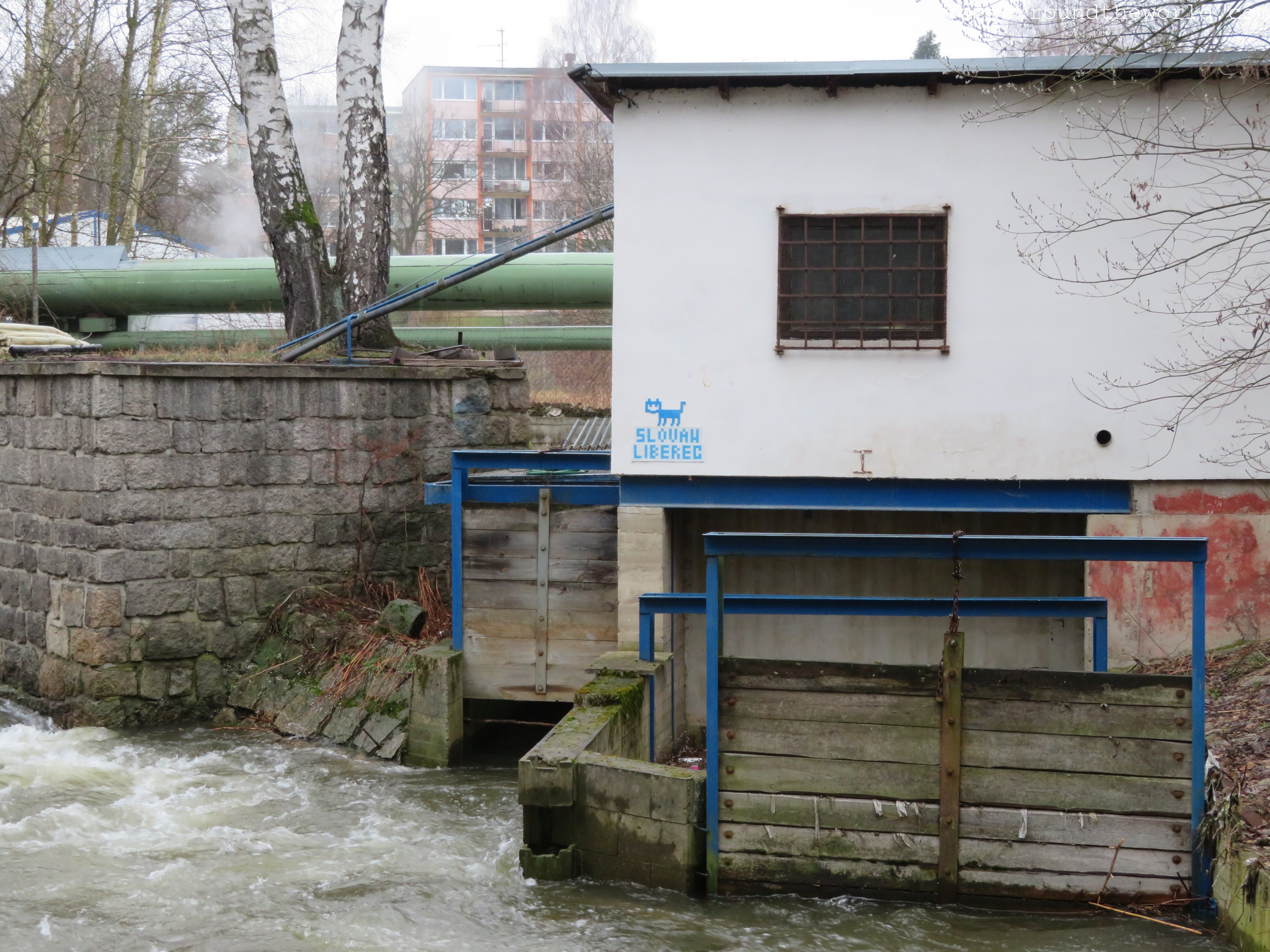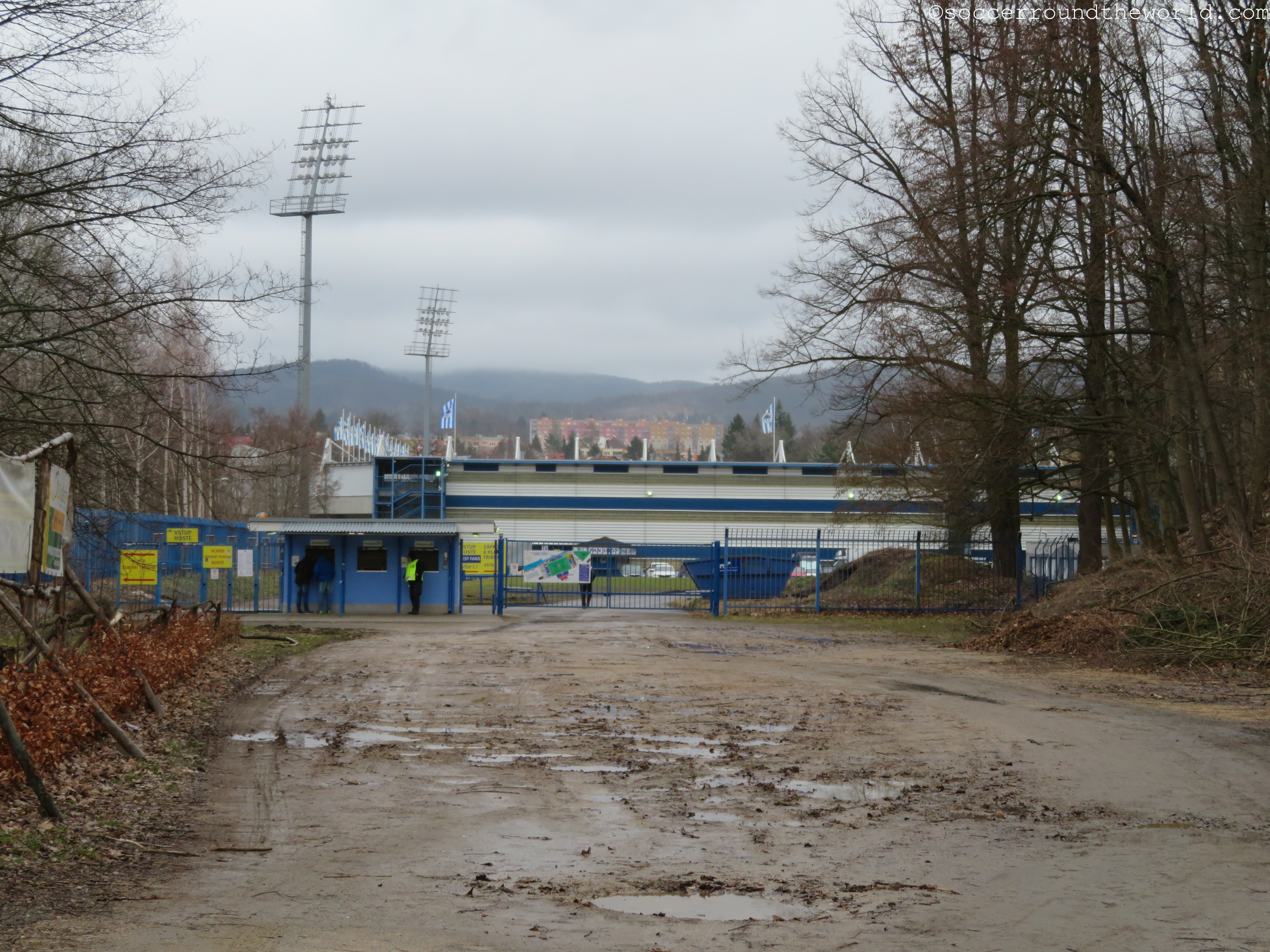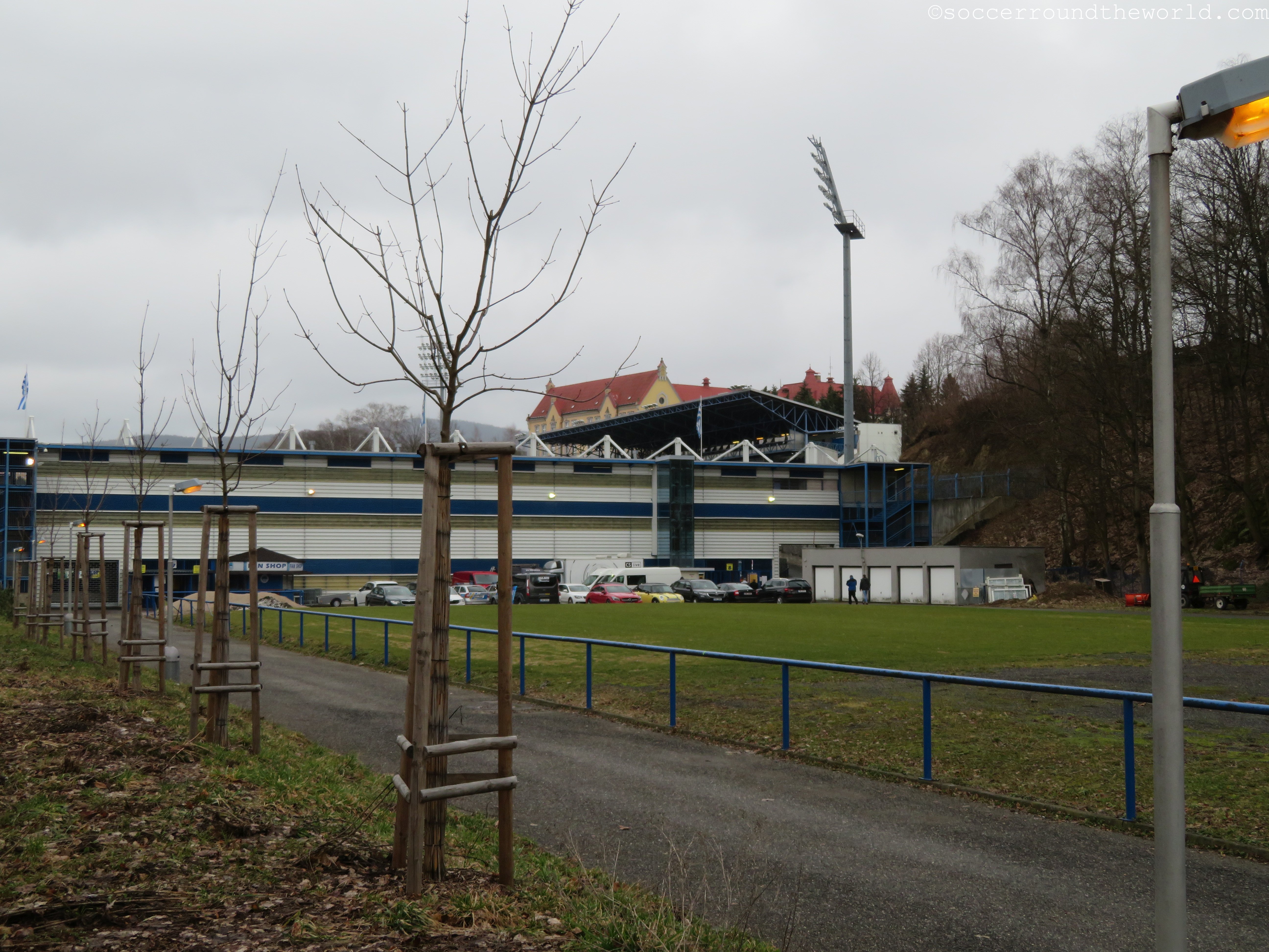 Das Stadion liegt idyllisch an der die Stadt durchfließenden Neiße. Eine der Geraden hängt sogar über den kleinen Fluß drüber – während die gegenüberliegende Seite direkt in den Berg hineingebaut ist. Diese Mischung ergibt einen Bau mit ganz eigenem Charakter, auch wenn die fast doppelt so hohe Haupttribüne dem Stadion etwas das Gleichgewicht raubt.