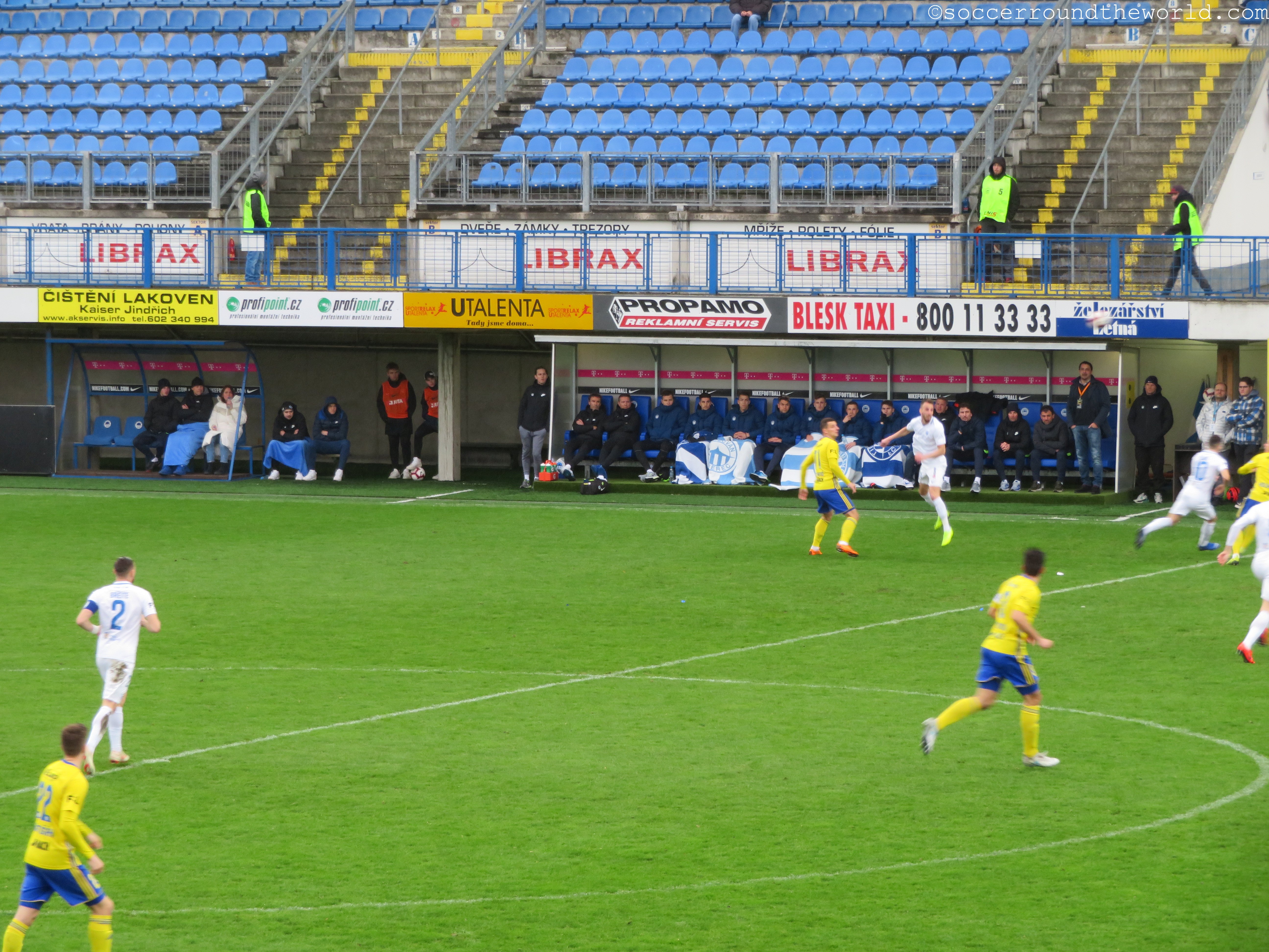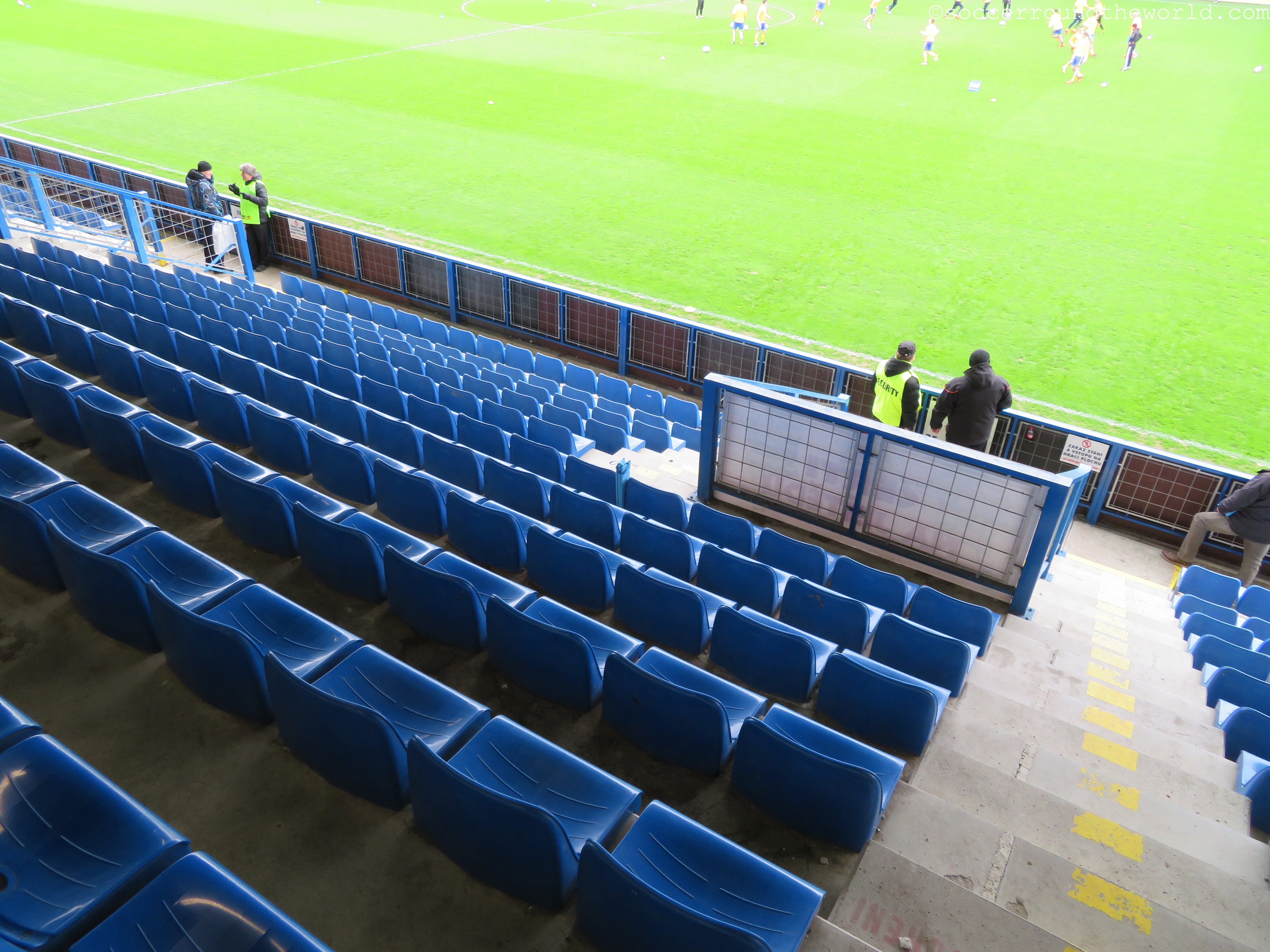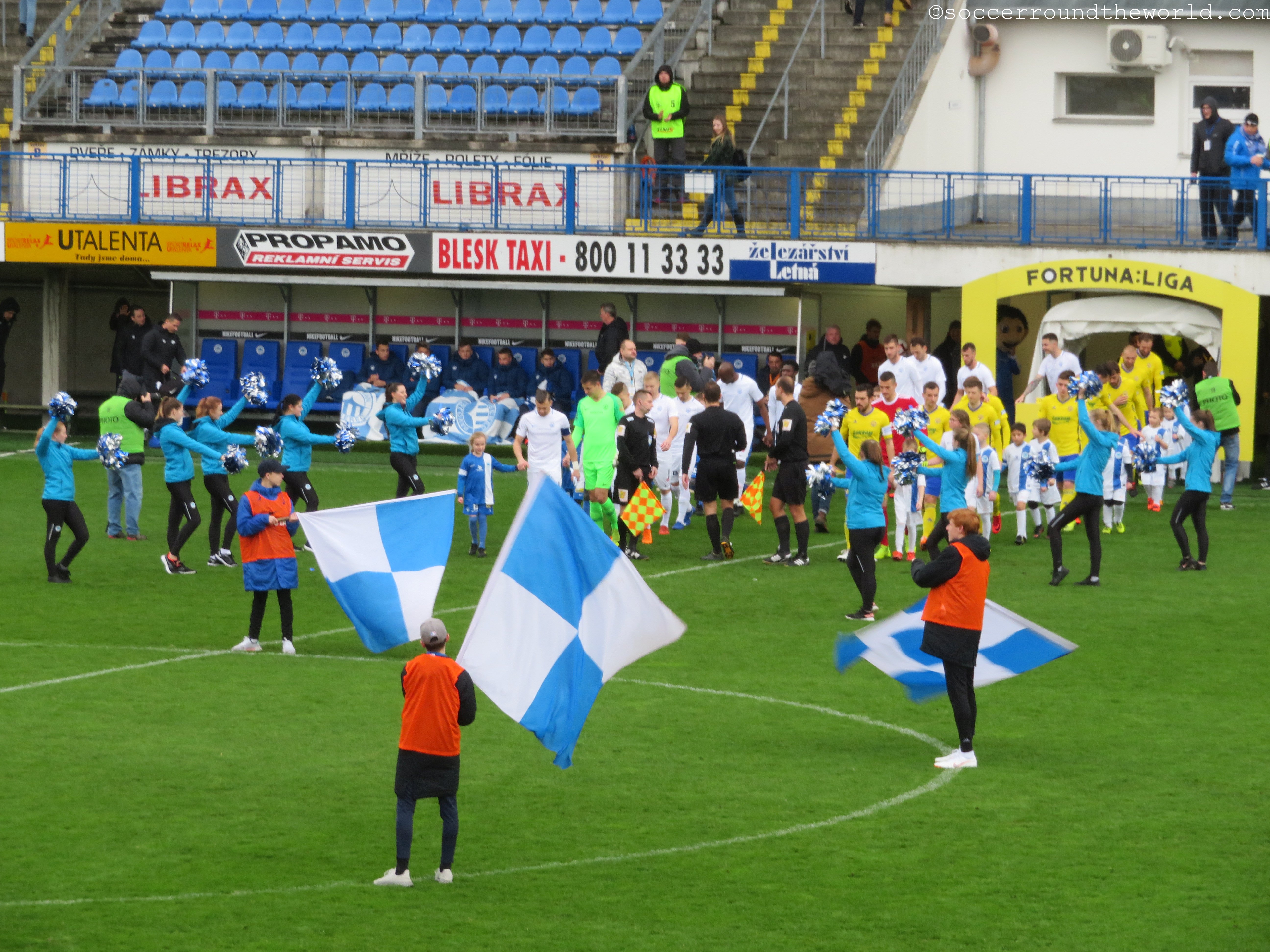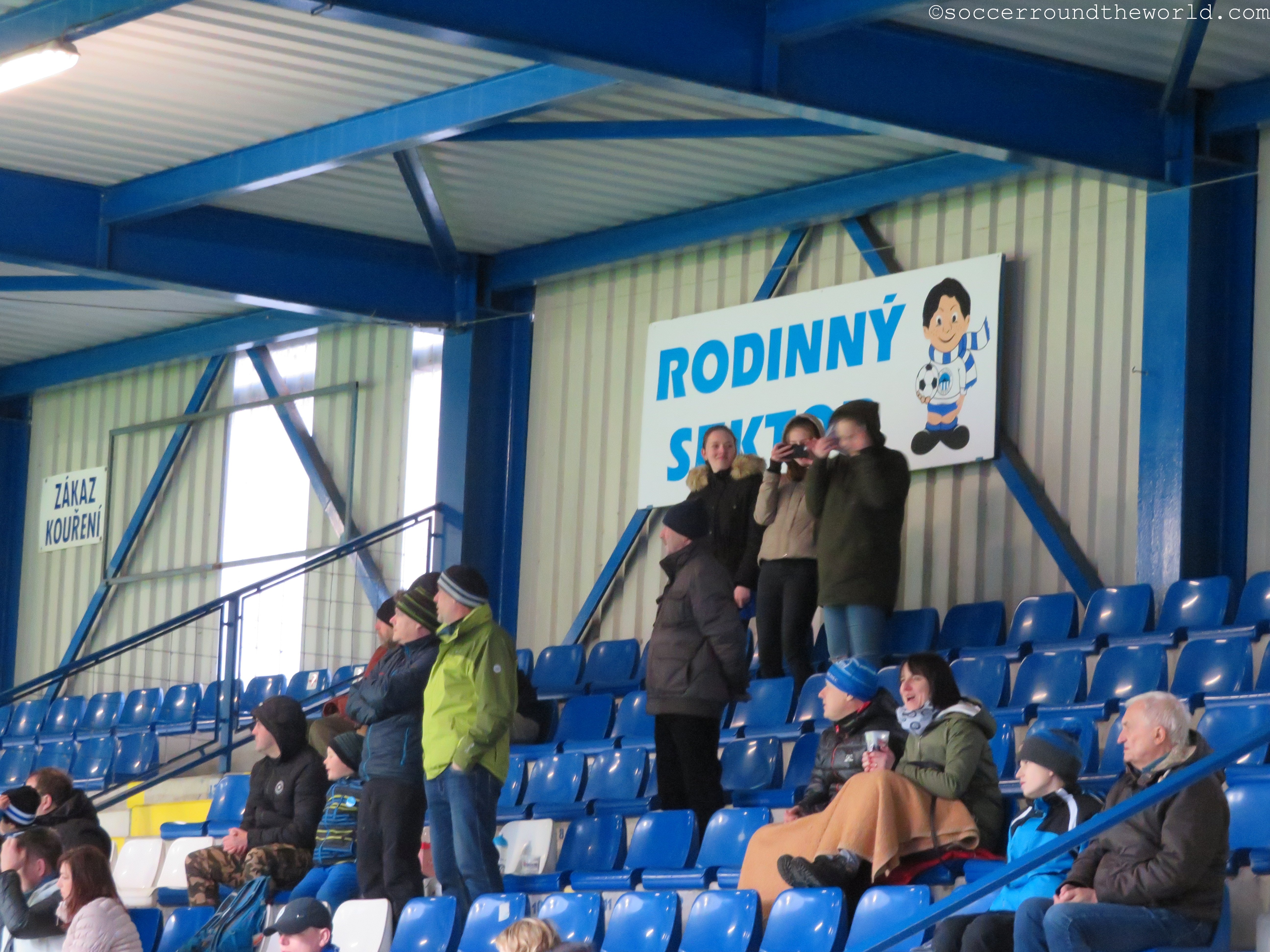 Heute zu Gast sind die „Sevci“ (Schuster) aus Zlin, deren Mannschaft ich vor knapp zwei Jahren besucht hatte. Die Handvoll mitgereister Anhänger macht durchgehend Stimmung, und kann sich gegen die zwar durchaus motivierten, aber nicht sonderlich lauten Heimfans auch immer wieder durchsetzen. Auf die anderen Tribünen springen meist nur die „Liberec“-Sprechchöre über. Ansonsten beschränkt sich der Heimsupport auf einen kleinen Sektor direkt hinter dem Tor.