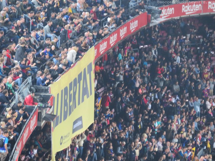 Die ersten Protestaktionen sieht man beim Einlauf der Mannschaft, als zwei riesige „Llibertat“-Banner auf der Geraden entrollt werden. Relativ rasch werden diese allerdings von den Ordnern einkassiert und entfernt. Gegen ähnliche Spruchbänder im Fansektor (deren Aufschriften ich nicht sehen kann) wird während des Spiels zu keiner Zeit vorgegangen. Aus dem Hintertorbereich werden auch die politischen Sprechchöre befeuert, die mehrmals durch das Stadion hallen („Freiheit für politische Gefangene“ etc.) und abseits der Tore für die lautesten Momente des Abends sorgen.