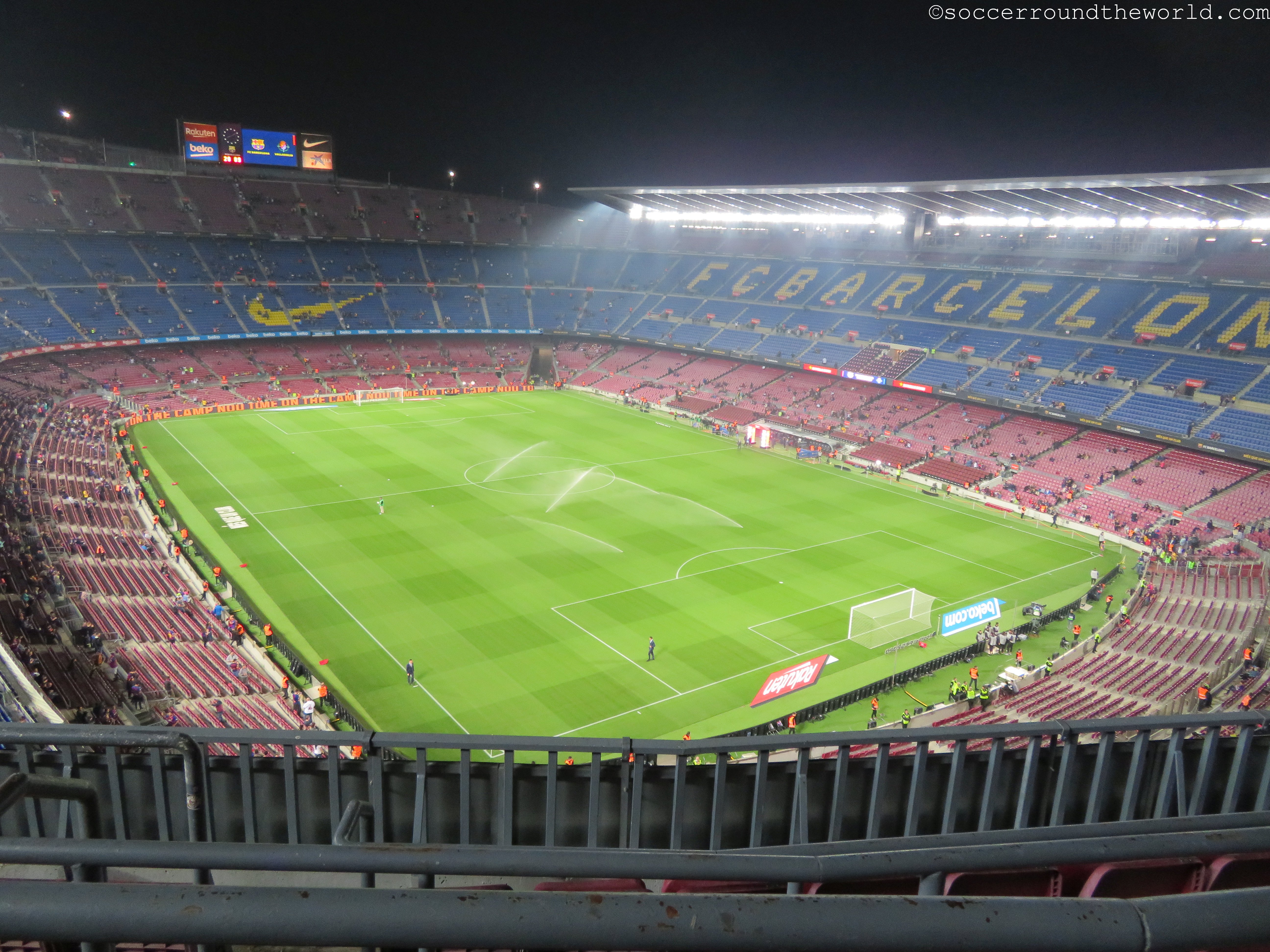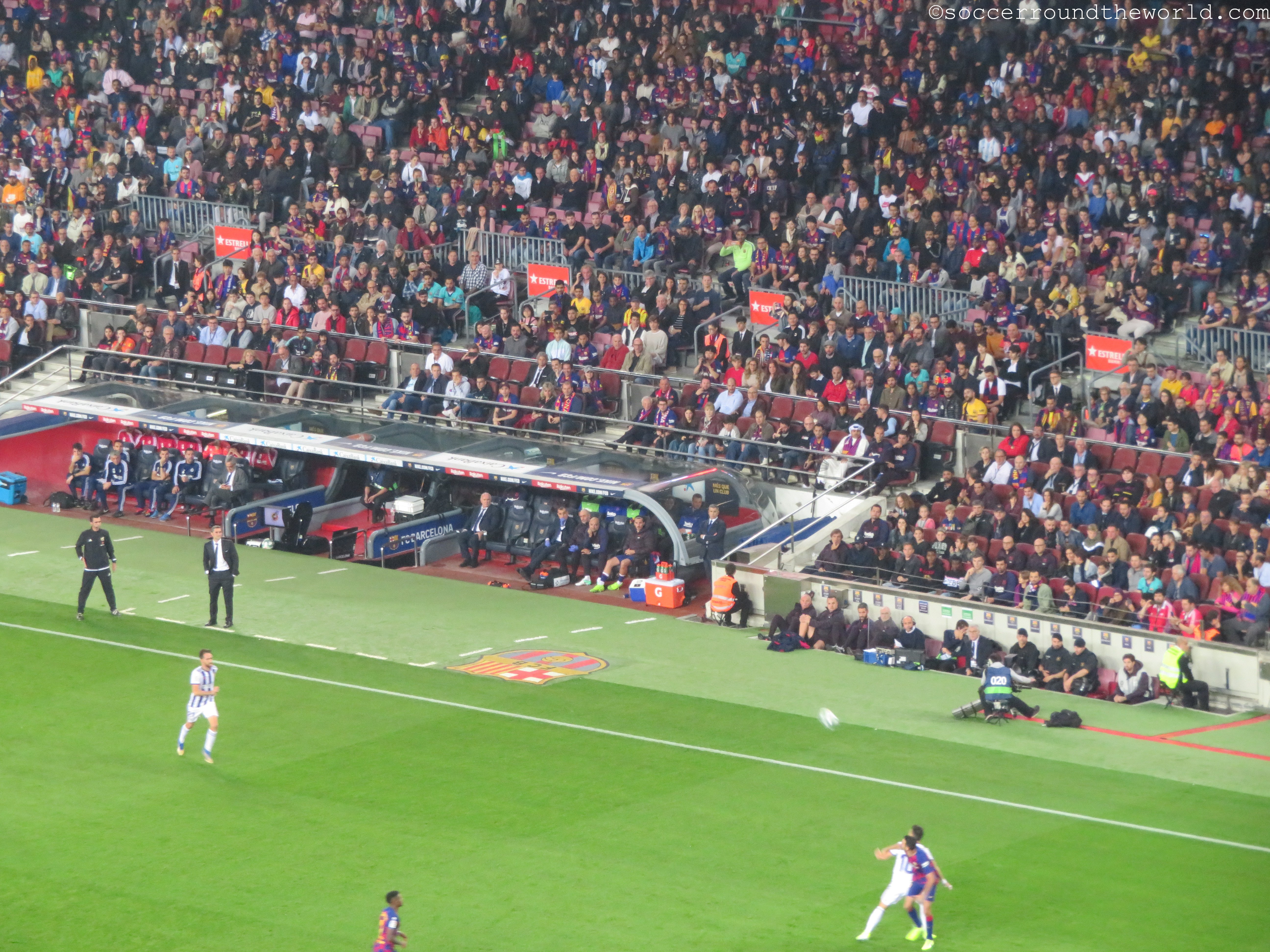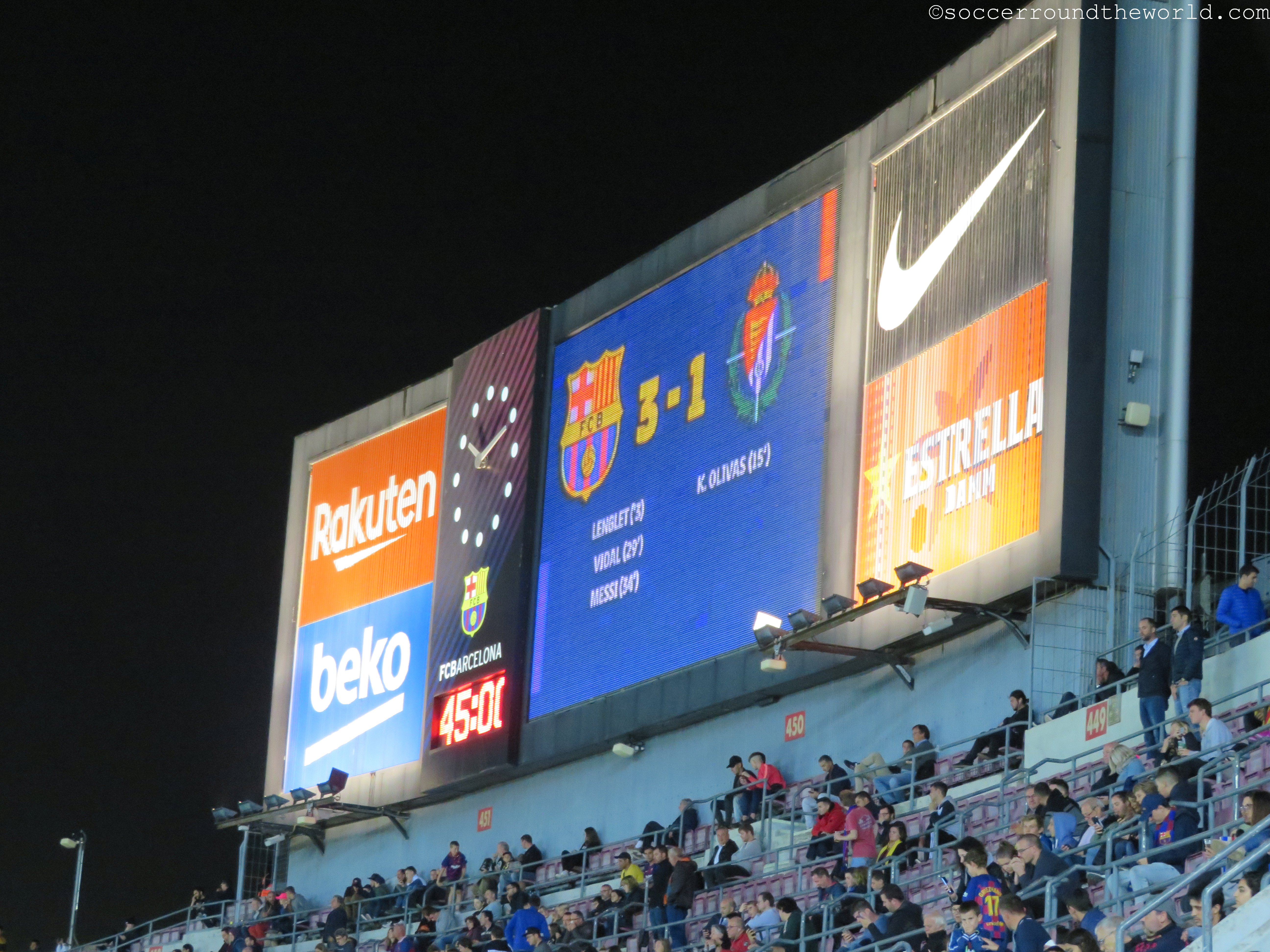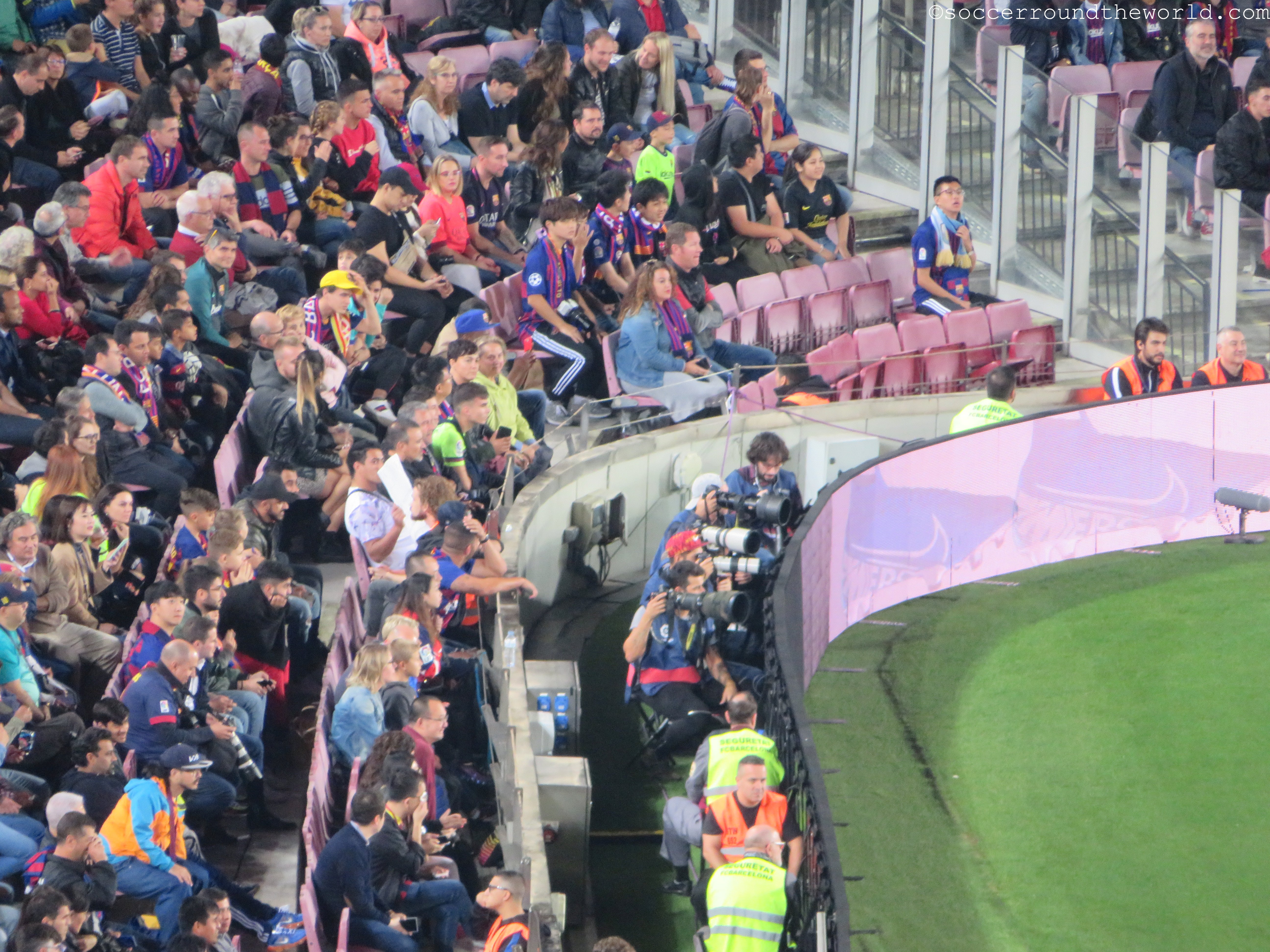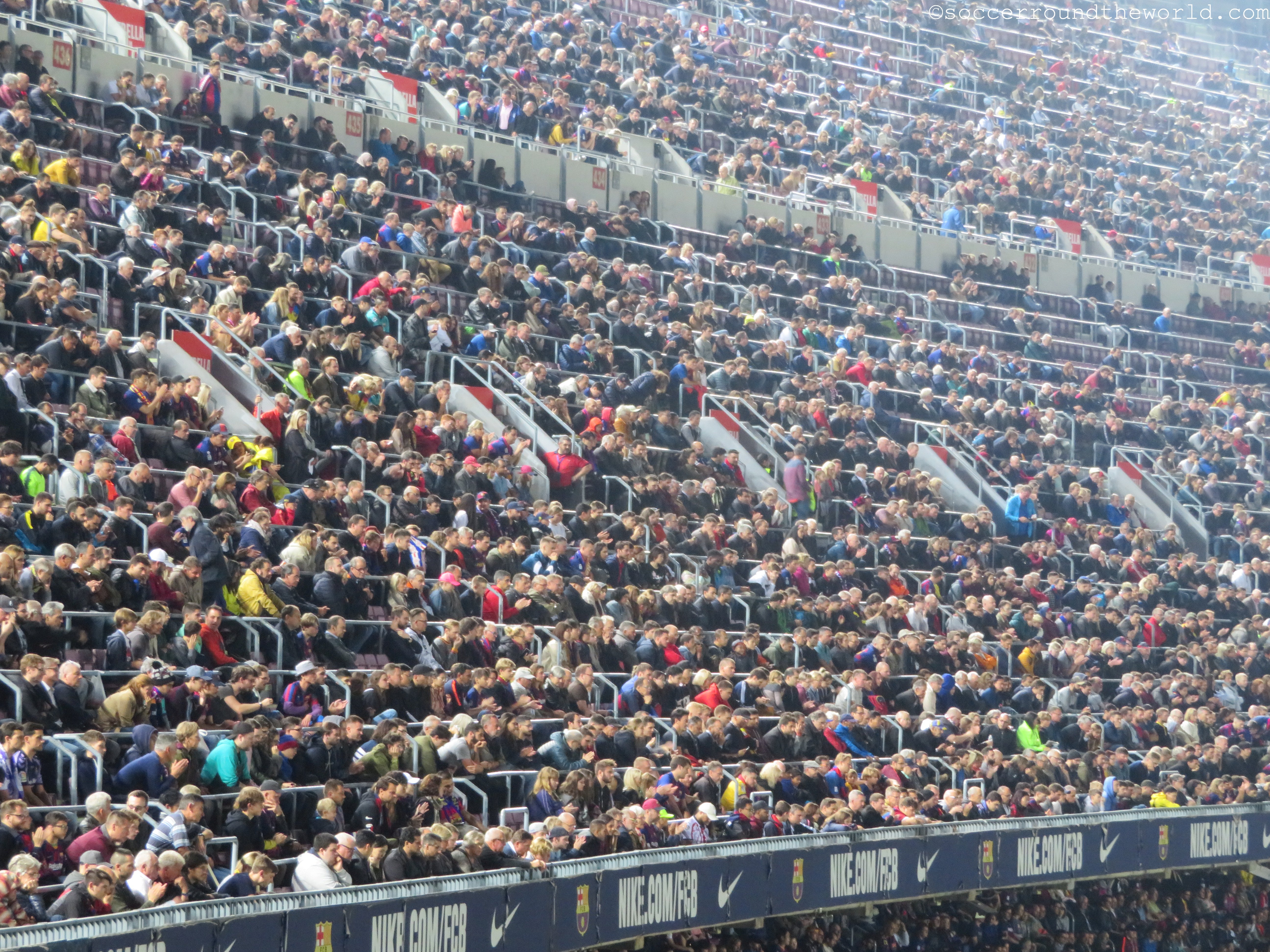 Beim am Samstag vorgesehenen Clasico wären wohl auch die Ränge um einiges voller gewesen, obwohl die knapp 60.000 durchaus eine ansehnliche Kulisse hergeben. Bei den Eingängen merkt man sehr deutlich, dass FC Barcelona mittlerweile eine globalisierte Marke ist. Katalanisch oder Spanisch hört man unter den Wartenden relativ selten – Französisch, Deutsch, Russisch und diverse asiatische Sprachen dafür umso mehr. Einheimische versuchen eher ihre Karten auf dem (heute) nicht sehr gefragten Schwarzmarkt doch noch anzubringen.