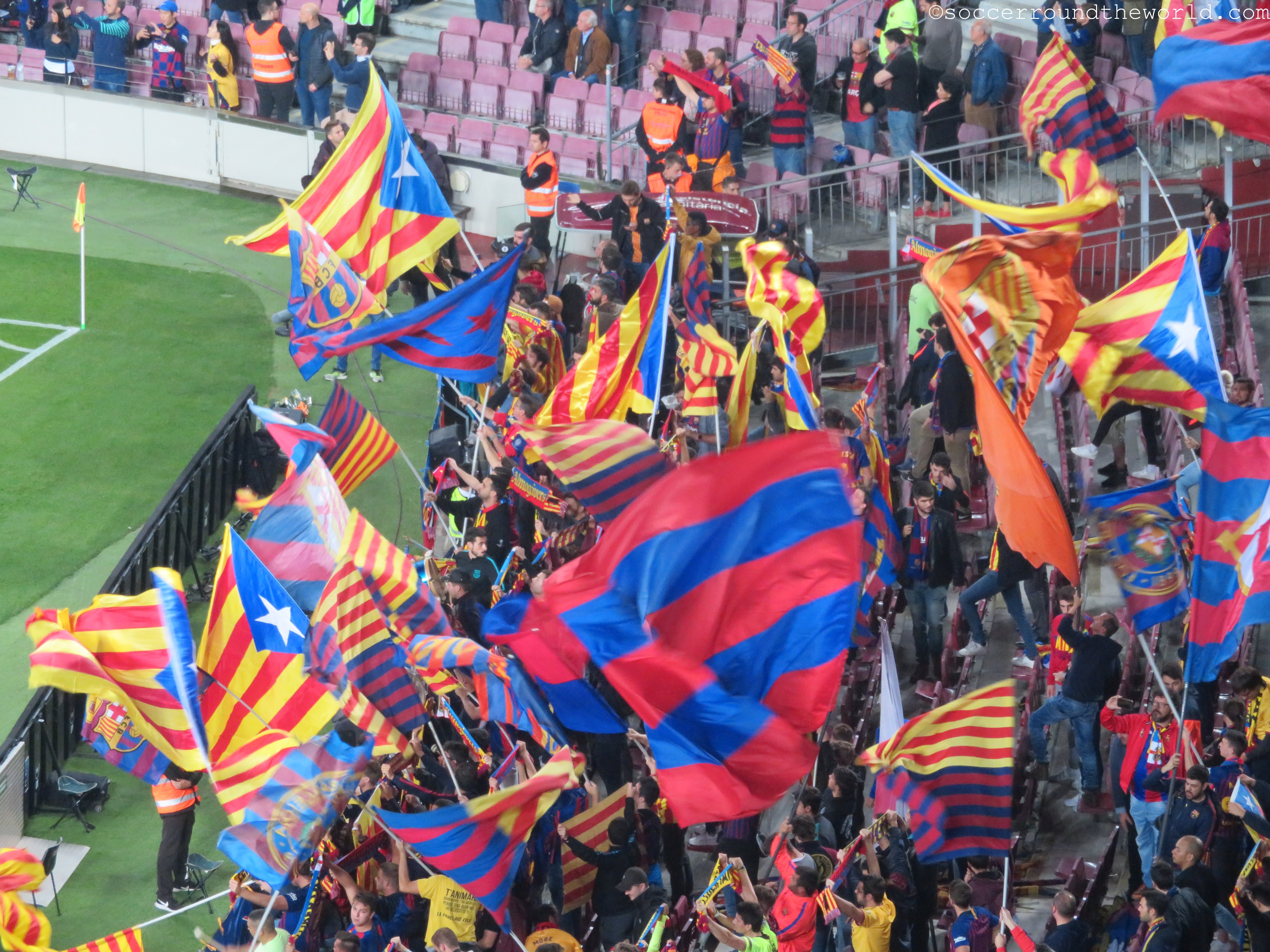 Die ersten Protestaktionen sieht man beim Einlauf der Mannschaft, als zwei riesige „Llibertat“-Banner auf der Geraden entrollt werden. Relativ rasch werden diese allerdings von den Ordnern einkassiert und entfernt. Gegen ähnliche Spruchbänder im Fansektor (deren Aufschriften ich nicht sehen kann) wird während des Spiels zu keiner Zeit vorgegangen. Aus dem Hintertorbereich werden auch die politischen Sprechchöre befeuert, die mehrmals durch das Stadion hallen („Freiheit für politische Gefangene“ etc.) und abseits der Tore für die lautesten Momente des Abends sorgen.