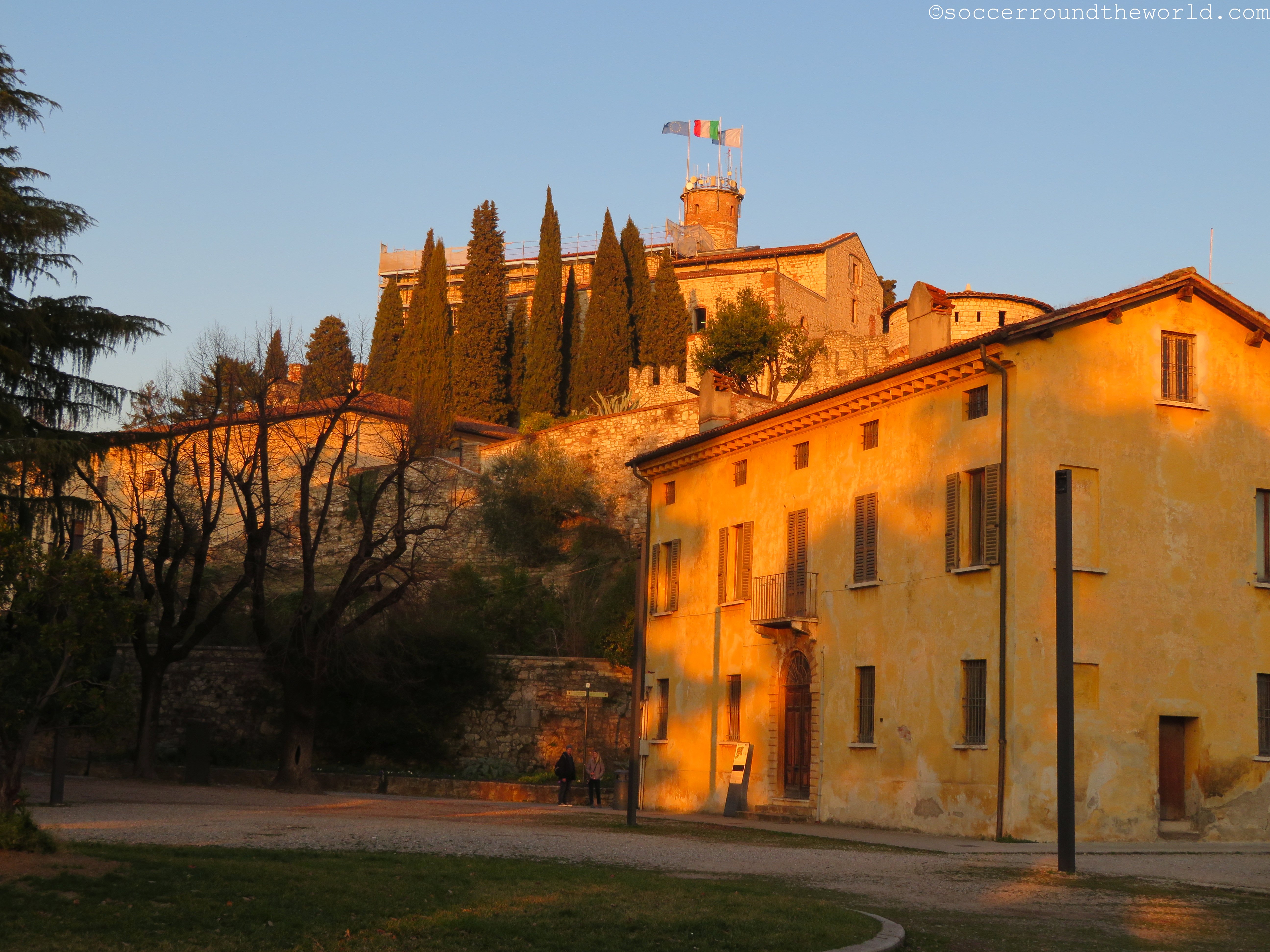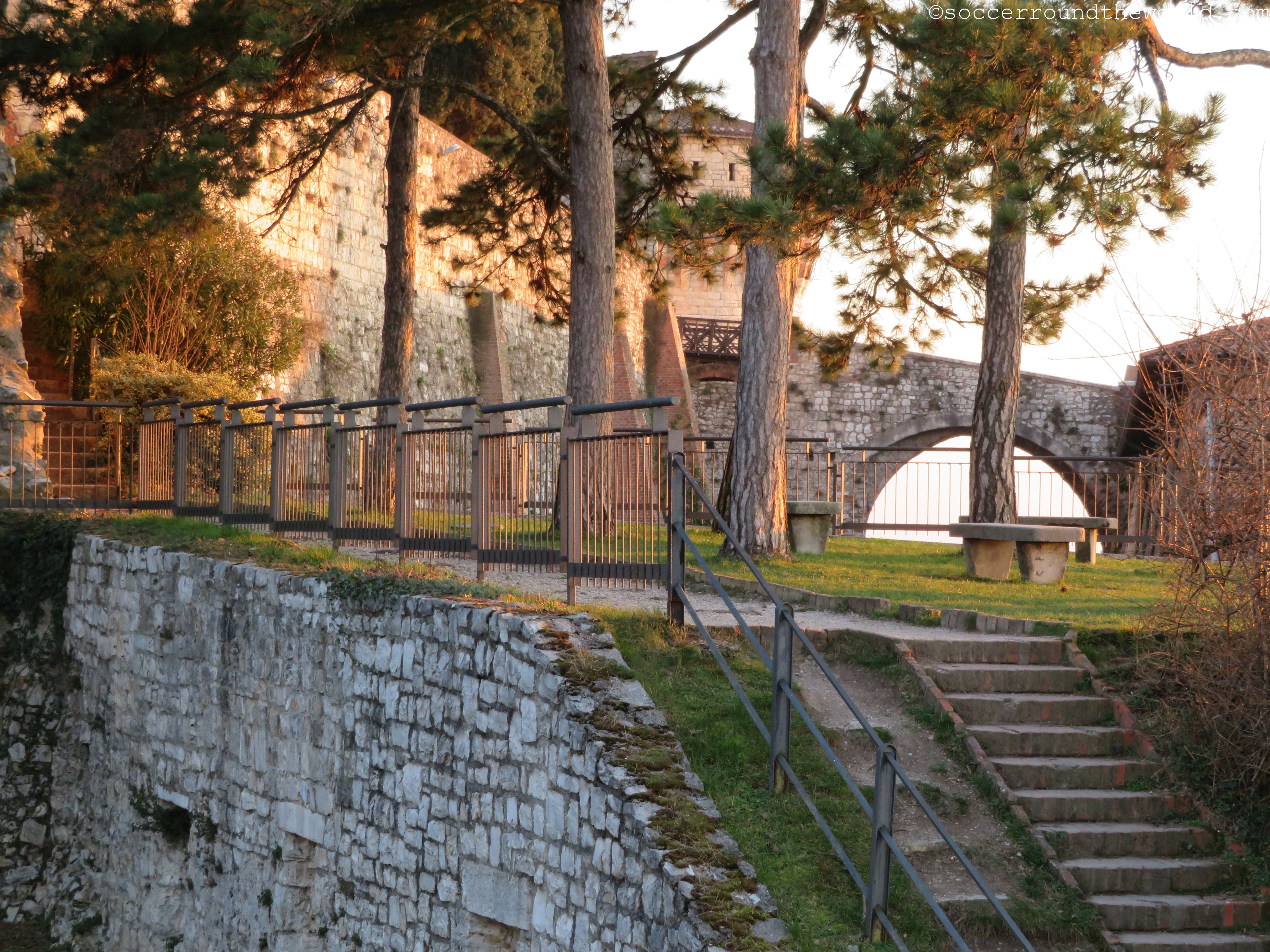 Erst am späten Nachmittag lande ich in der lombardischen Stadt, für einen Rundgang vor dem Match reicht es aber noch allemal. Das Licht der Frühlingssonne ist dafür auch noch ziemlich perfekt, vor allem das städtische Castell wird von ihr in die schönsten Farben gehüllt. Kein Wunder, dass sich hier – zumindest gefühlt – auch das meiste Leben in der Stadt abspielt, während das Zentrum weitgehend menschenleer ist.