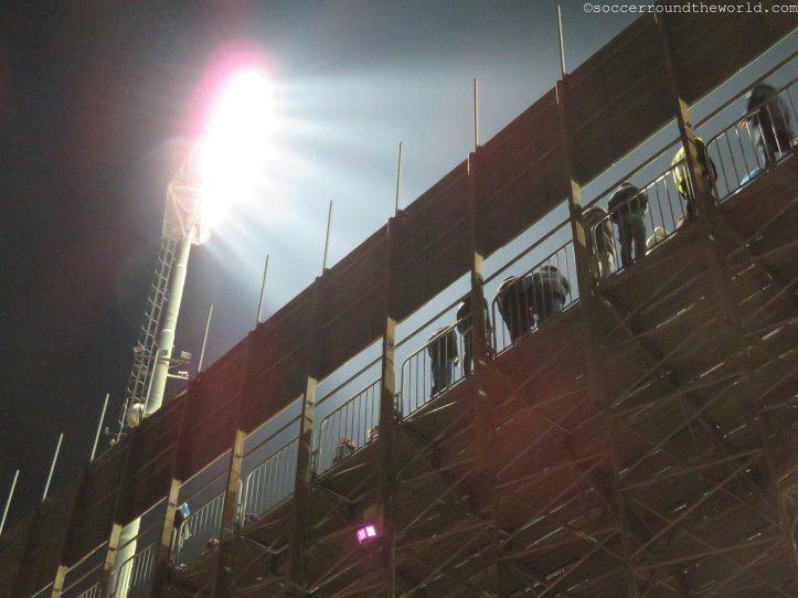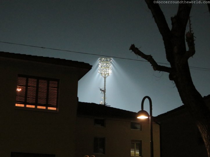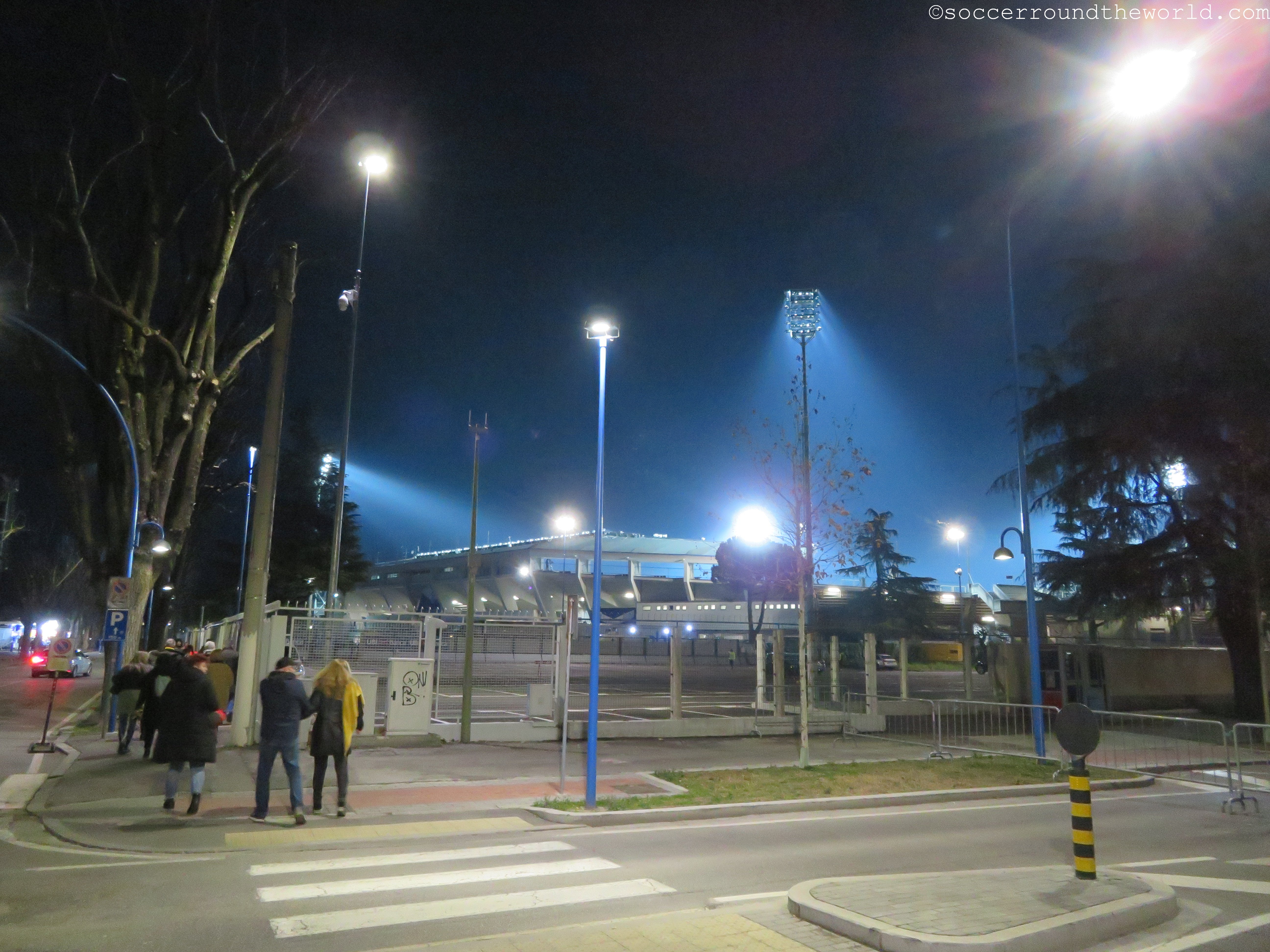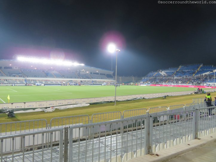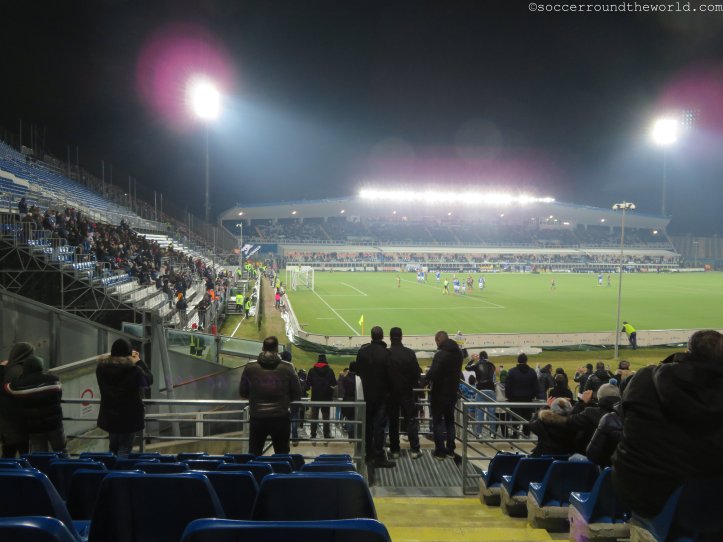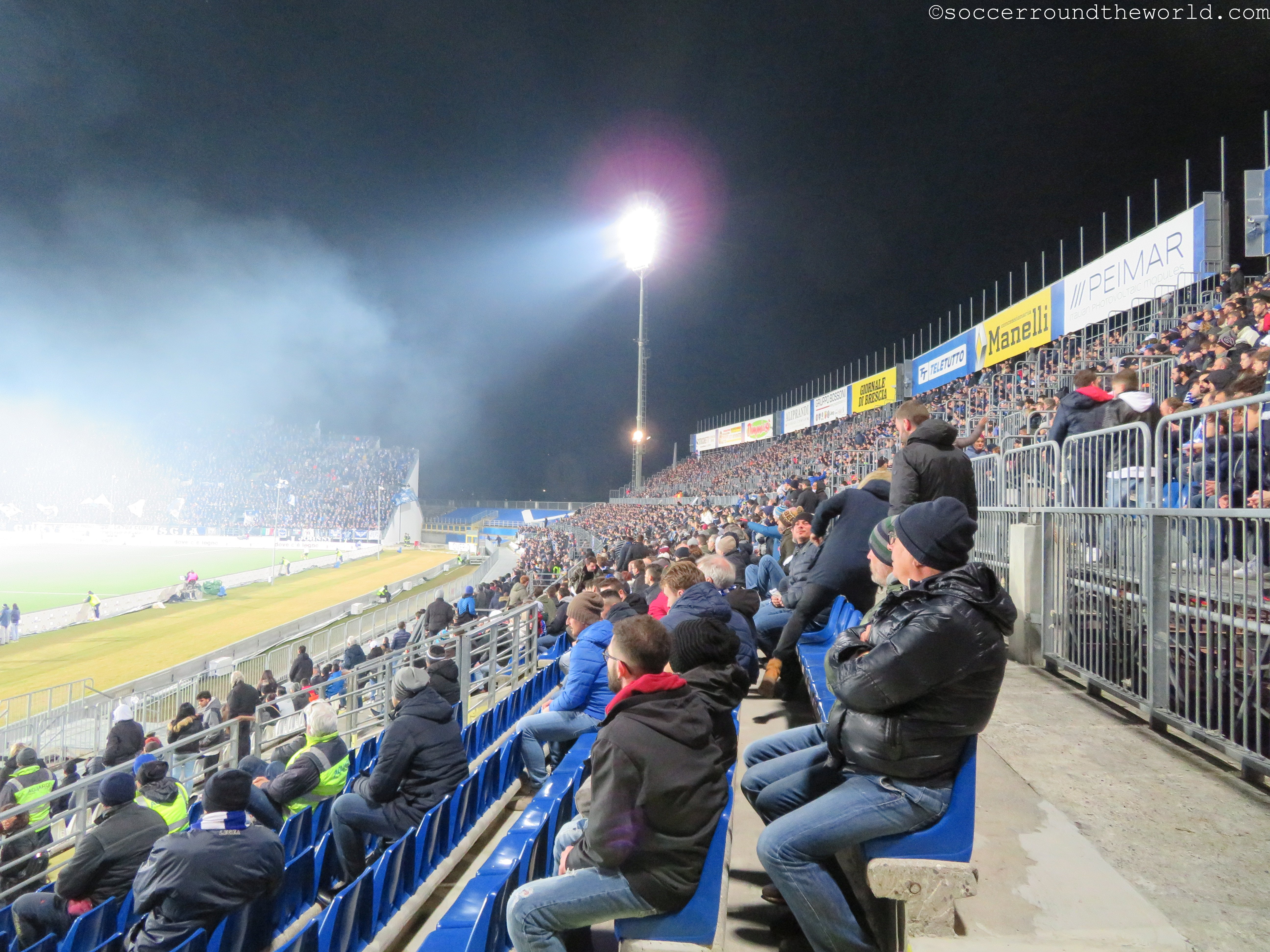 Zum Stadion geht es gemütlich mit der U-Bahn, die es hier seit 2013 gibt und neben Mailand die einzige in der Lombardei ist. Schon von außen erkennt man den bestenfalls als provisorisch zu beschreibenden Zustand der meisten Tribünen. Bis auf eine bestehen alle aus Stahlrohrkonstruktionen, in sehr vielen Ländern wäre dies wohl in dieser Form nicht für die höchste Klasse zugelassen. Auch sonst lässt die Infrastruktur zu wünschen übrig: Meinen auf der Karte aufgedruckten Sektor gibt es so zum Beispiel gar nicht – und auch die Ordnungskräfte raten eher, als sie wirklich eine fachkundige Auskunft geben können. Und bei dieser Rätselrallye vor dem Spiel bin ich bei Weitem nicht der Einzige an diesem Abend. Vielfach endet sie schließlich bei freier Sitzplatzwahl.