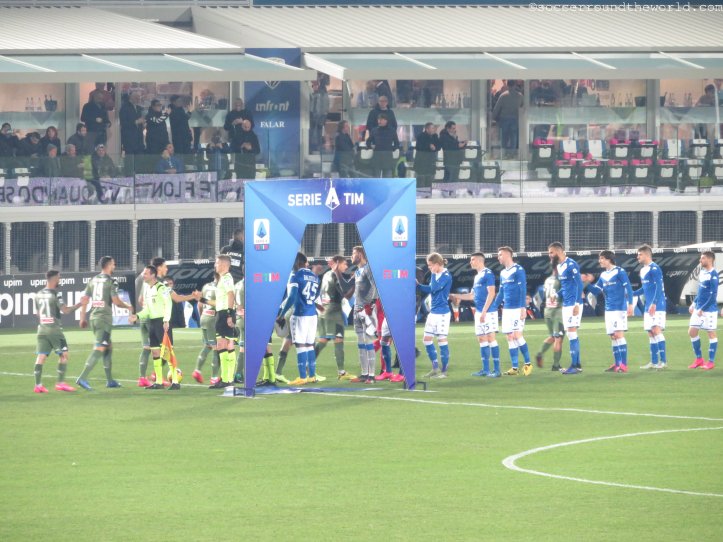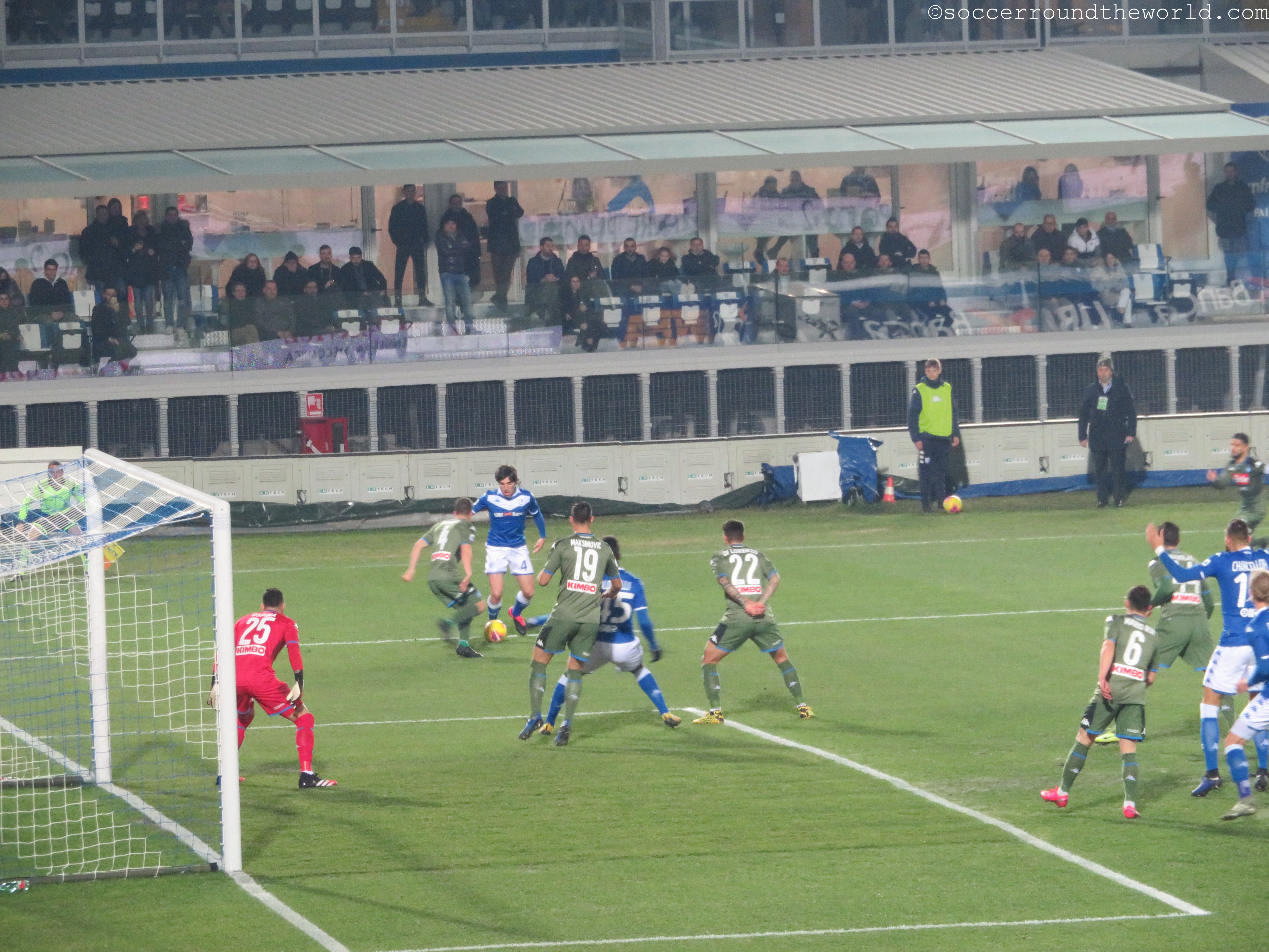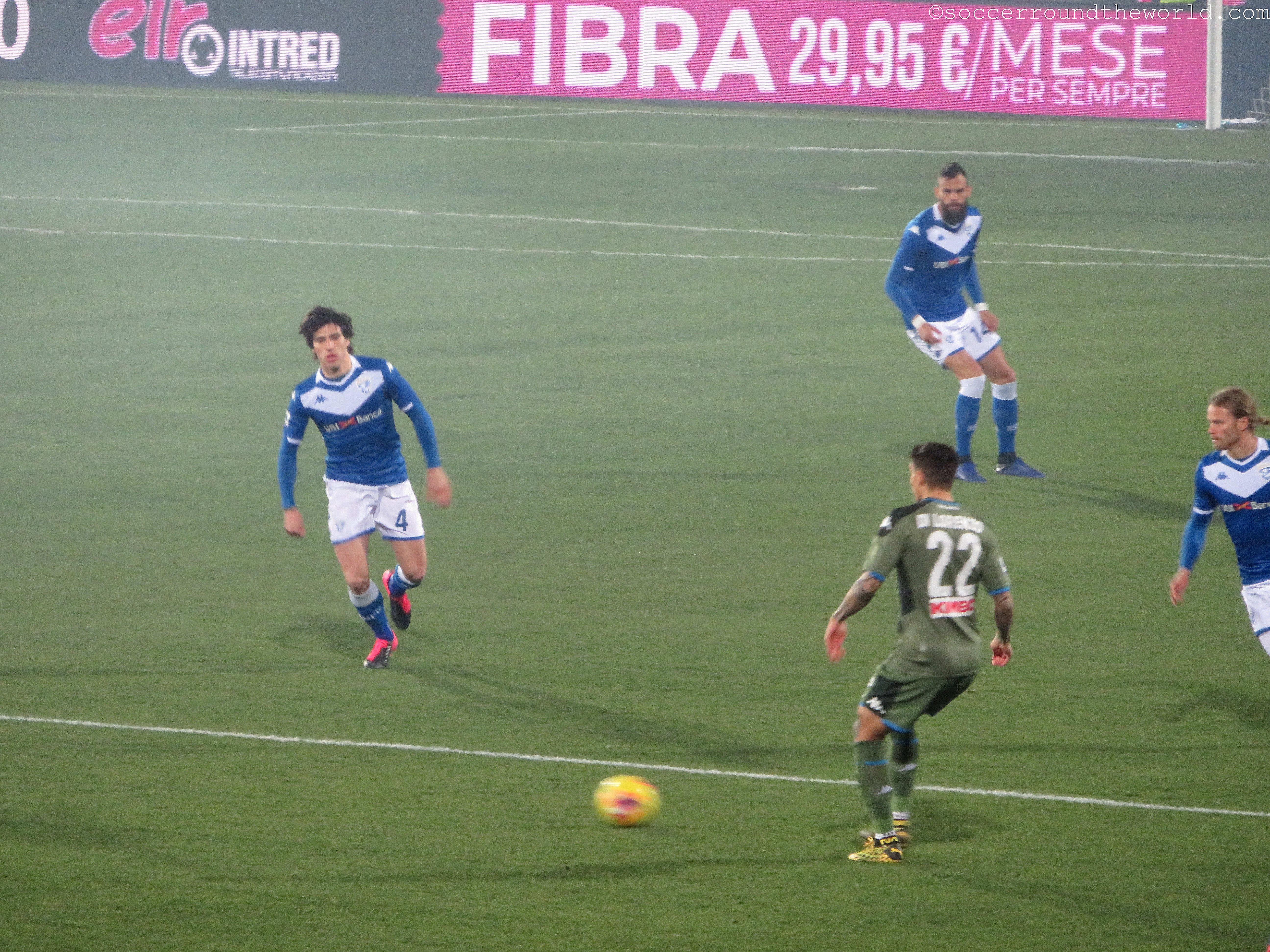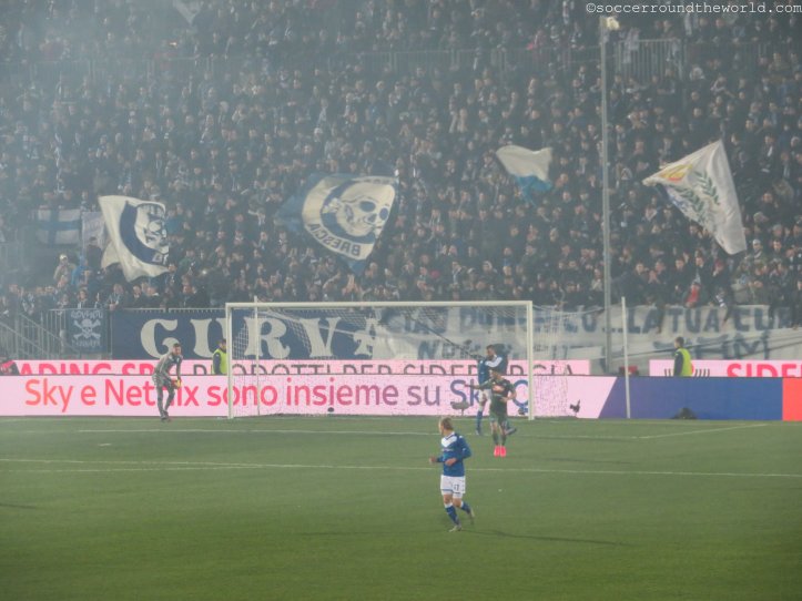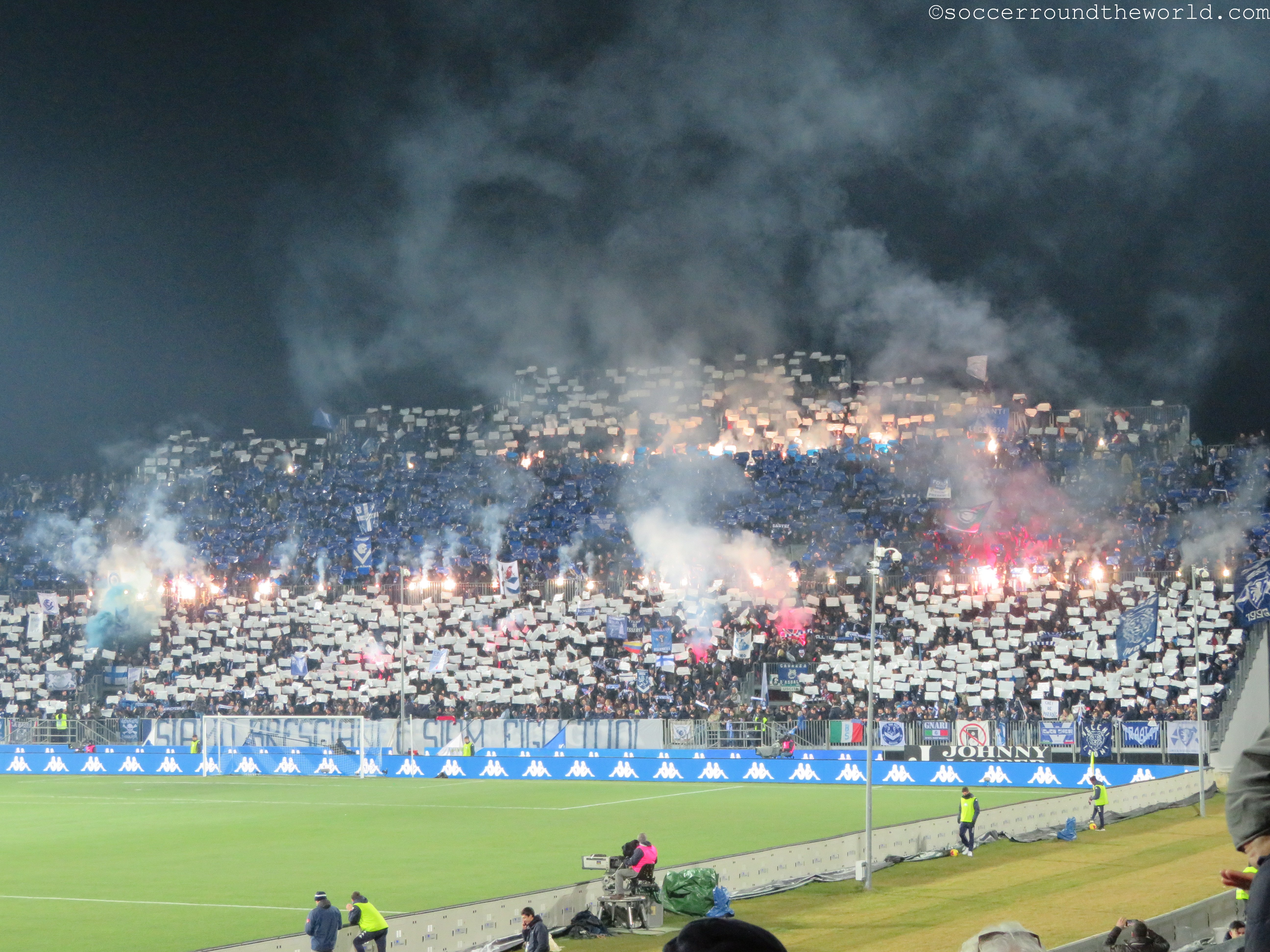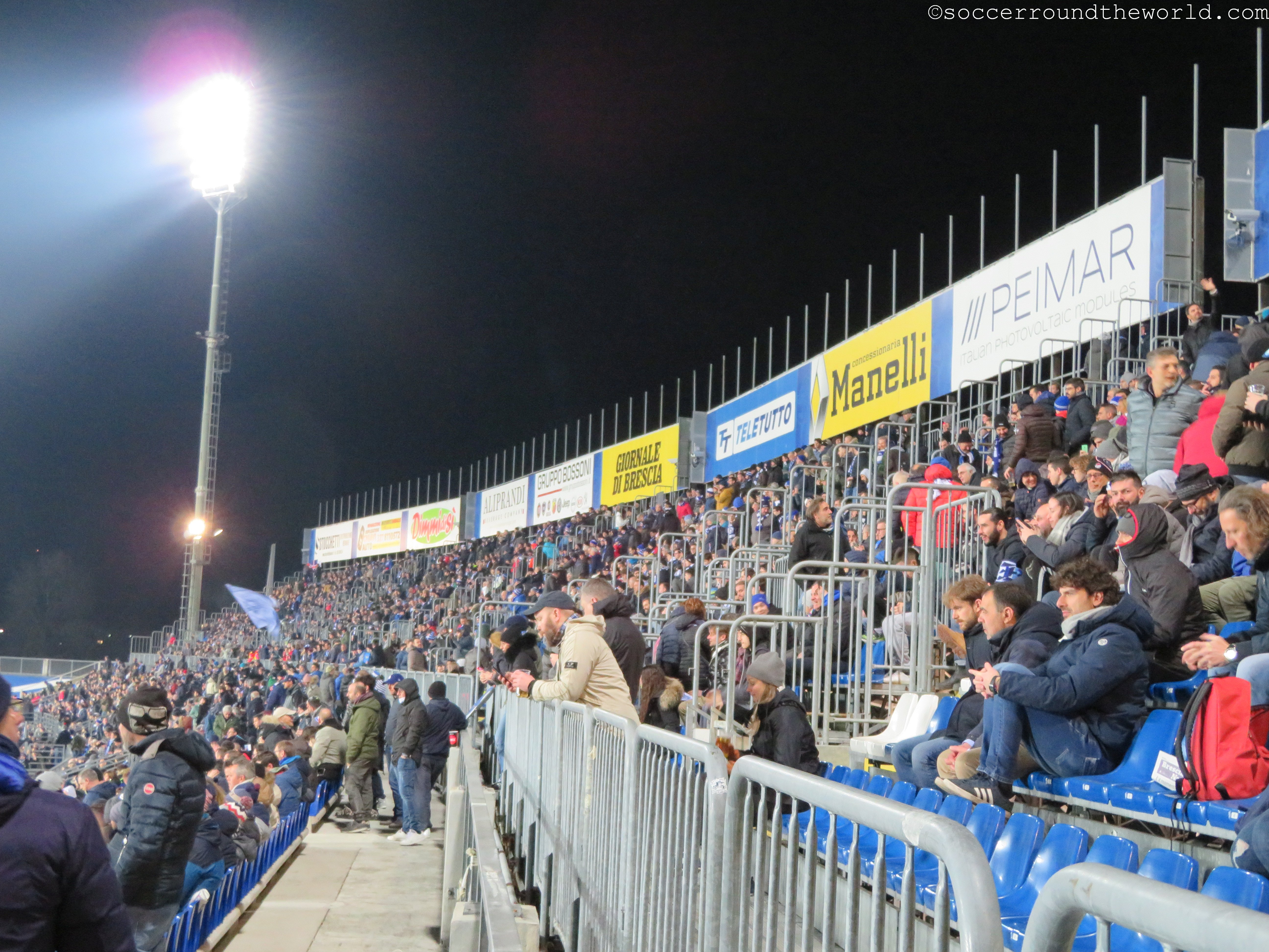 Dass auf der Gegengeraden neben Heimfans auch noch einige verstreute Napoli-Anhänger sind, geht nur bis zum Ausgleich der Gäste in der zweiten Halbzeit durch einen Elfmeter gut. Danach kippt die Stimmung sehr schnell und die Himmelblauen sind nicht mehr wirklich sicher auf ihren Plätzen. Die Securitys mitsamt Militärpolizei hat alle Hände voll zu tun, dass ihnen die Situation nicht völlig entgleitet. Erst als die Gästefans auf die Hintertortribüne geleitet werden, beruhigt sich alles wieder ein wenig. Dennoch dominieren ab diesem Zeitpunkt die Schmähgesänge gegen die Süditaliener auf den Tribünen. An der Niederlage für Brescia ändert dies aber auch nichts.