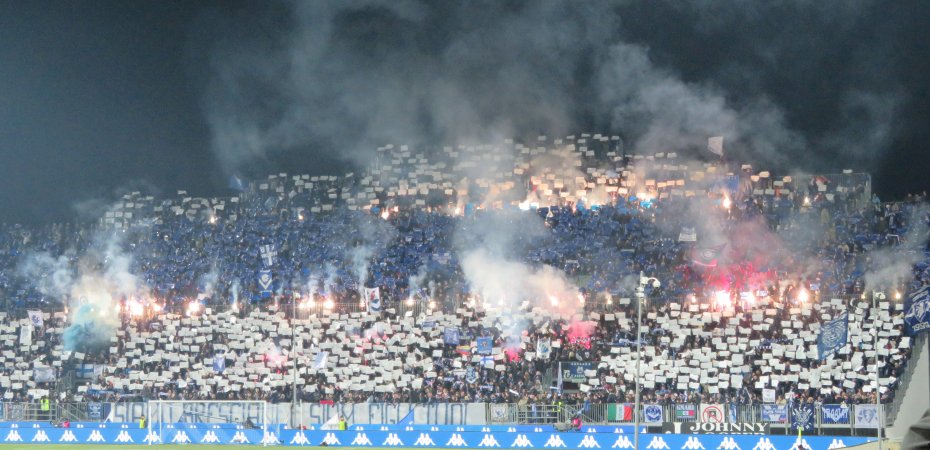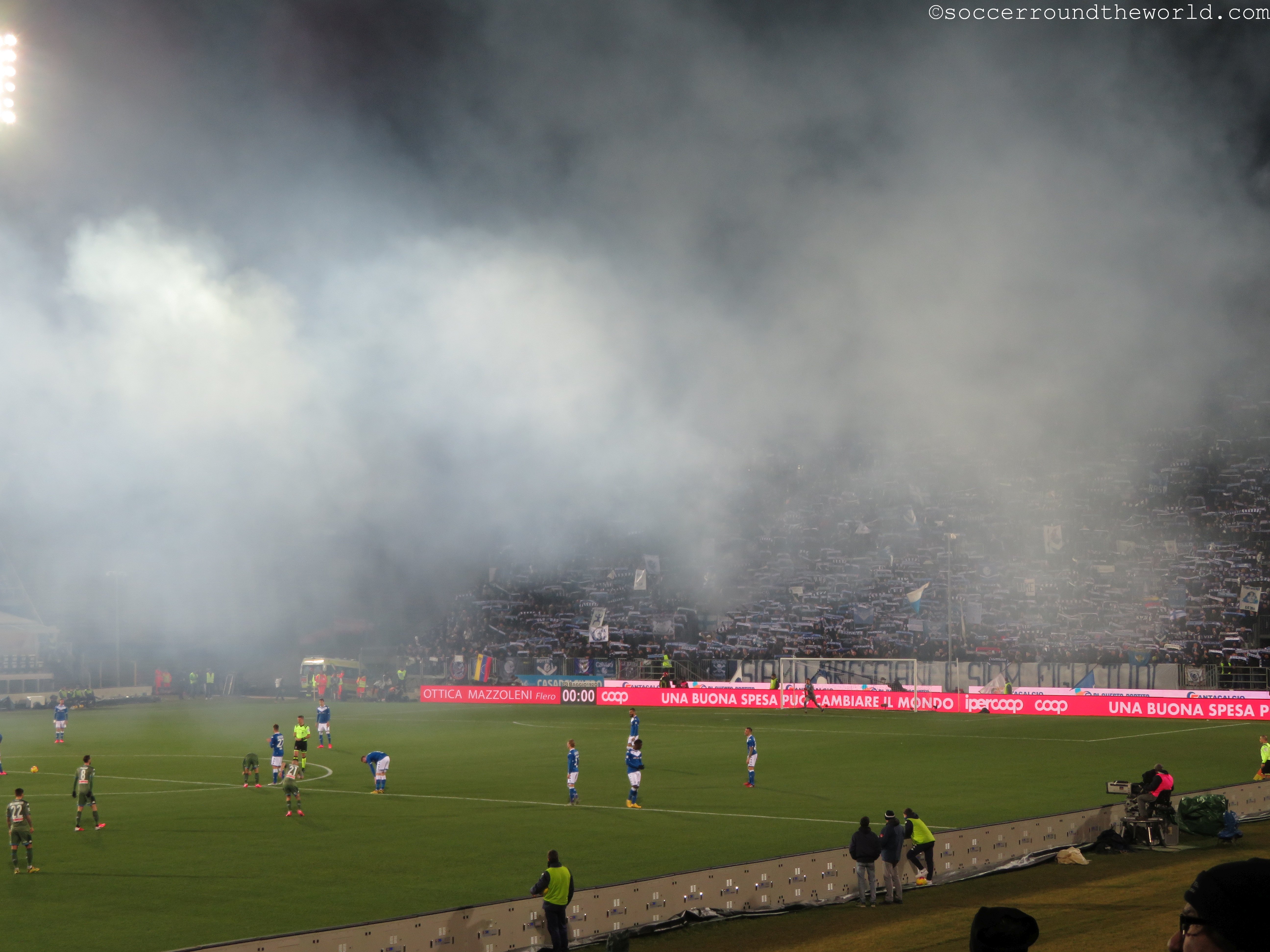 Die Stimmung auf den Rängen erfüllt dafür alle Erwartungen. Vor allem die Heimfans werden wiederholt beeindruckend laut, wobei der Führungstreffer ihres Teams dabei sicher sehr förderlich ist. Die Stahlrohrtibünen erfüllen hier immerhin jenen Sinn, dass durch rhytmisches Treten auf deren Böden eine gute Grundatmosphäre geschaffen wird, welche die Gesänge immer wieder auch noch zusätzlich verstärkt. Zudem kann Brescia auch mit einer okayen Zettelchoreo und sehr viel Pyroeinsatz überzeugen.