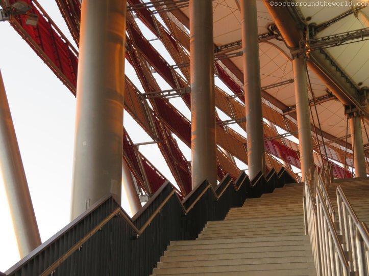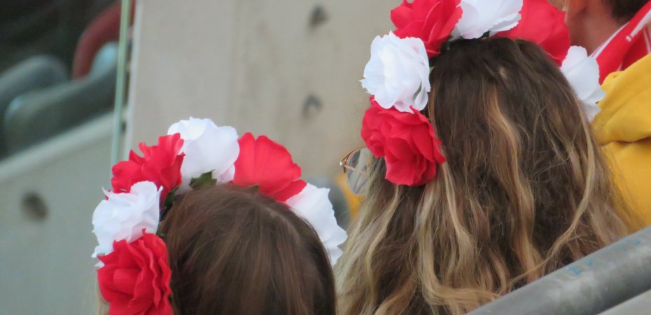 Ebenfalls nur auf dem Papier existierend hätte ich die Zuschauerzahl eingeschätzt. Bei offiziell über 38.000 Menschen im Stadion hat der polnische Verband wohl mehrere Augen zugedrückt. Einige Ränge sind zwar durchaus gut besucht, aber vor allem in den Kurven klaffen doch ganz schön große Lücken, wodurch auch der Platzwechsel während des Spiels überhaupt kein Problem darstellt. Die real anwesenden Fans erzeugen jedenfalls durchwegs gute Stimmung und scheinen das durchwachsene Spiel ihrer Rot-Weißen nicht so tragisch zu sehen.