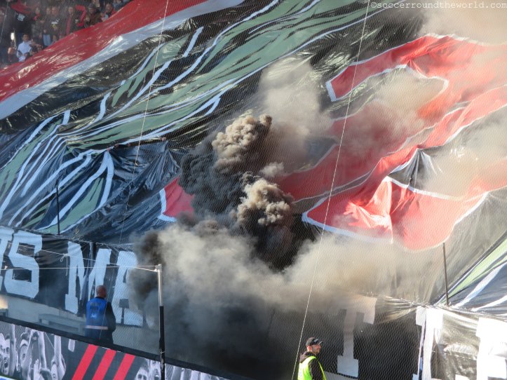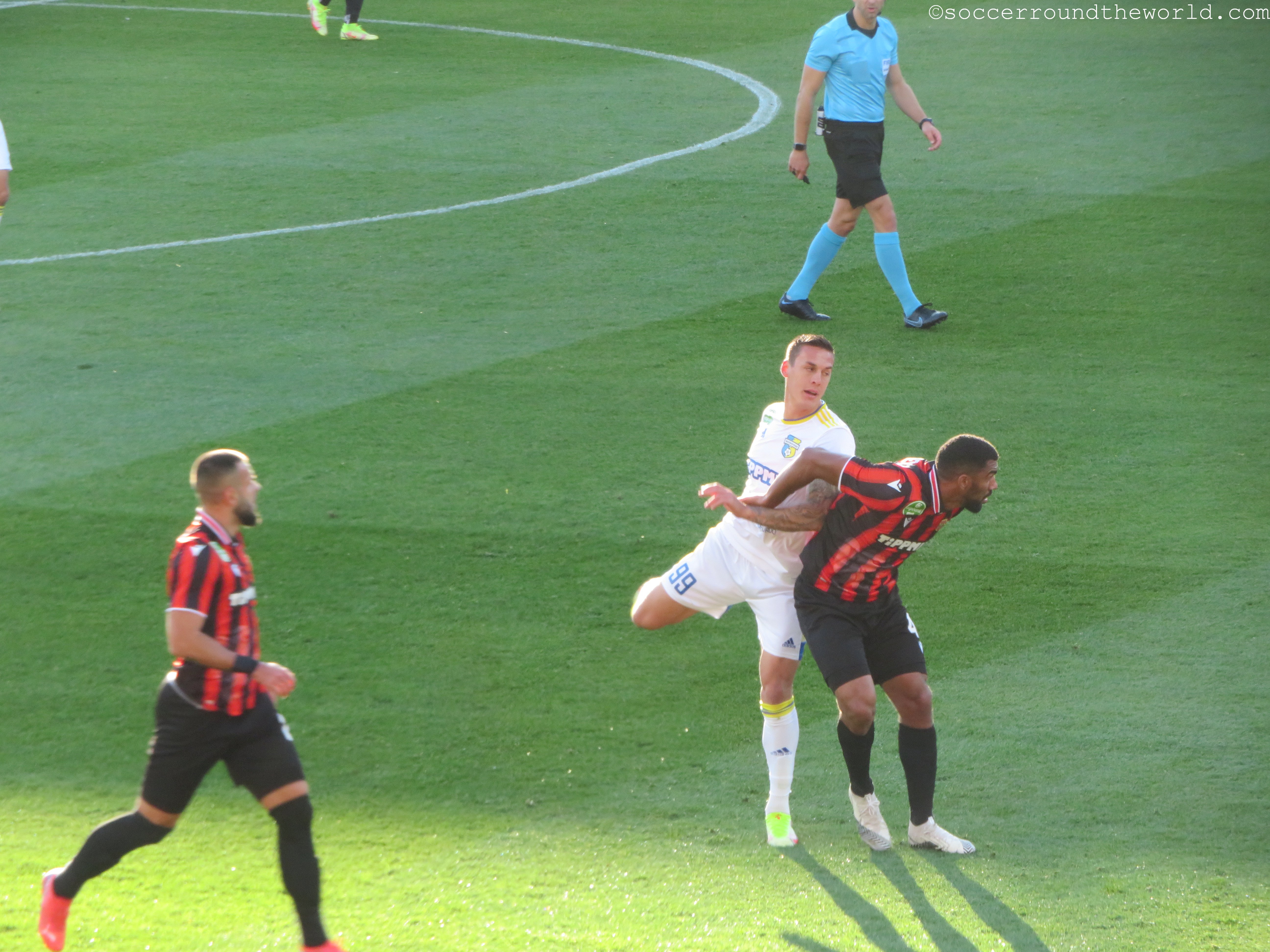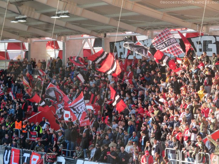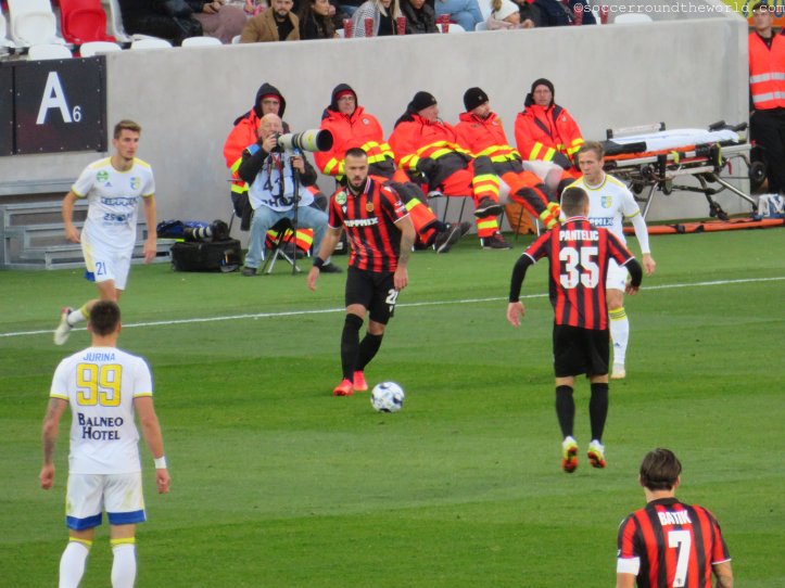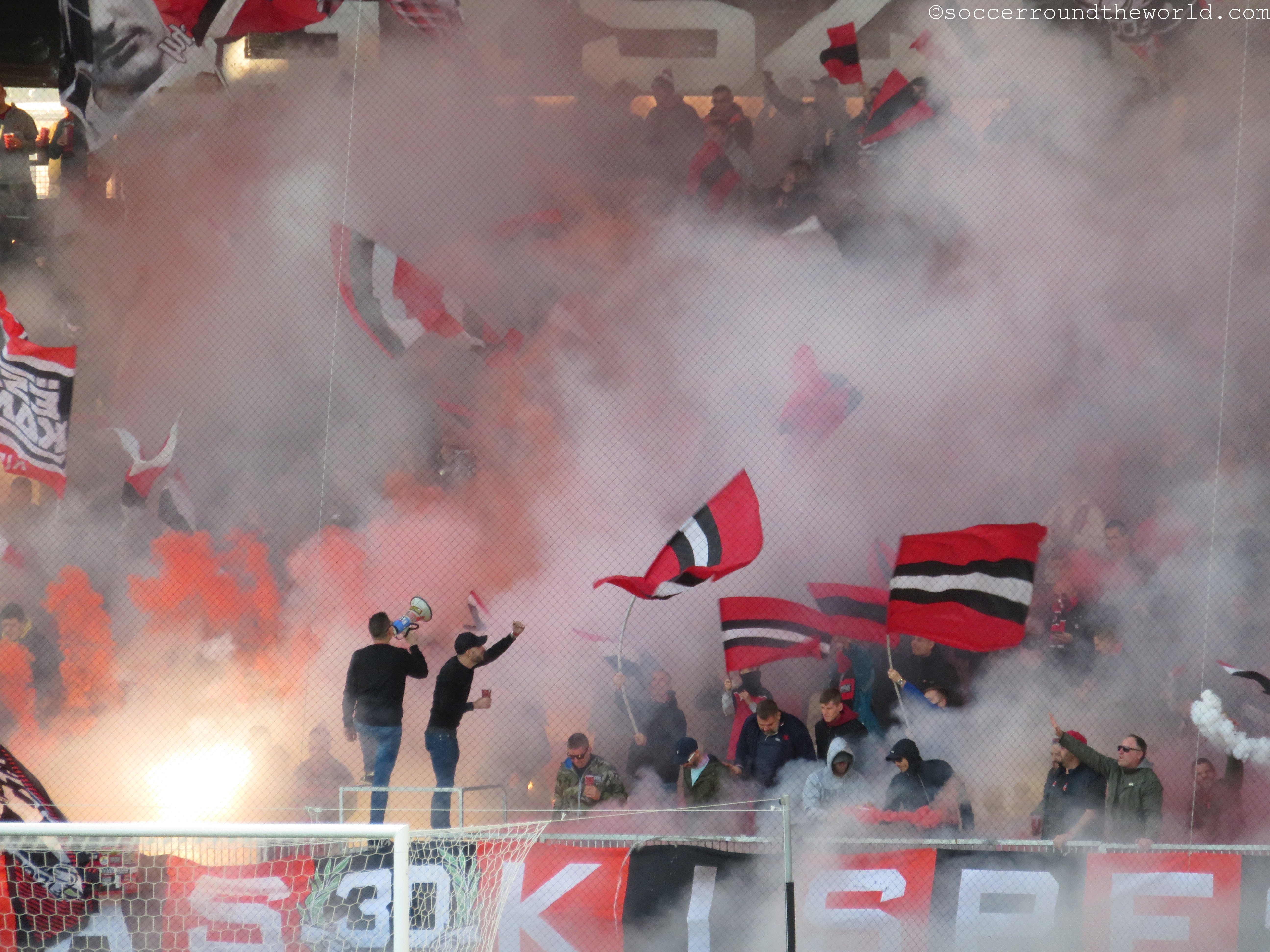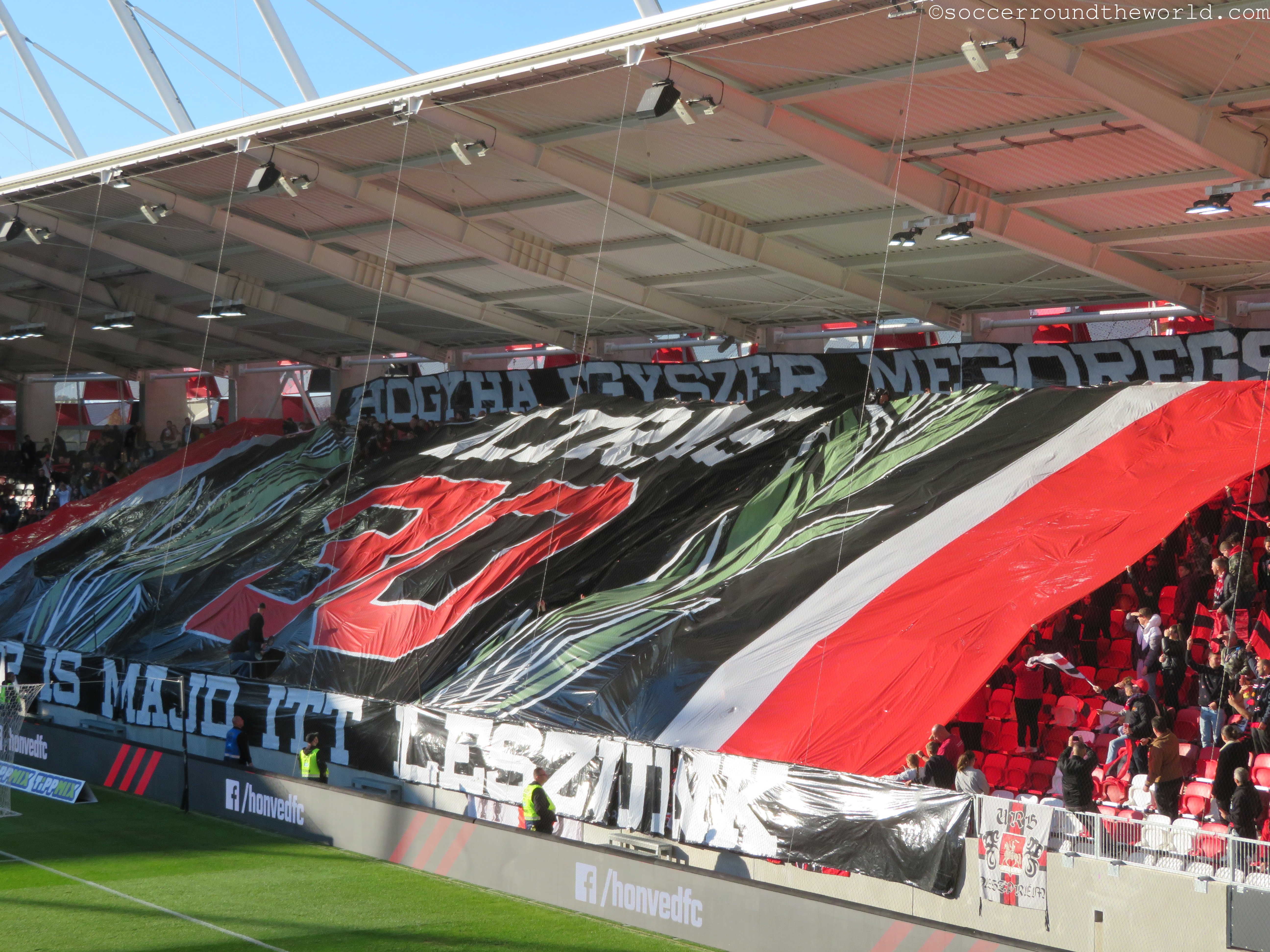 Die Heimfans haben heute das 30-jährige Jubiläum ihrer Ultras-Gruppierung zu feiern, und zelebrieren dies auch mit eigener Choreographie sowie reichlich Rauch und Pyrotechnik. Auf dem Rasen entwickelt sich derweil ein Spiel, das durchaus das Prädikat verrückt verdient: Zwar können die Gäste aus dem nordungarischen Mezökövesd bereits in der 8. Minute in Führung gehen, schwächen sich nur neun Minuten danach allerdings selbst mit einer Roten Karte. Nach zehn Minuten Schockstarre folgt Sturm und Drang von Honved, den die Rot-Schwarzen aber wie durch ein Wunder nicht in Tore ummünzen können. Das 1:0 zur Pause ist somit höchst schmeichelhaft für die Gäste, allerdings ob der erschreckenden Unfähigkeit von Honved auch nicht völlig unverdient.