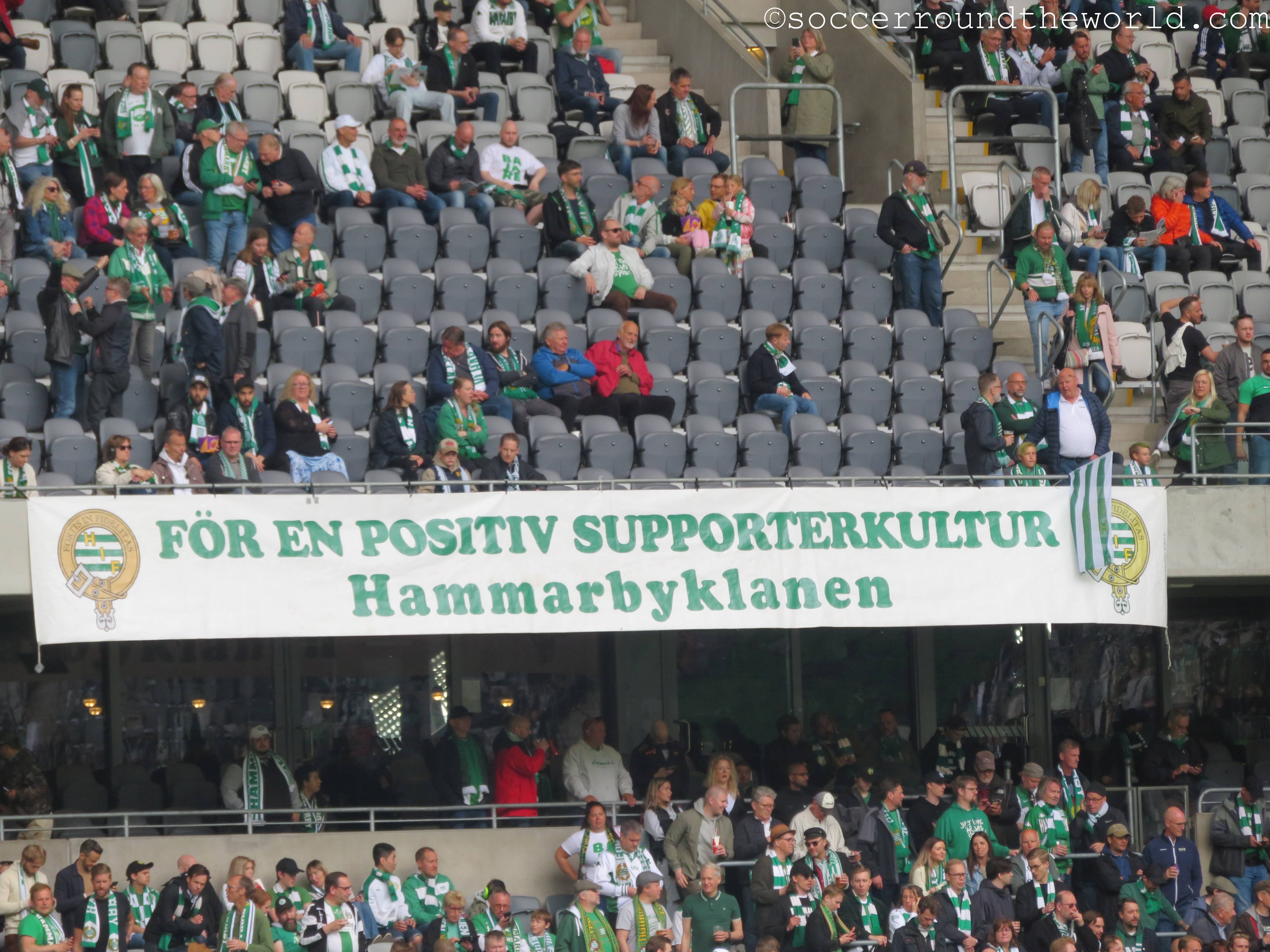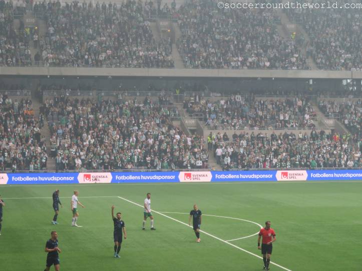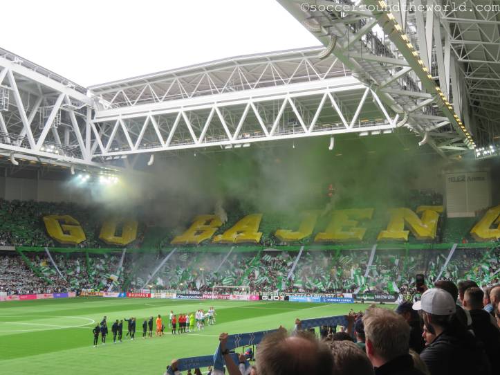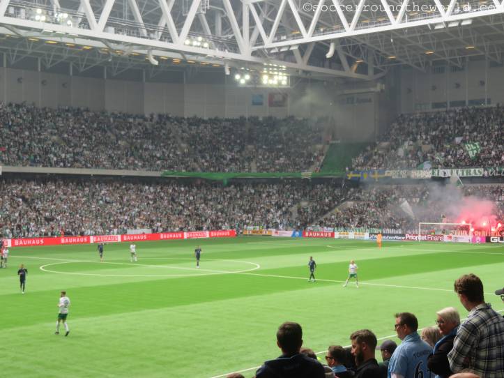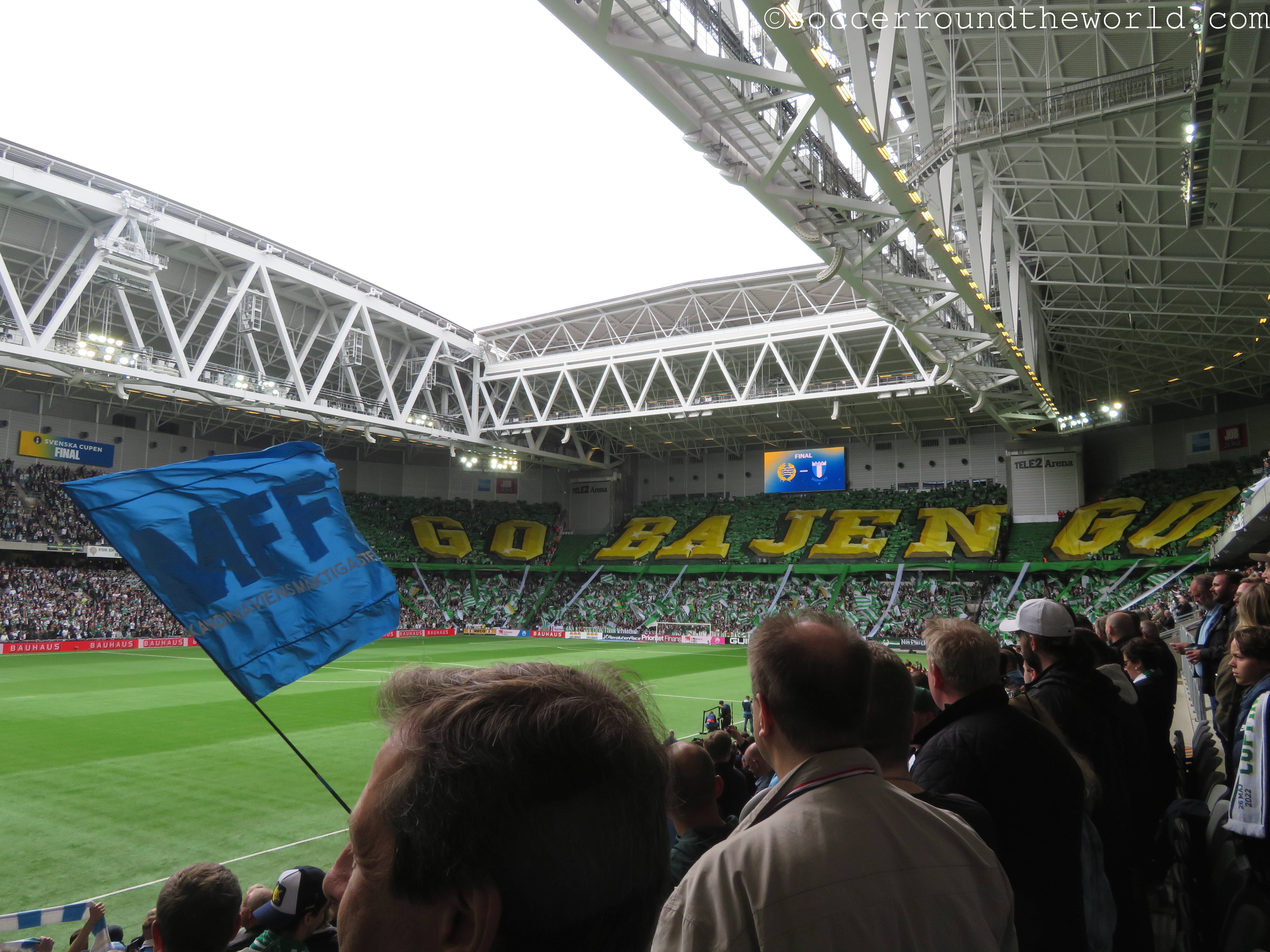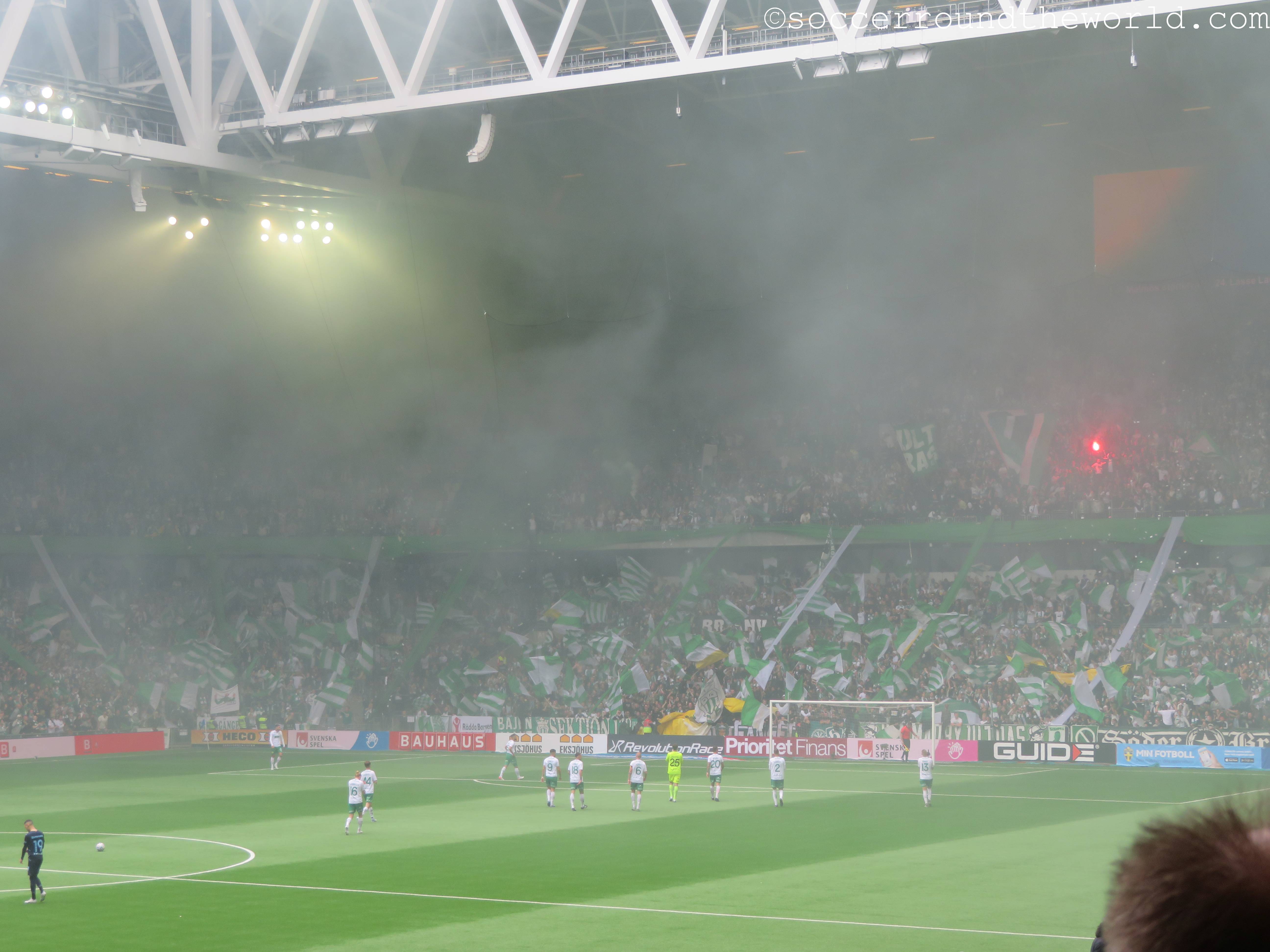 Den Pokal konnten die Grün-Weißen zuletzt – und auch zum ersten Mal – im Vorjahr gewinnen und spielen zudem heute auch noch im Heimstadion, dass sie sich mit dem Lokalrivalen Djurgardens IF teilen. Dadurch wurden ihnen auch mehr als 20.000 der verfügbaren Karten zugesprochen, die innerhalb kürzester Zeit vergriffen waren. Für mich blieb daher „nur“ mehr eines der rund 6.900 Tickets, die Malmö in den Verkauf geben konnte. Und selbst im Sektor der Himmelblauen sitzen nicht gerade wenige Hammarby-Anhänger.