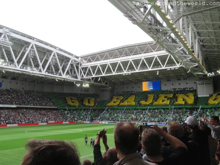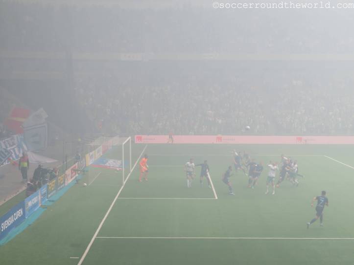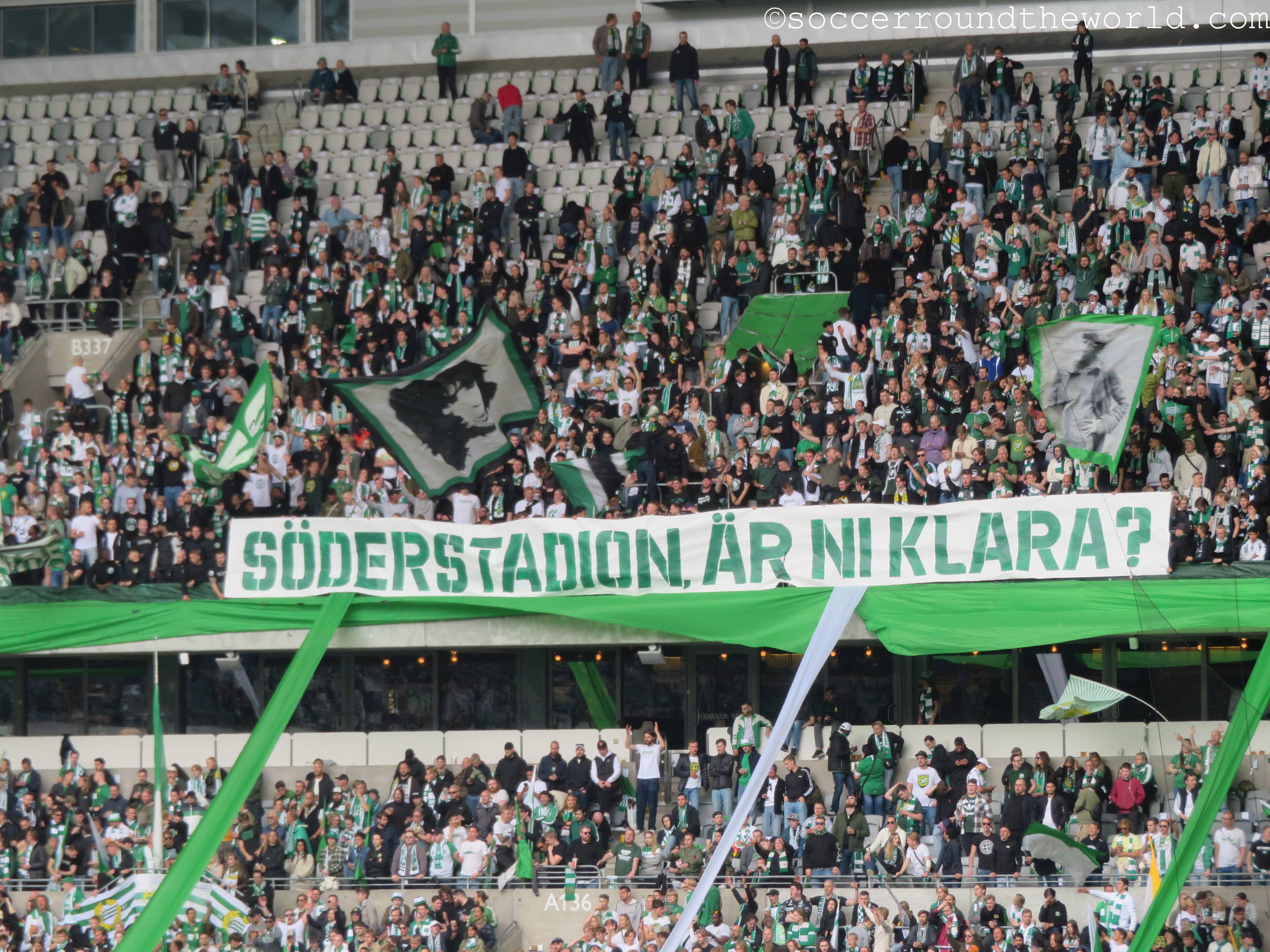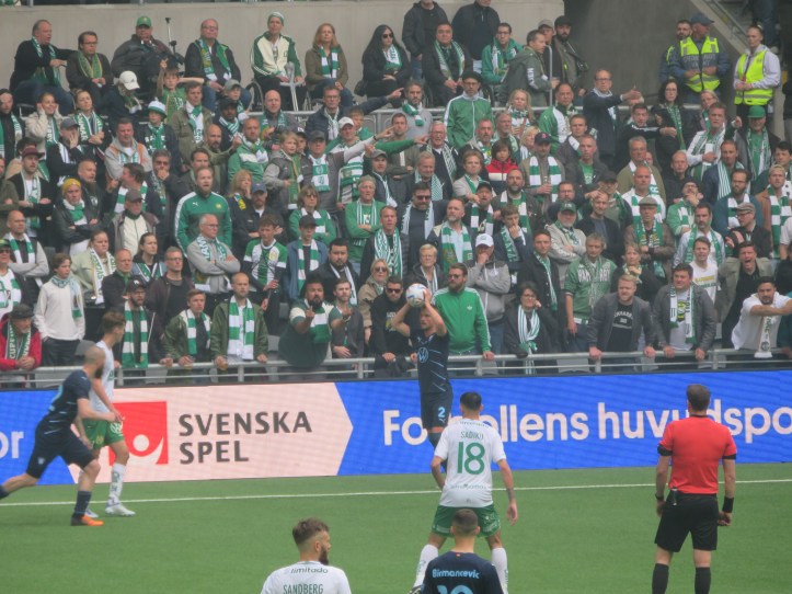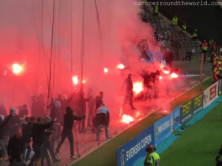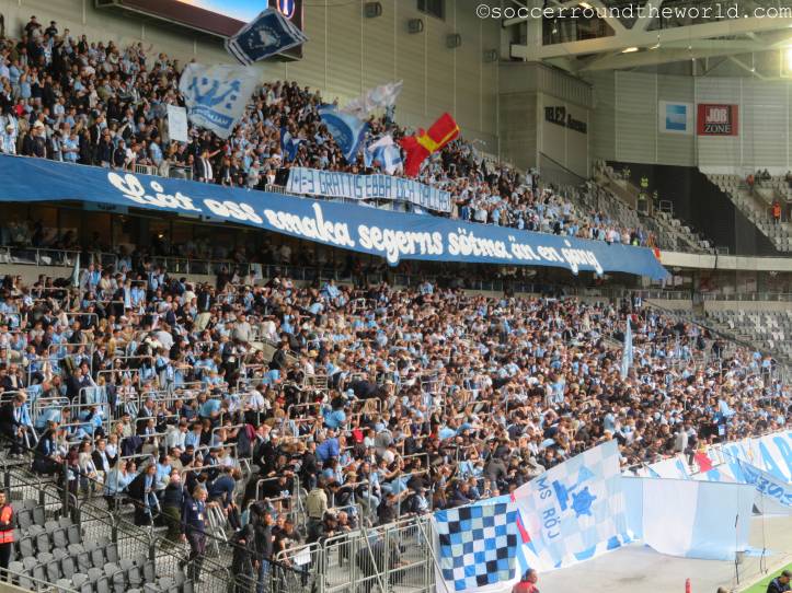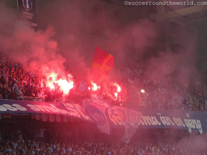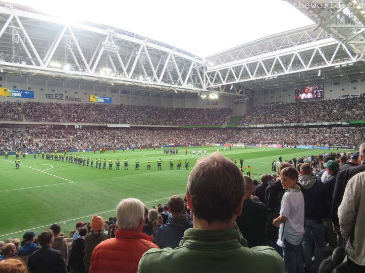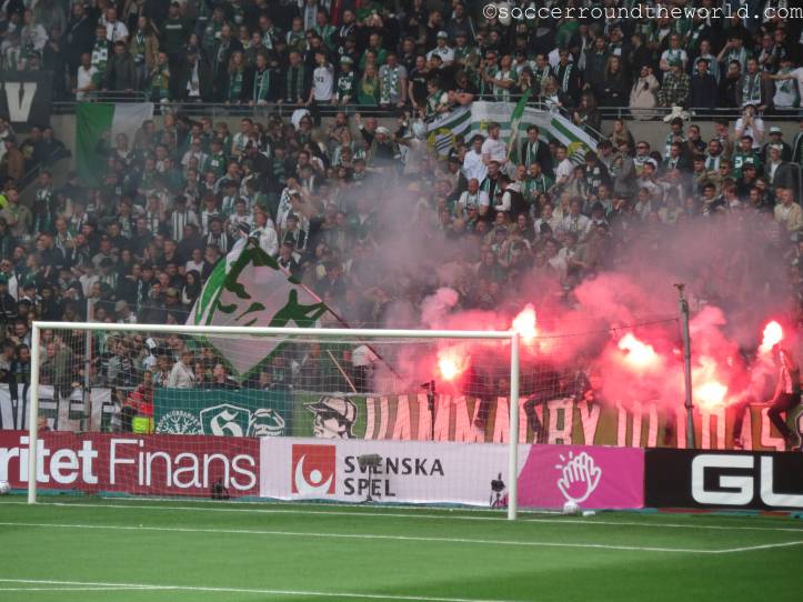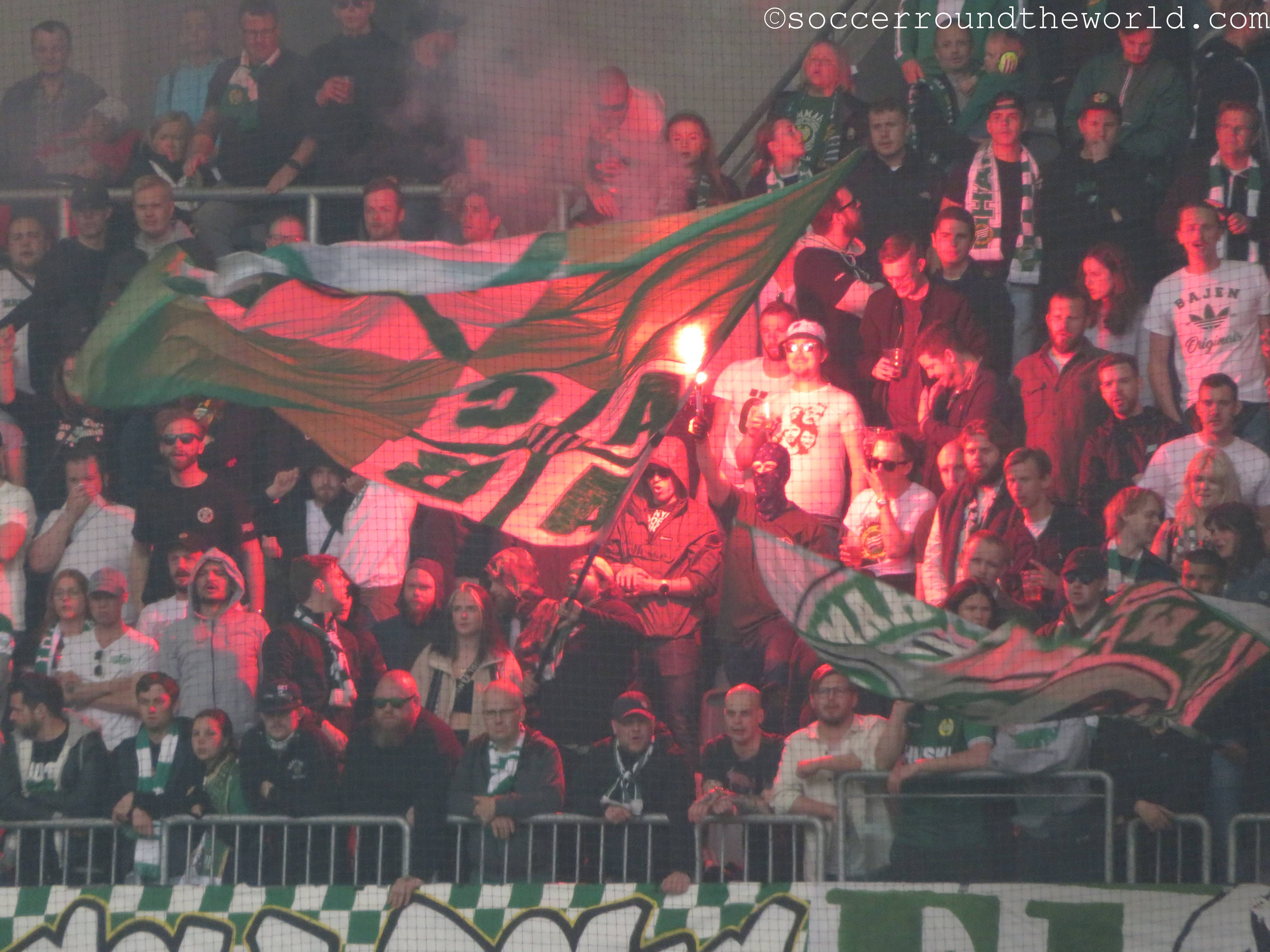Den Pokal konnten die Grün-Weißen zuletzt – und auch zum ersten Mal – im Vorjahr gewinnen und spielen zudem heute auch noch im Heimstadion, dass sie sich mit dem Lokalrivalen Djurgardens IF teilen. Dadurch wurden ihnen auch mehr als 20.000 der verfügbaren Karten zugesprochen, die innerhalb kürzester Zeit vergriffen waren. Für mich blieb daher „nur“ mehr eines der rund 6.900 Tickets, die Malmö in den Verkauf geben konnte. Und selbst im Sektor der Himmelblauen sitzen nicht gerade wenige Hammarby-Anhänger.