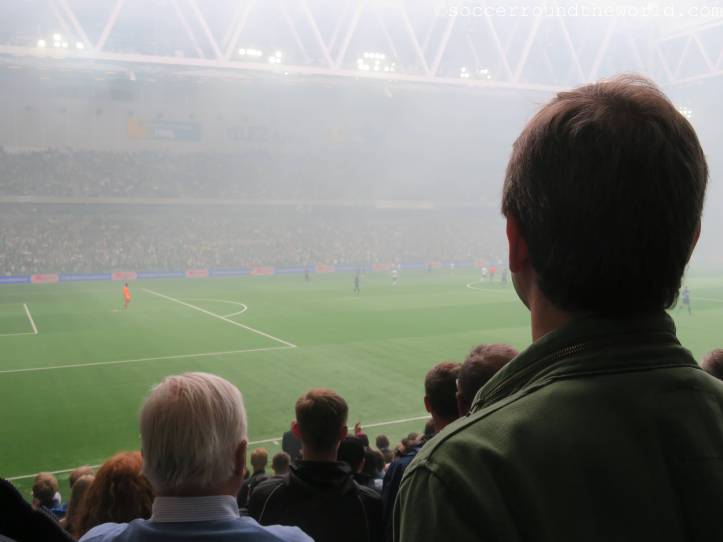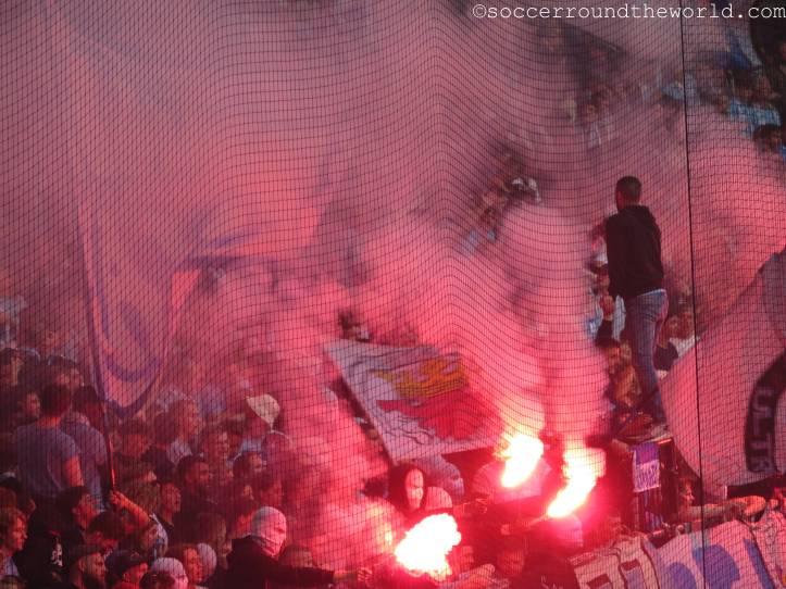 Bereits eine Stunde vor Anpfiff ist die Stimmung in der Arena blendend: Sowohl die Heim- als auch die Auswärtsfans singen sich mit einem erstaunlich kreativem und weitgespannten Repertoire an Liedern für die Partie ein. Beim Einlauf der Mannschaften zündeln beide Fanblöcke derart stark, dass in den ersten 15 Minuten das Spielfeld kaum zu sehen ist. Dem wirklich beeindruckendem Auftritt auf den Rängen können die Teams aber nicht ganz das Wasser reichen.