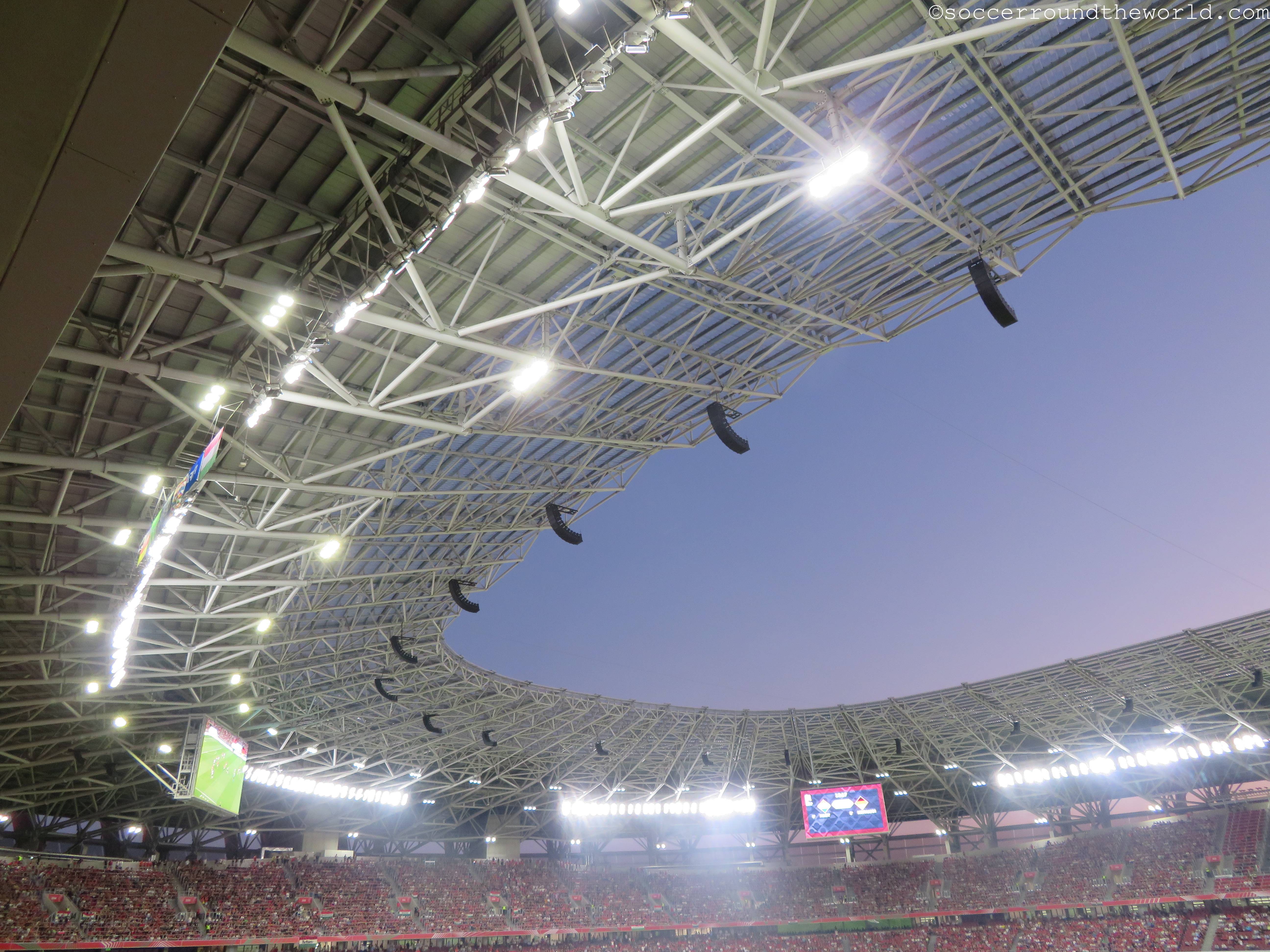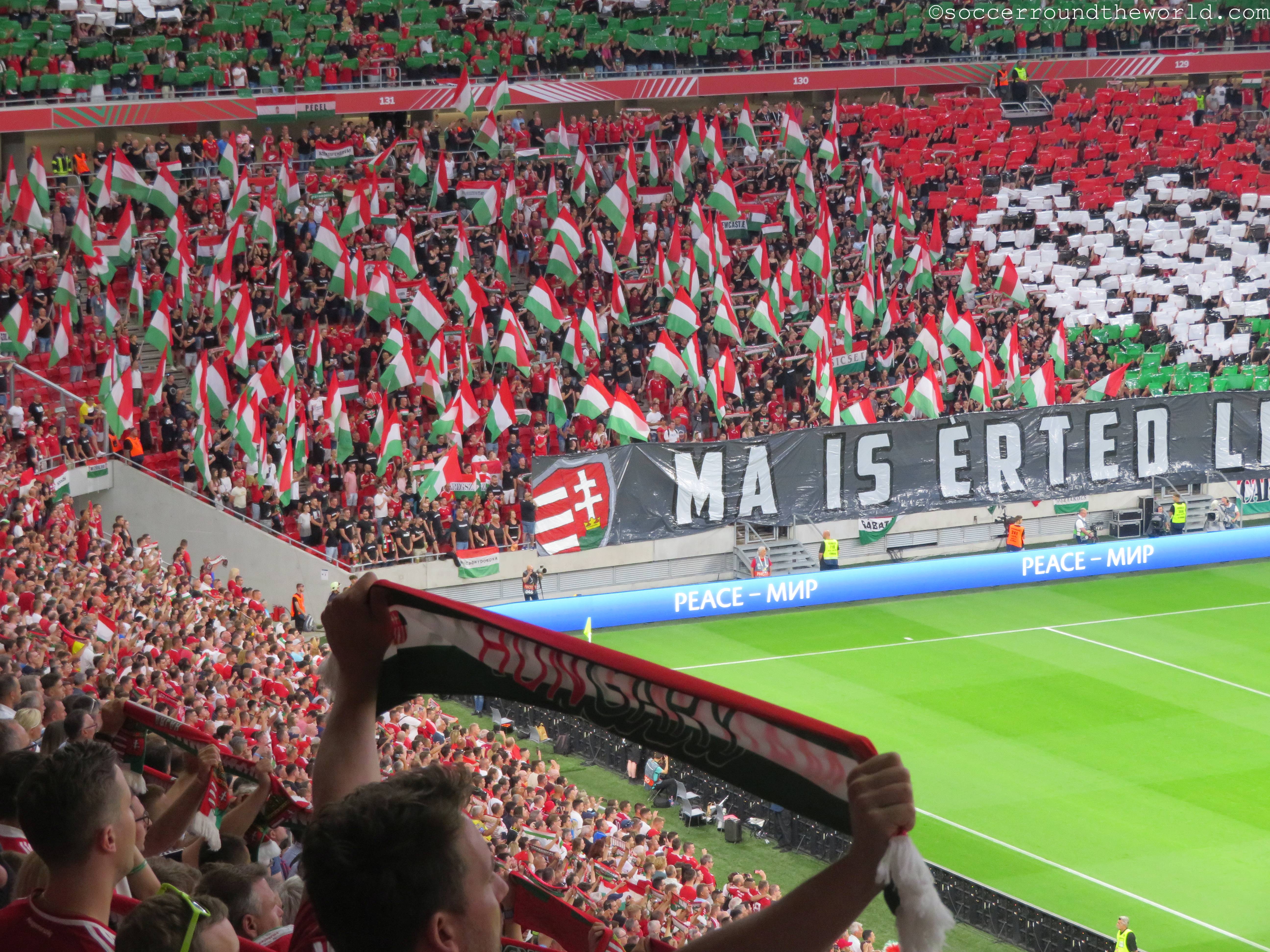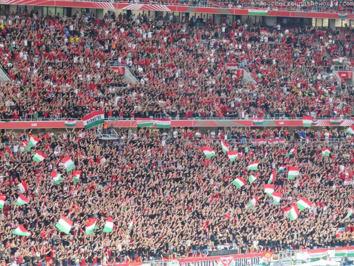 Die Puskas Arena scheint generell über eine sehr gute Akustik zu verfügen: Selbst eine knappe Stunde vor Spielbeginn erzeugen die knapp zu einem Viertel gefüllten Ränge bereits eine sehr annehmbare Stimmung. Den Höhepunkt erreicht diese Entwicklung in der sechsten Minute, als Ungarn nach einem Blitzstart mit 1:0 in Führung geht. Der kurz darauf eingefangene Ausgleich versetzt den zu diesem Zeitpunkt bereits hochfliegenden ungarischen Träumen aber auch gleich wieder einen Dämpfer. Die Charakteristik des Spiels bleibt danach gleich: Phasen mit extrem niedrigem Tempo werden von Sturm-und-Drang-Perioden auf beiden Seiten abgelöst. Bemerkenswert ist dabei, wie sich beide Abwehrreihen bei etwas Gegendruck locker umspielen lassen oder sogar bereitwillig selbst auflösen.