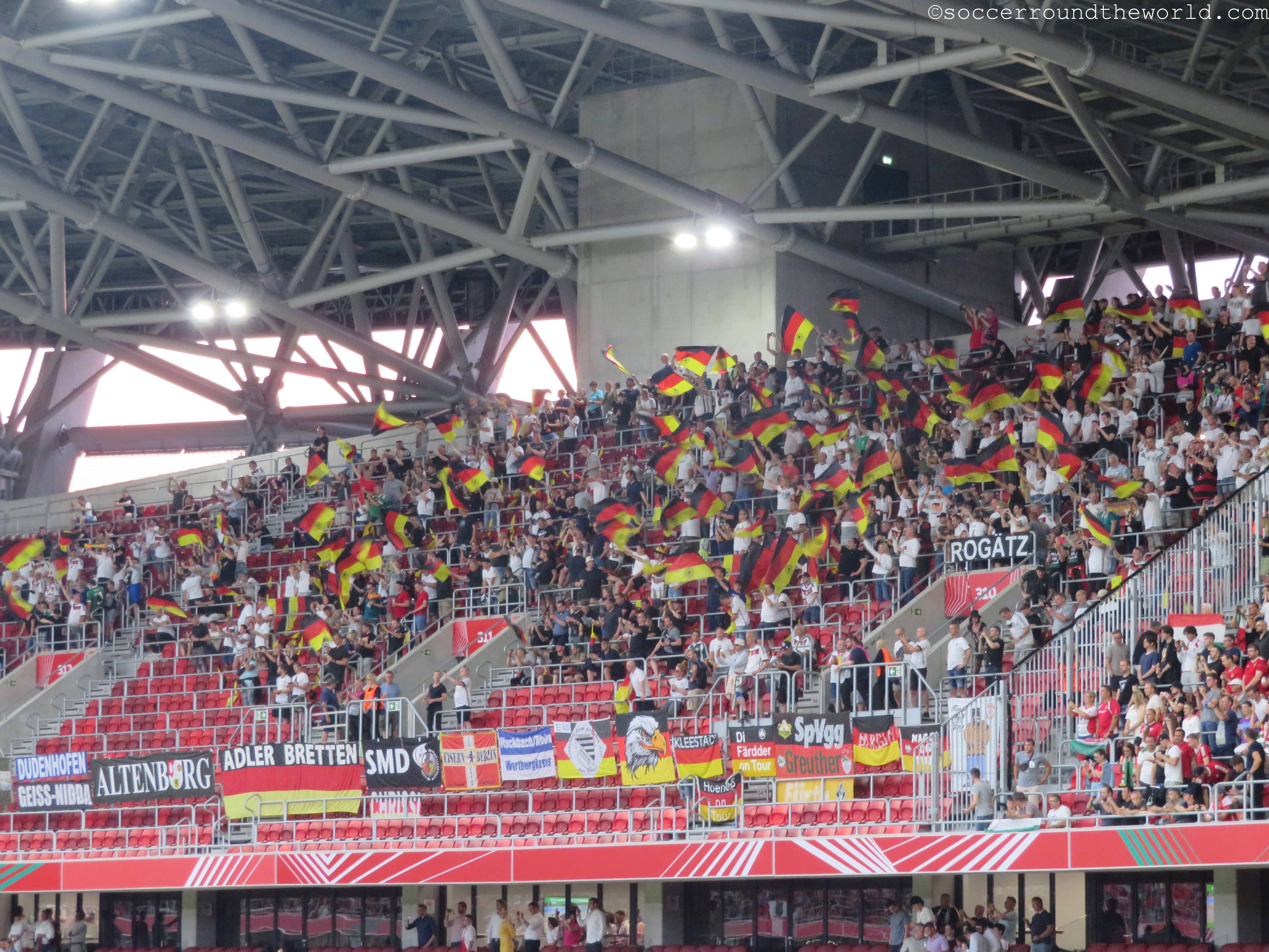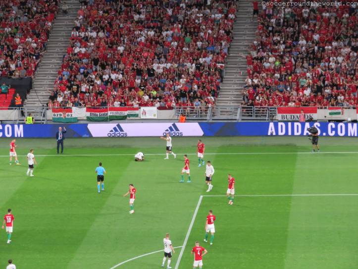 Zuletzt hatte Ungarn wegen rassistischer Ausfälle seiner Fans zum Auftakt dieser Nations-League-Gruppe ein Geisterspiel gegen England aufgebrummt bekommen. Dieses wurde mit einer Ausnahmeregelung umgangen und das Stadion mit Minderjährigen zumindest zur Hälfte gefüllt. Gegen Deutschland findet das Spiel wieder unter „normalen“ Umständen statt, die Auflagen der UEFA dürften aber immerhin soweit Wirkung gezeigt haben, dass die Stimmung als durchwegs gesittet bezeichnet werden kann. Vor dem Match wird in einem Videoaufruf darüber aufgeklärt, dass man weiterhin unter Beobachtung stehe und daher auf gröbere Umgangstöne verzichten solle. Kurz darauf wird sogar der deutschen Bundeshymne Applaus gespendet. Das kommt wohl auch nicht aller Tage vor.