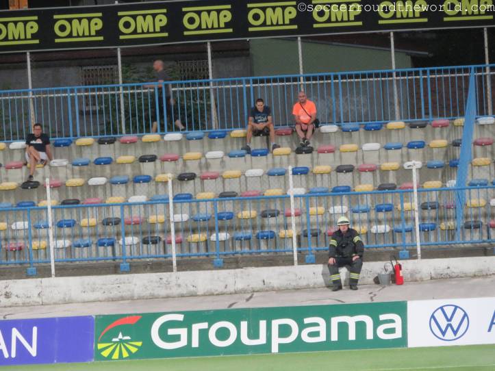Stimmung ist dennoch eher Mangelware, zumindest bis zur ca. 15 Minute, als die Auswärtsanhänger etwas verspätet eintreffen. Von diesem Moment an singen sie eigentlich das gesamte Match durch und werden dafür auch mit dem Führungstreffer ihrer Mannschaft belohnt. Lange Zeit sieht Osijek auch als klarer Sieger der Partie aus, doch nach dem etwas glücklichen Ausgleich in der 80. Minute können die Gastgeber das Spiel doch noch drehen. Erst bei den beiden Treffern ist auch endlich etwas vom heimischen Anhang zu hören.