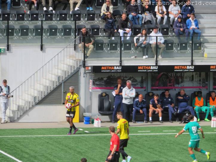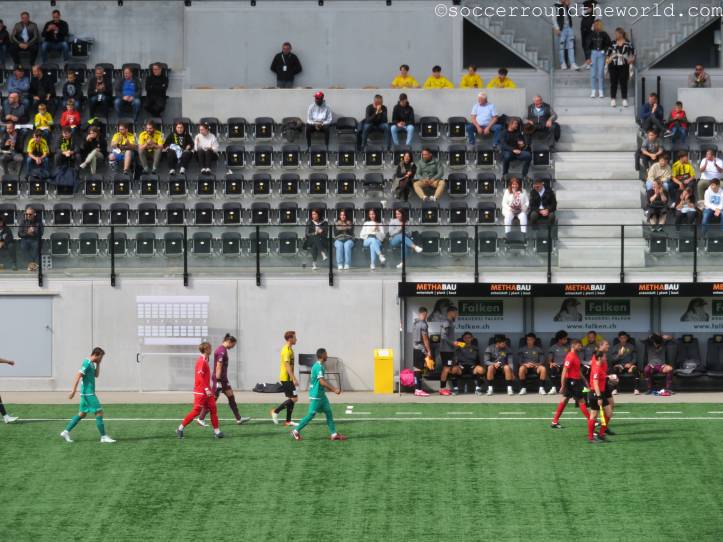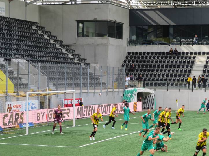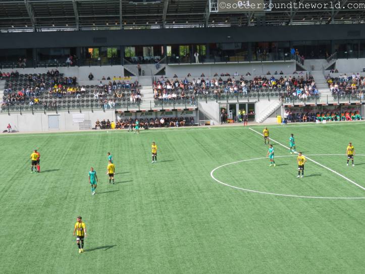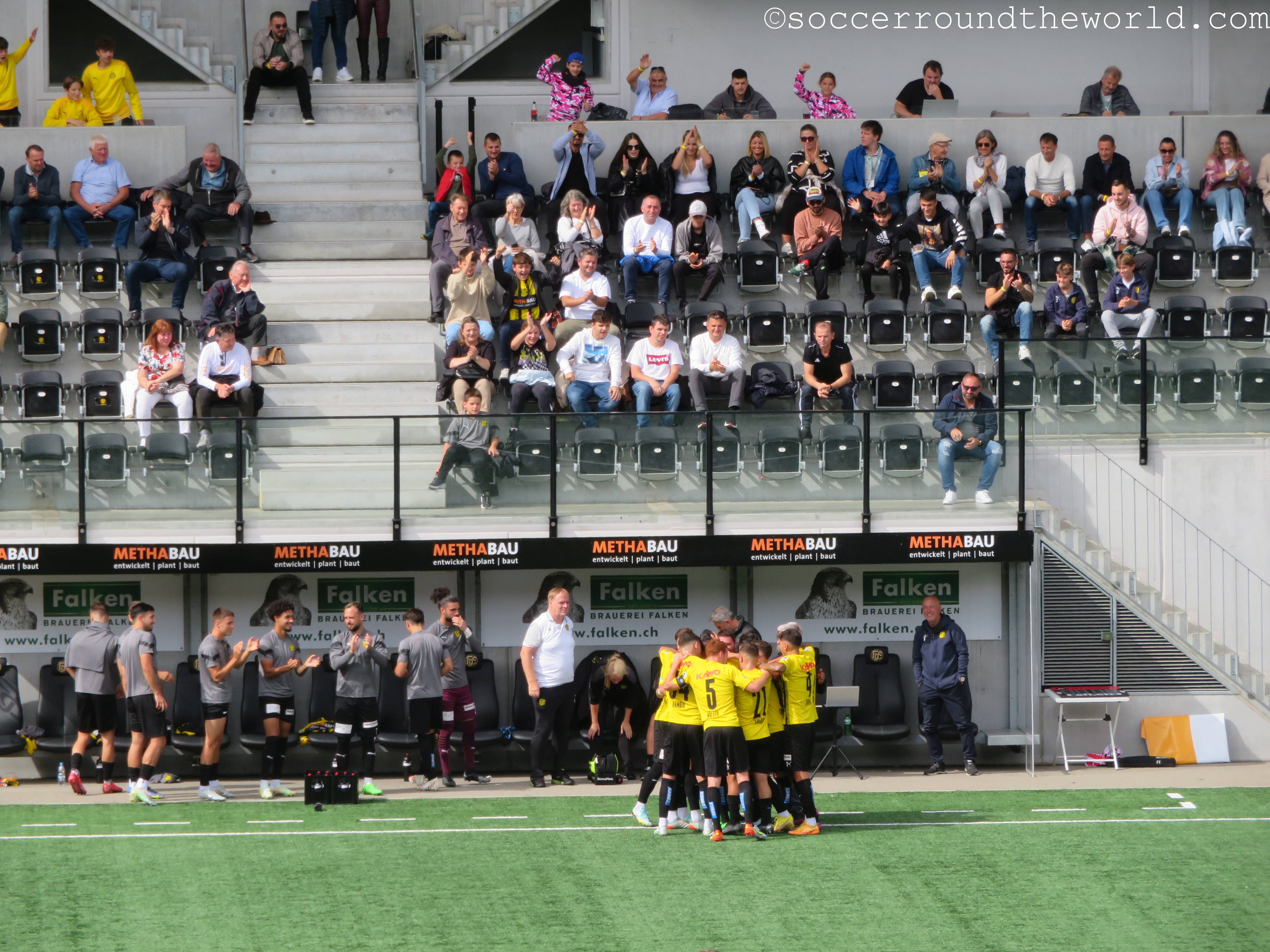 Auf den Rängen sorgen beide Fanlager durchgängig für gute Stimmung, die Fans von Yverdon sind sogar in zwei Sektoren präsent: Einerseits dem offiziellen Fansektor, andererseits haben sich ein paar sing- und trommelstarke Anhänger auch auf der Haupttribüne eingefunden. Über die insgesamt doch sehr schüttere Kulisse im 8.000er-Stadion kann das aber freilich nicht hinwegtäuschen.