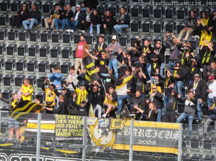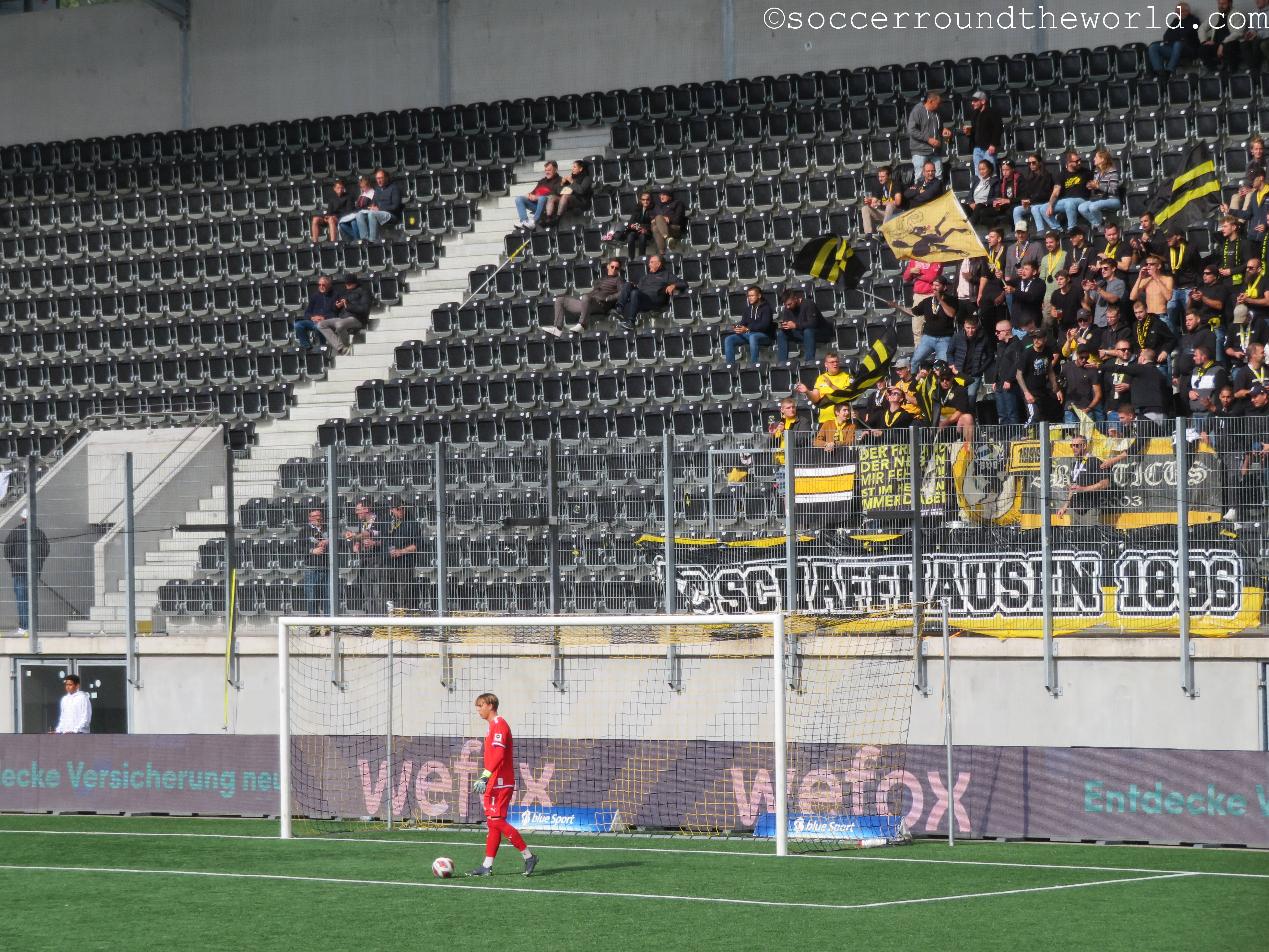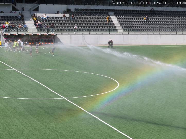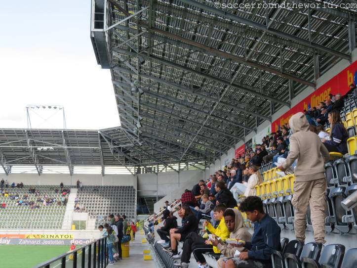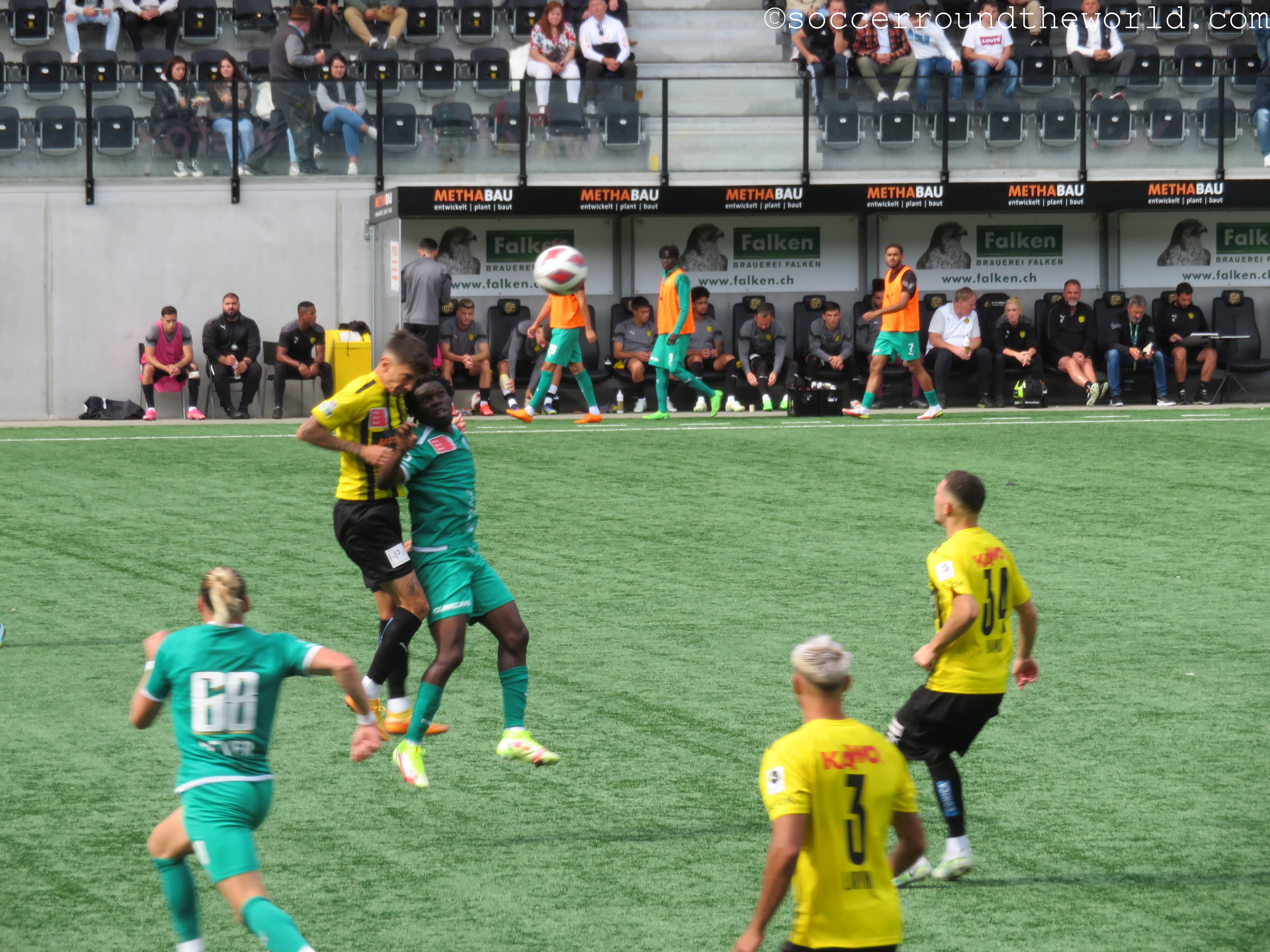 Auf den Rängen sorgen beide Fanlager durchgängig für gute Stimmung, die Fans von Yverdon sind sogar in zwei Sektoren präsent: Einerseits dem offiziellen Fansektor, andererseits haben sich ein paar sing- und trommelstarke Anhänger auch auf der Haupttribüne eingefunden. Über die insgesamt doch sehr schüttere Kulisse im 8.000er-Stadion kann das aber freilich nicht hinwegtäuschen.
