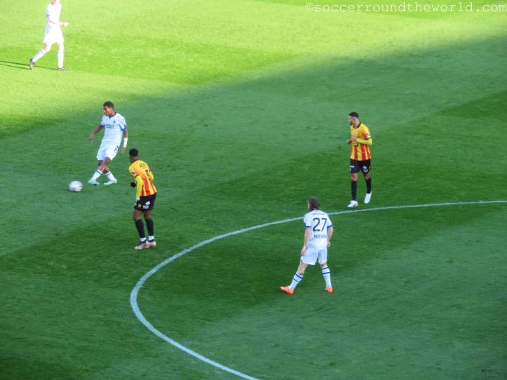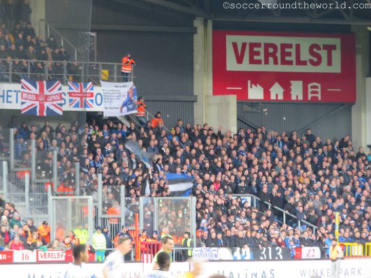 Das Hassobjekt des heutigen Tages haben die Fans relativ rasch ausgemacht: Als der Brügge-Spieler mit der Nummer 10, Noa Lang, in der 16. Minute einen Elfmeter zum 0:1 für die Gäste verwandelt und dann auch noch provokant vor dem Heimsektor posiert, ist ihm die gesamte Zuwendung für die restliche Spielzeit garantiert. Ihn selbst scheint es aber relativ wenig zu stören, denn vier Minuten später trifft er noch zum 2:0 und auch sonst fällt er durchgängig mit Handlungen auf, welche die Heimfans in Rage bringen. Vom Heimteam ist hingegen über die gesamten 90 Minuten erschreckend wenig zu sehen. Der Sieg für die Gäste aus Brügge geht auch in der Höhe vollkommen in Ordnung.