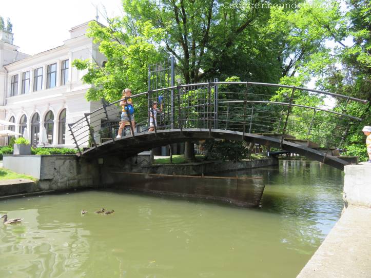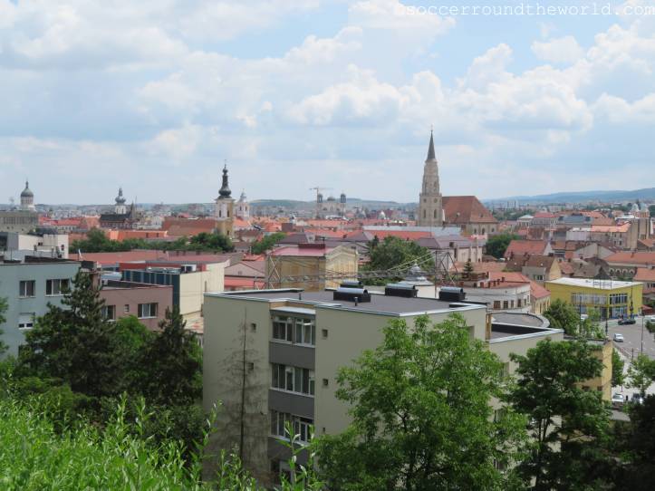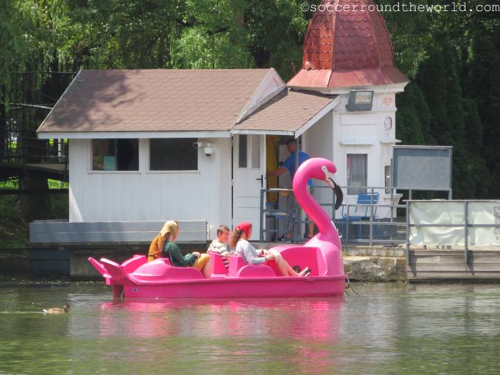 Die Distanz zwischen beiden Stadien legten wir bereits untertags einmal zurück, und wirkt auf der Karte gar nicht so weit. Jedoch liegt ein nicht zu unterschätzender Hügel dazwischen, der immerhin eine gute Aussicht auf die Altstadt gewährt. Die modernere Arena von Cluj liegt dann am Ausläufer eines schön angelegten Stadtparks, der vor allem in der Hitze des Tages gute Abkühlungsdienste leistete und in dem Flamingo-Tretboote bei der Arbeit bewundert werden konnten.