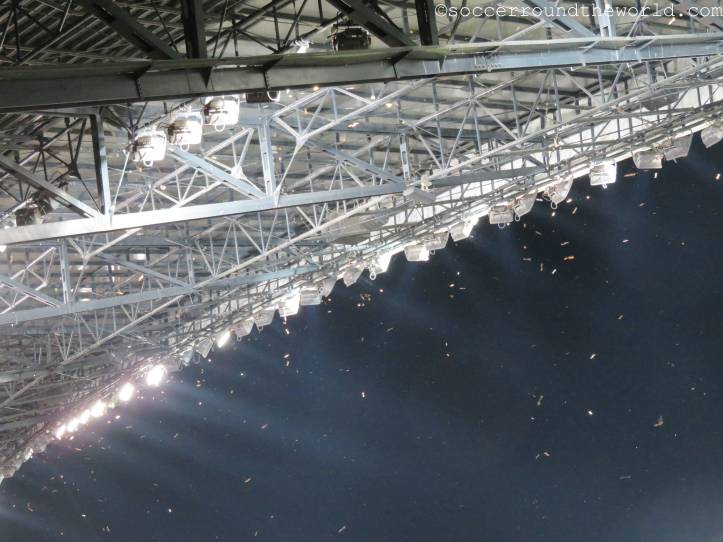 Der höhere Andrang zu diesem Spiel ist schon zu merken, als wir rund eine halbe Stunde vor Anpfiff an den äußeren Toren ankommen. Die langen Schlangen vor den „Gates“ sind allerdings vor allem auch darauf zurückzuführen, dass die OrdnerInnen etwas überfordert wirken. Bald wird hier nur mehr auf kurzes Abtasten und dann Durchwinken umgestellt.