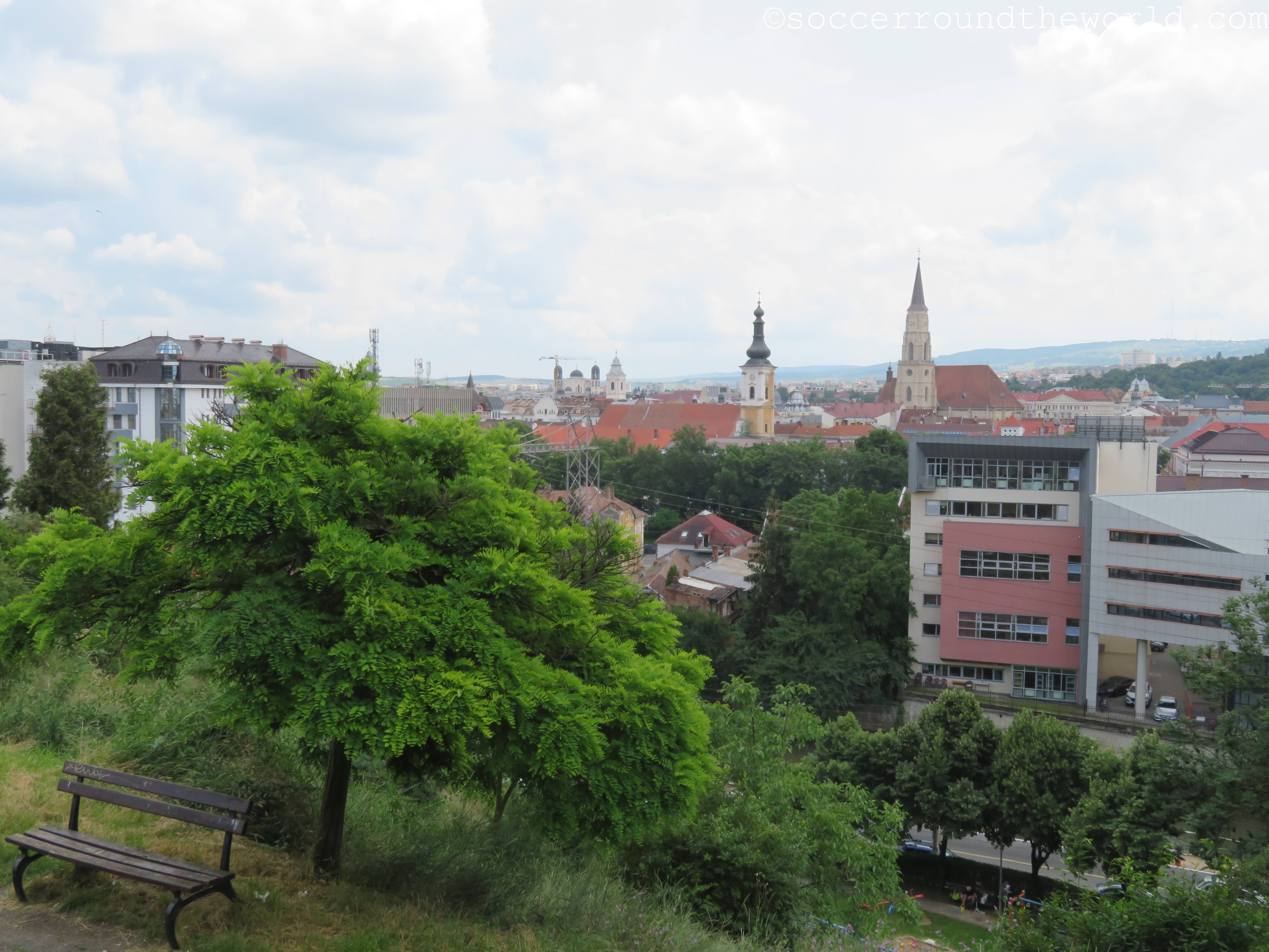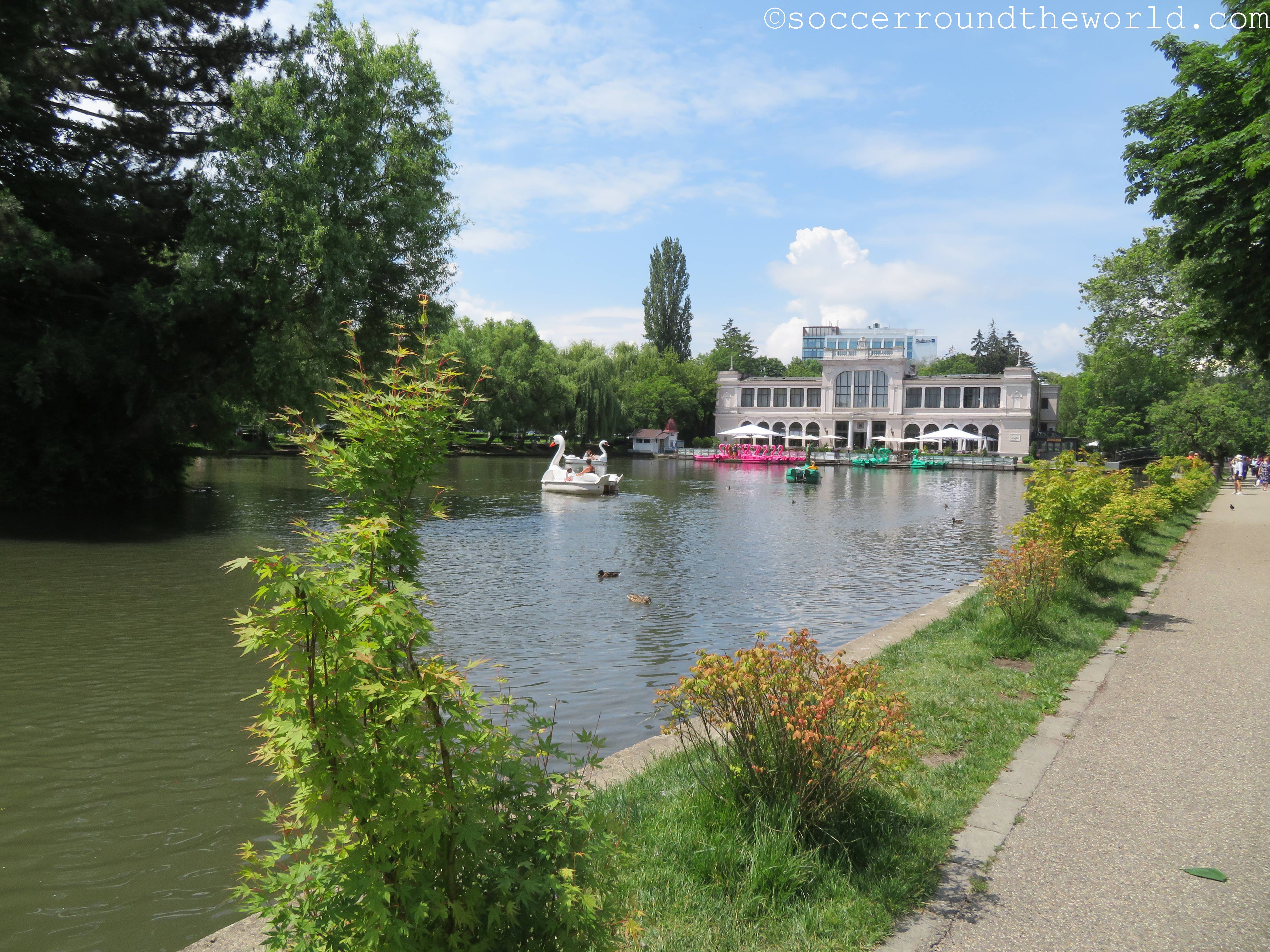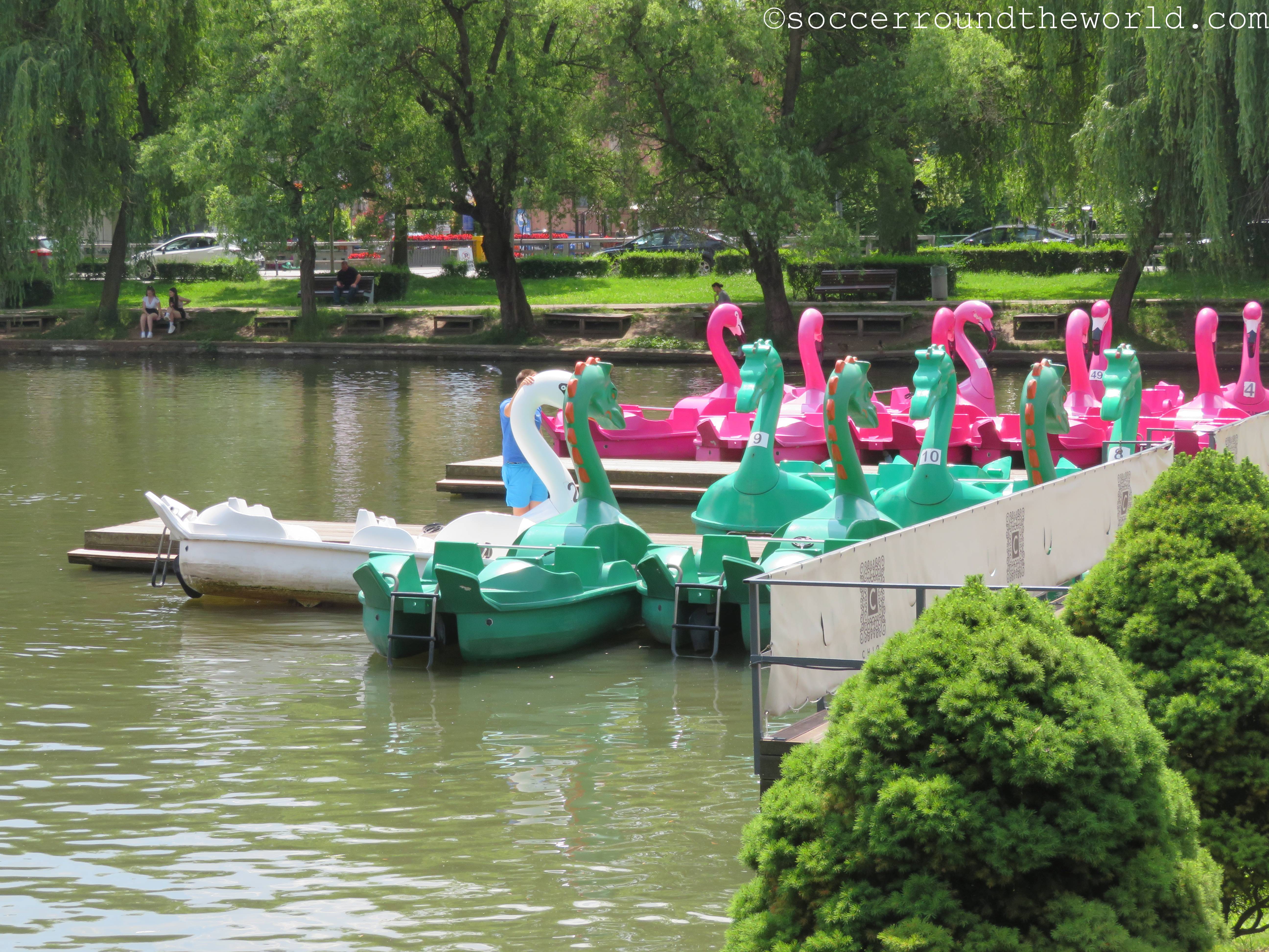 Die Distanz zwischen beiden Stadien legten wir bereits untertags einmal zurück, und wirkt auf der Karte gar nicht so weit. Jedoch liegt ein nicht zu unterschätzender Hügel dazwischen, der immerhin eine gute Aussicht auf die Altstadt gewährt. Die modernere Arena von Cluj liegt dann am Ausläufer eines schön angelegten Stadtparks, der vor allem in der Hitze des Tages gute Abkühlungsdienste leistete und in dem Flamingo-Tretboote bei der Arbeit bewundert werden konnten.