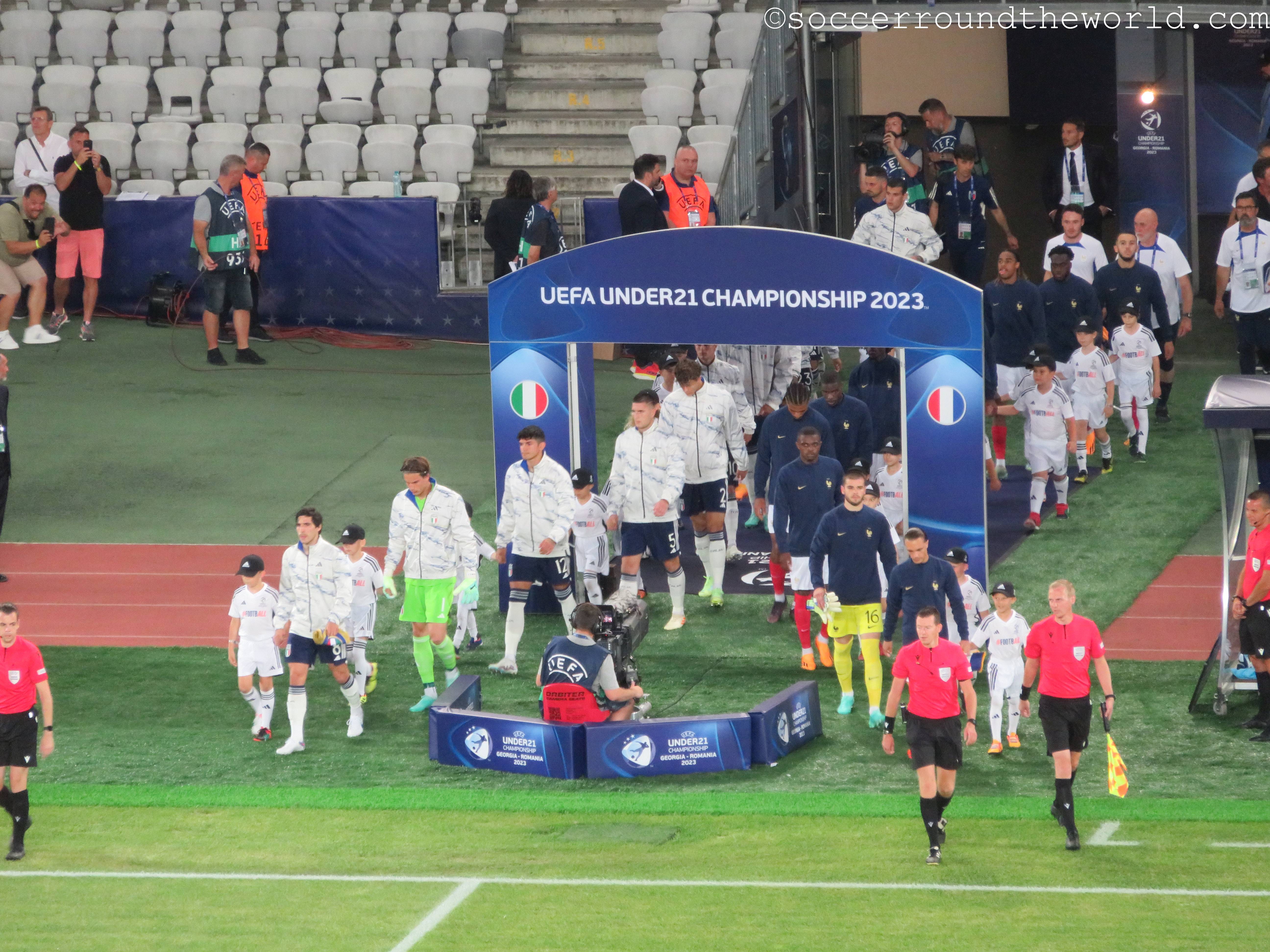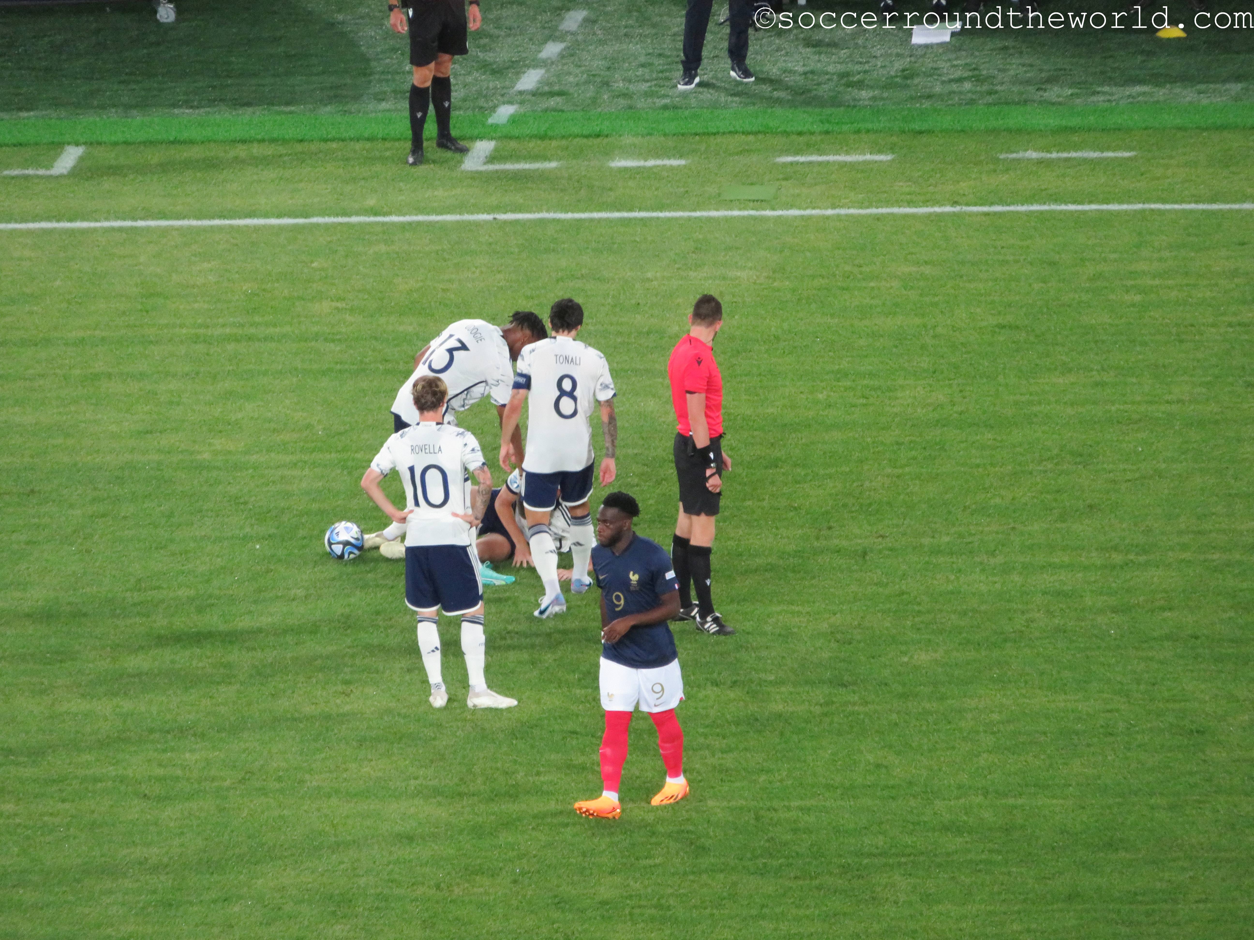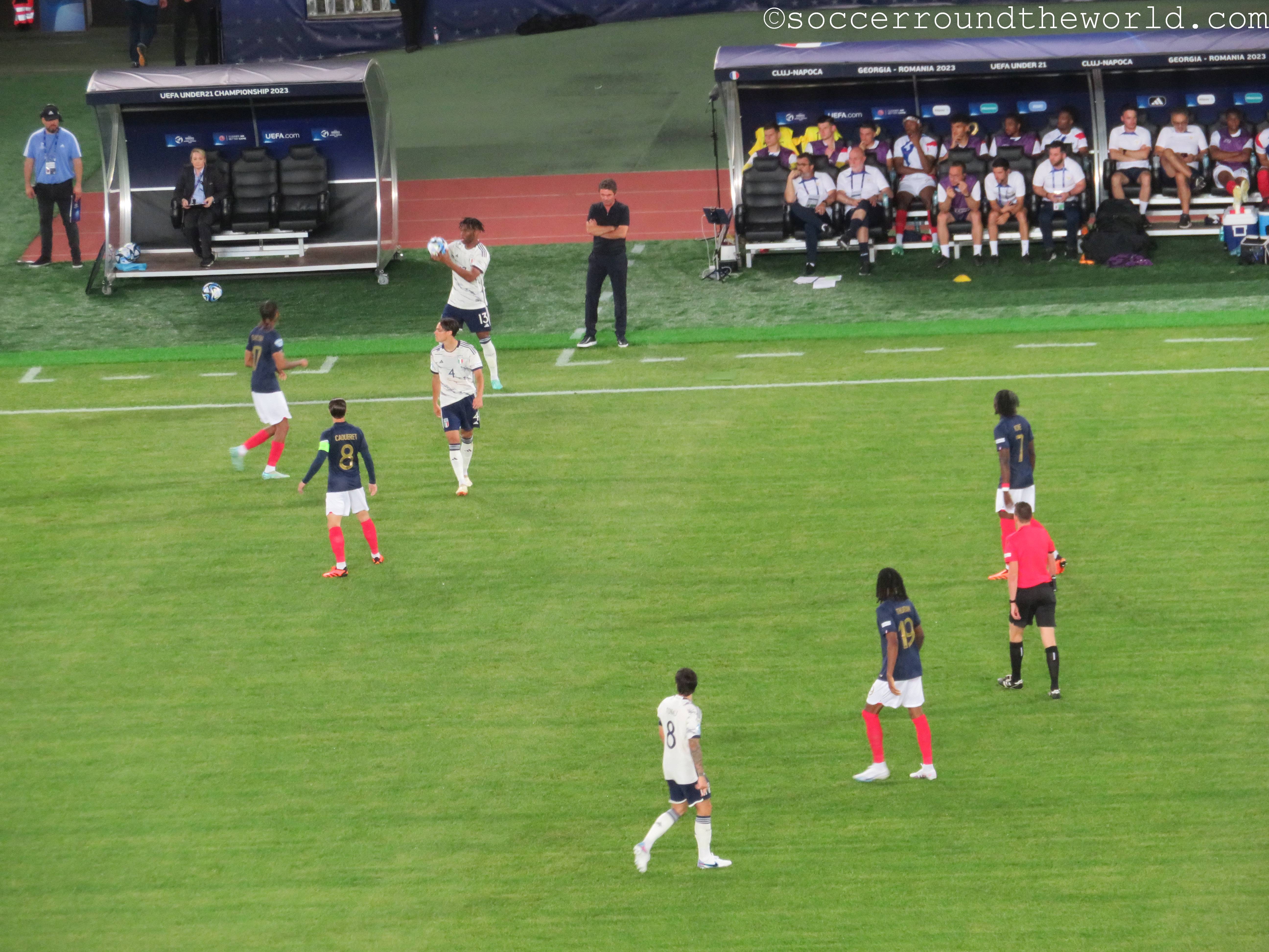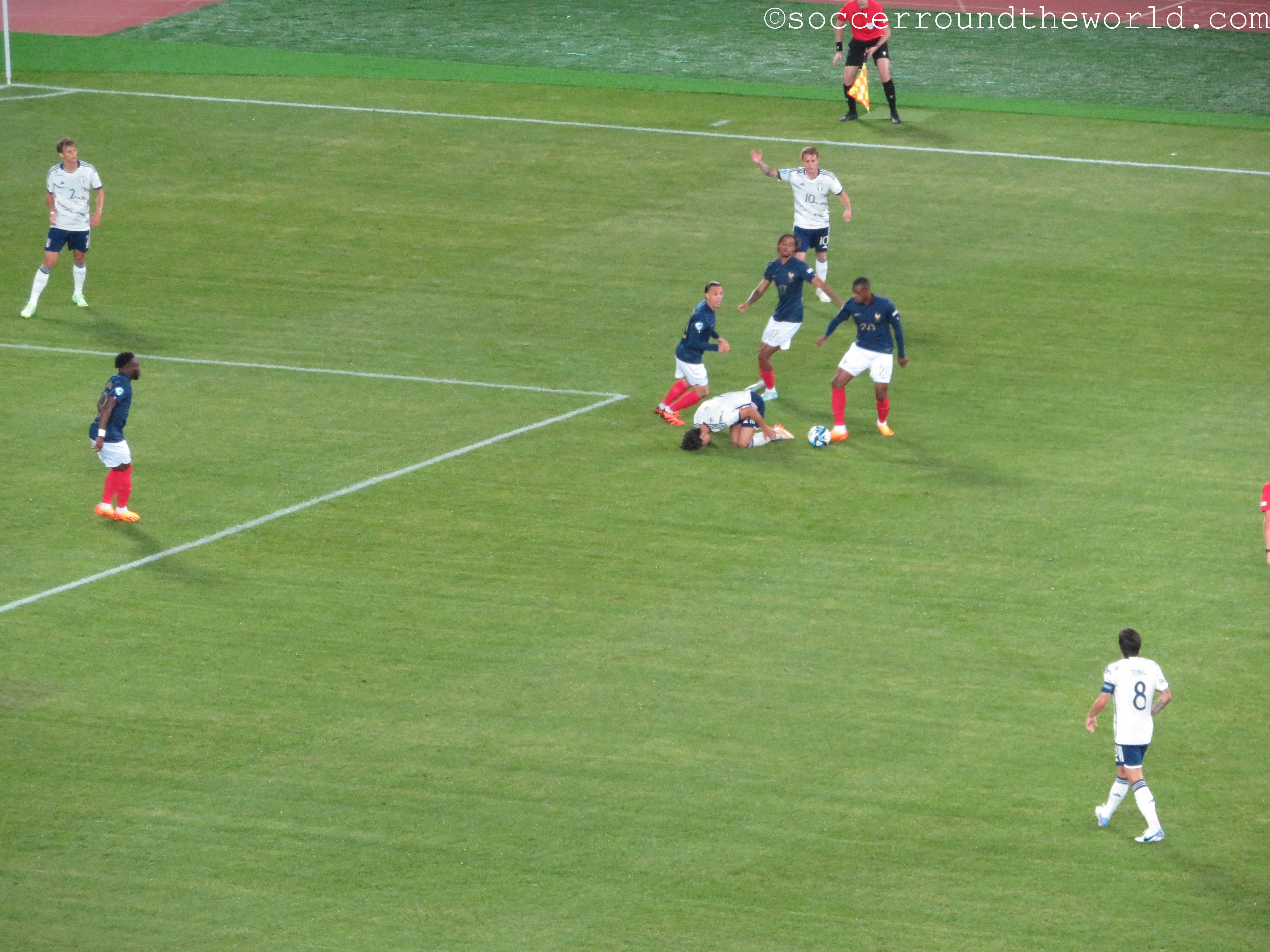 In manchen Winkeln der Arena sind auch deklarierte Anhänger von „Les Bleus“ auszumachen, der Rest besteht aber offenbar aus Neutralen. Diese entscheiden sich auch über die gesamten 90 Minuten nicht wirklich für eine der beiden Mannschaften, sondern jubeln und leiden mit dem Spielverlauf mit. Eine abwechslungsreiche erste Halbzeit bringt je ein Tor auf beiden Seiten, was von den Rängen durchaus mit Wohlwollen goutiert wird. Die zweite Hälfte sieht lange nach einem klassischen Halten des Ergebnisses aus, bis ein kapitaler Abwehrfehler der Italiener den Franzosen doch noch das 2:1 ermöglicht. Die erst spät einsetzende Schlussoffensive bringt außer dem aberkannten vermeintlichen Ausgleich nichts mehr ein.