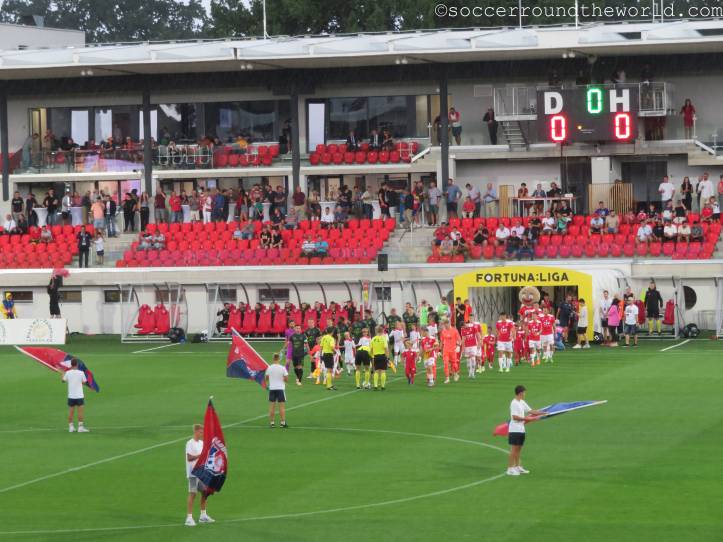 War der Tag in der Stadt noch schwül, teils bedeckt, aber trocken, so öffnen sich pünktlich mit dem Anpfiff die Himmelsschleusen. Mächtiger Wind und große Wassermassen machen die ersten Minuten auf dem Platz sichtlich ziemlich unwirtlich, doch diese Situation hält zum Glück nicht lange an. Nach gut 15 Minuten wird der Regen immer schwächer, dafür erhitzt sich die Gemütslage auf dem Spielfeld: Der heimische Torhüter erhält nach knapp 20 Minuten die Rote Karte und muss vom Platz. Ein Geschenk, dass die Gäste aus Jablonec allerdings nicht annehmen können.