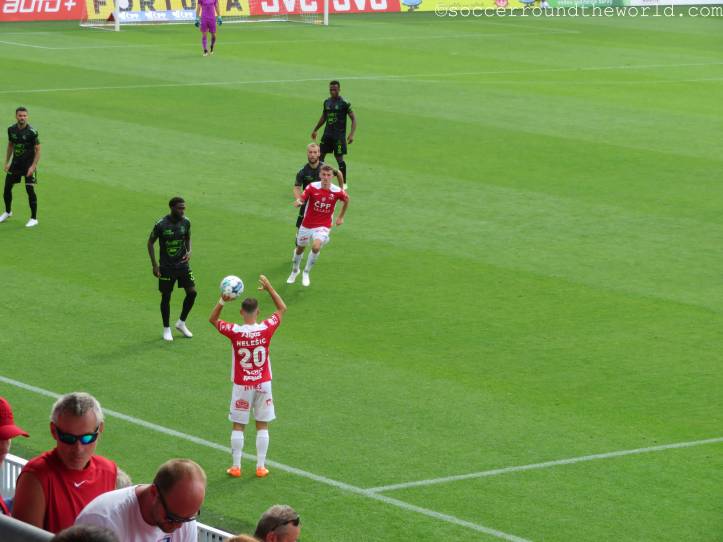 Wesentlich unbarmherziger ist hingegen Klubmaskottchen Pernicek, dessen Name mich erst auf die Spur bringt, dass es sich bei ihm um einen Lebkuchenmann handeln soll. Alles zwischen Kartoffel und Atomunfall hätte mich auch nicht wirklich überrascht… In der Halbzeitpause schießt das verunglückte Keks T-Shirts in die Zuschauerränge und posiert dann in den zweiten 45 Minuten mit all jenen Kindern, die den Mut aufbringen, sich dem lachenden Ungetüm auf mehr als zwei Meter zu nähern. Manche Maskottchen hätten das Planungsstudio schlicht und einfach nicht verlassen sollen.