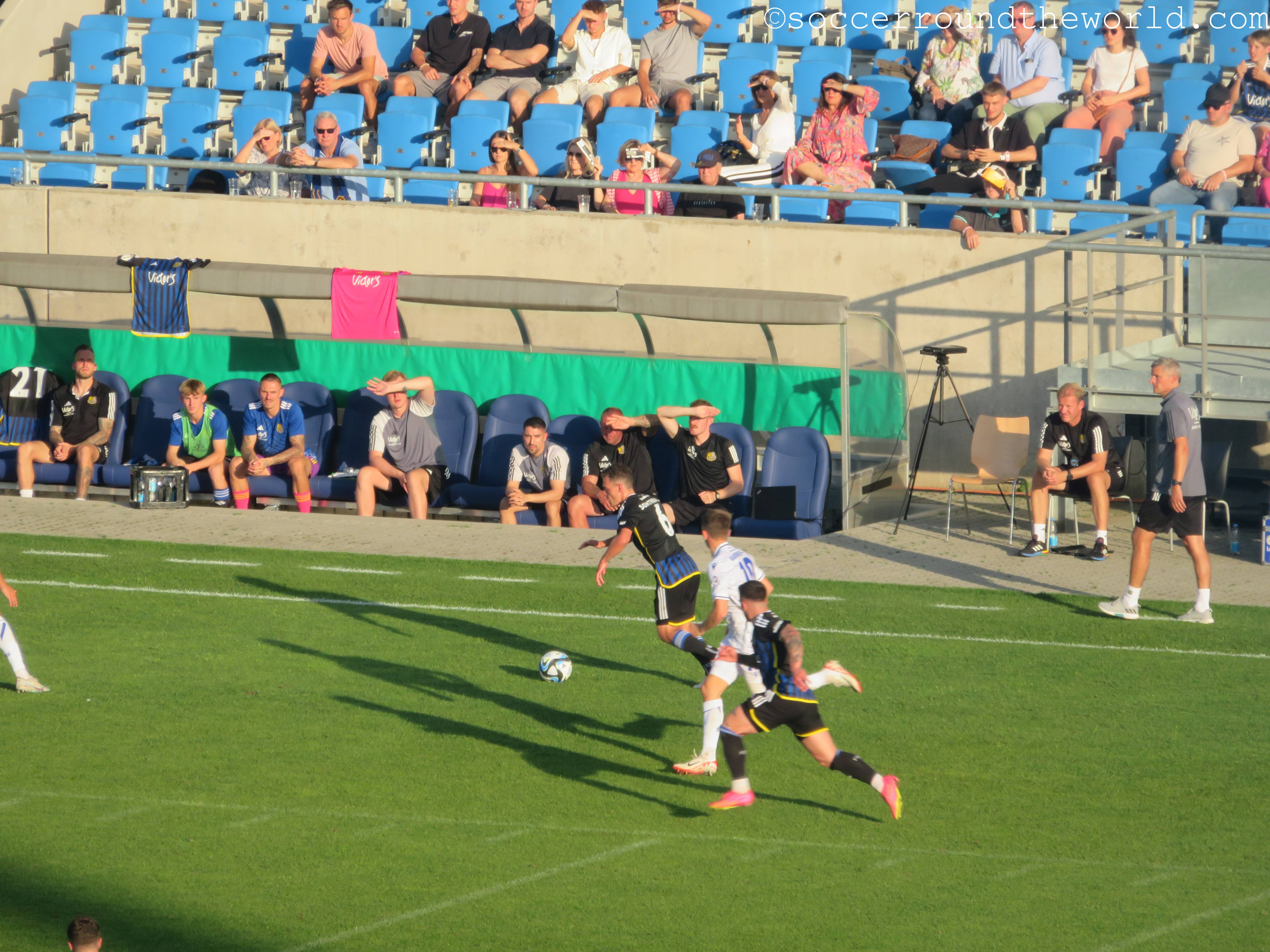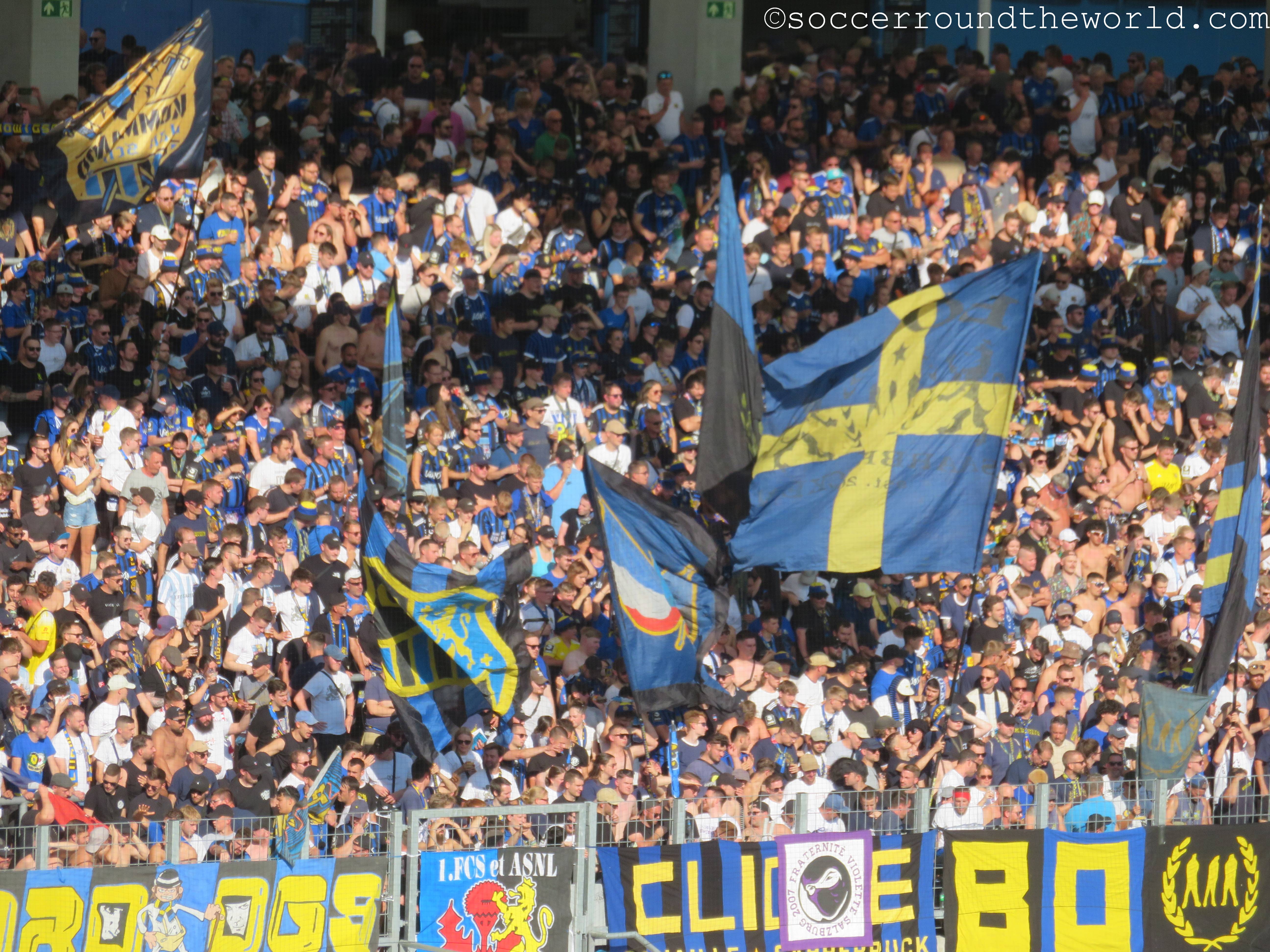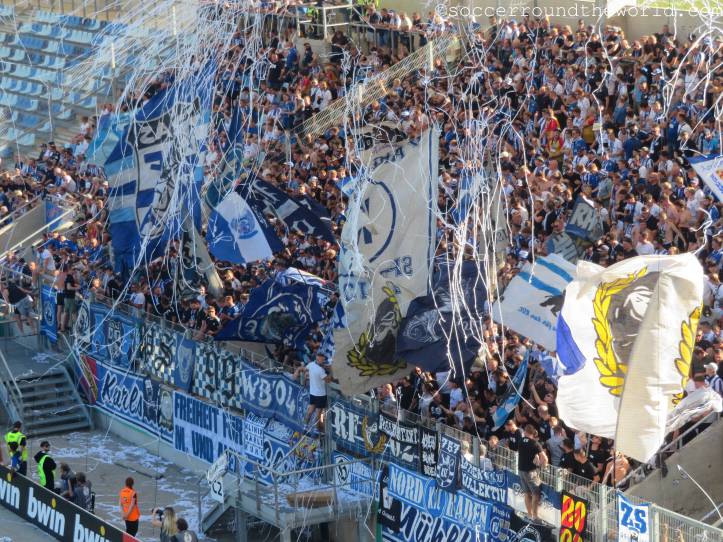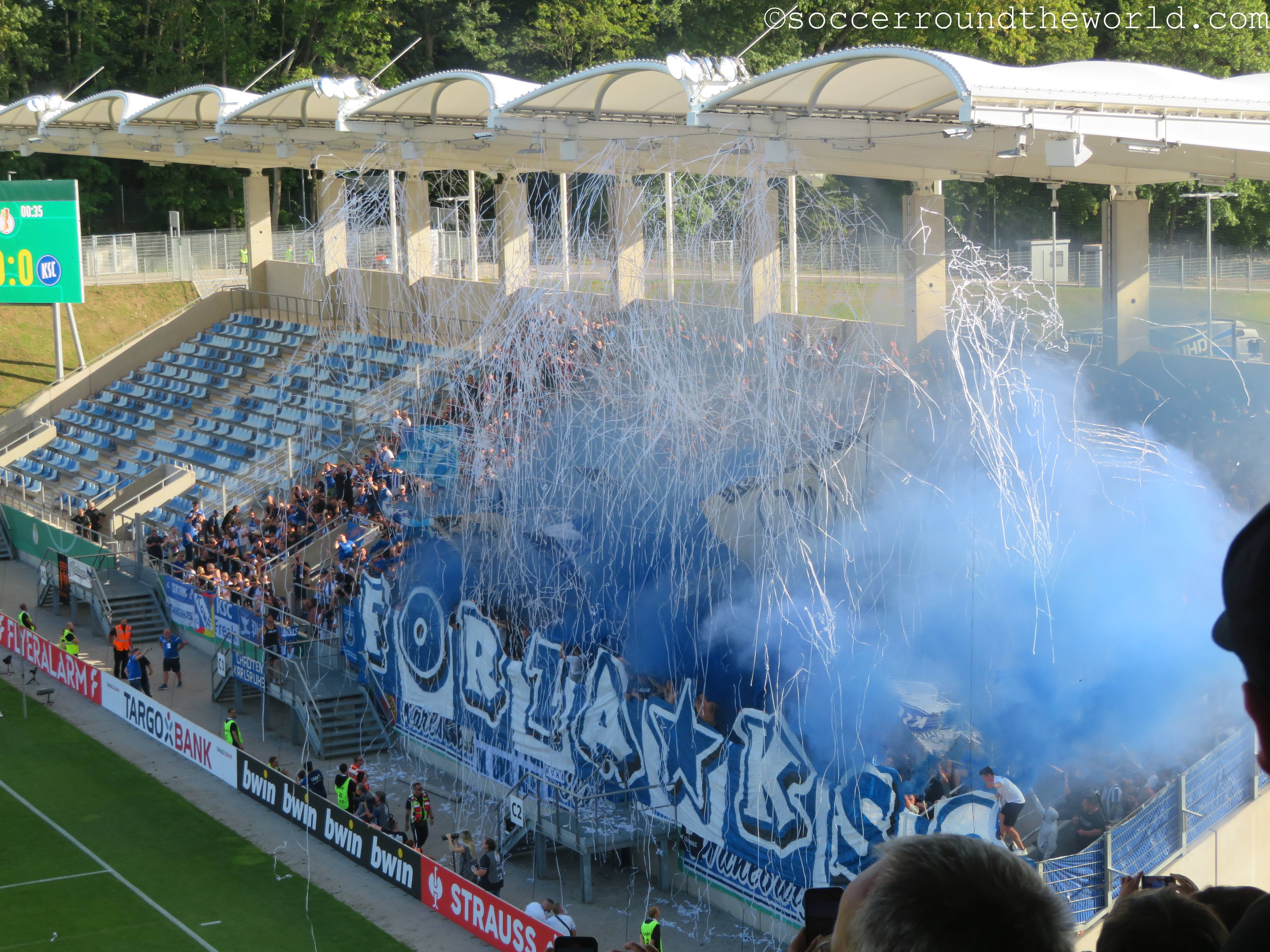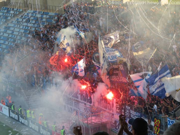 Sehr hitzig ist auch das Duell auf den Rängen: Sowohl die heimische Virage Est als auch die zahlreichen Anhänger aus Karlsruhe sorgen über 90 Minuten für eine dichte, dem Cup durchaus würdige Atmosphäre. Die Gäste überzeugen zudem auch mit zahlreicher Pyrotechnik und Rauchmaterial. Eher unschön sind teilweise die Szenen auf unserer Gegengeraden, wo es zwischen heimischen und auswärtigen Fans immer wieder zu handgreiflichen Auseinandersetzungen kommt. Diese werden von den Securities und der einmal auch aufziehenden vermummten Polizei aber immer wieder unter Kontrolle gebracht.