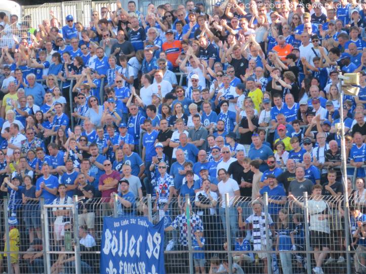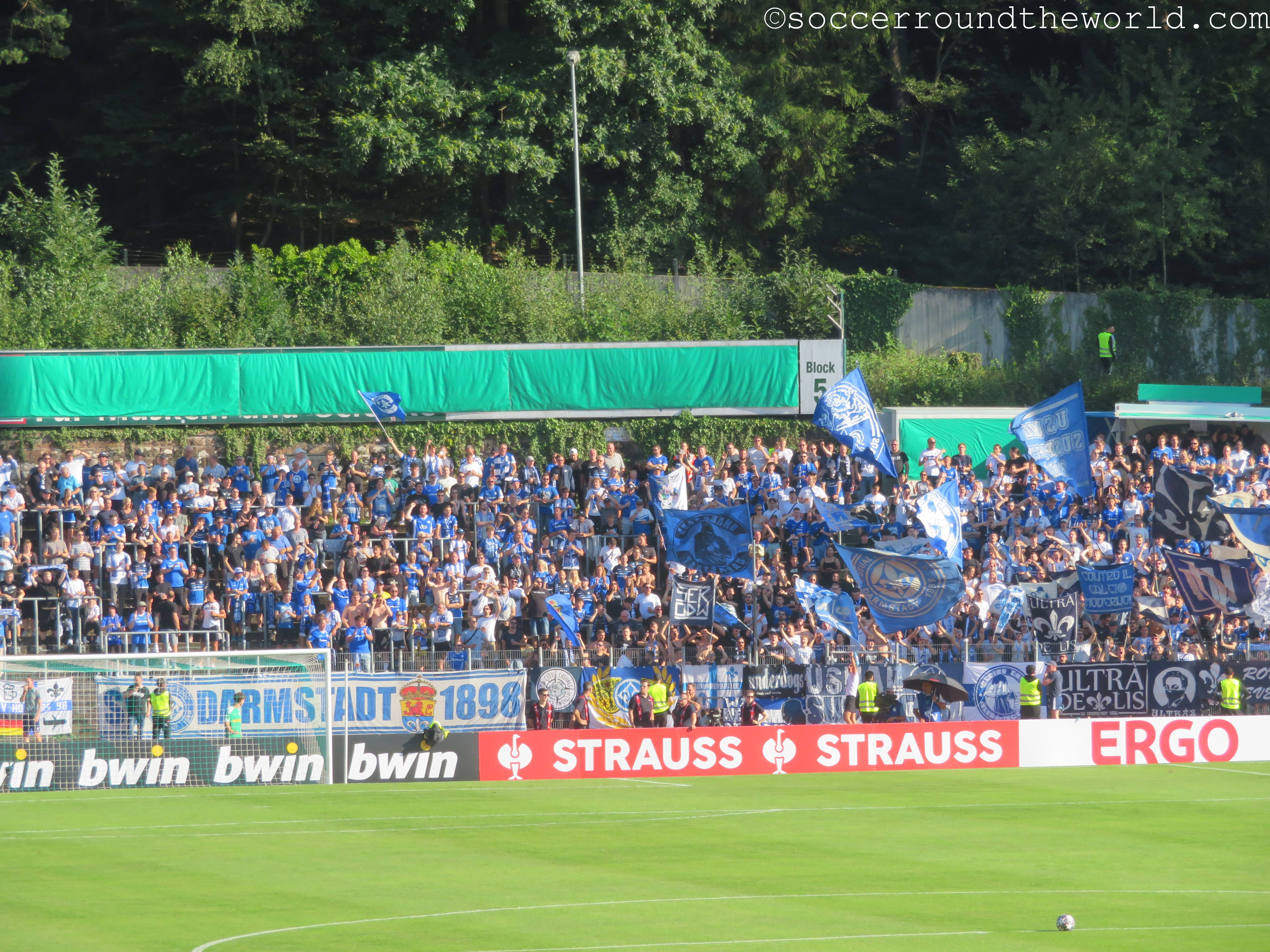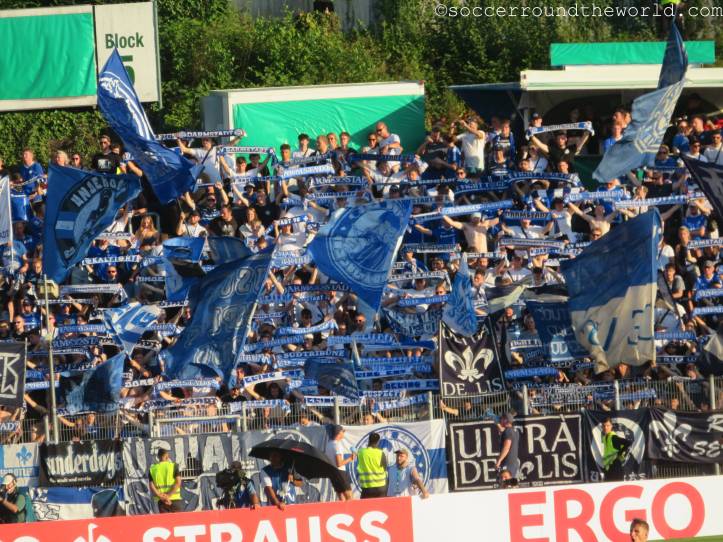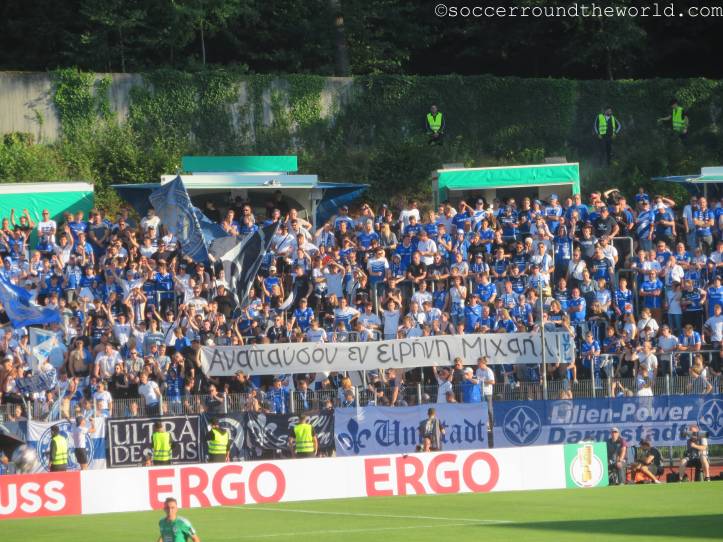 Fantechnisch geben lange Zeit dennoch die Lilien den Ton an, die einen durchaus guten Support für ihre schwache Mannschaft leisten. Nach Spielende wird Darmstadt sogar noch von der blauen Kurve aufgemuntert. Bei den Homburgern hingegen merkt man, dass große Kulissen zuletzt eher doch nicht so häufig vorgekommen sind, Stimmung im ganzen Stadion kommt nur selten auf. Erst gegen Schluss hallt ein „Oh, wie ist das schön“ durch das weite Rund im Waldstadion, um den ersten Cupaufstieg seit 28 Jahren gebührend zu feiern.