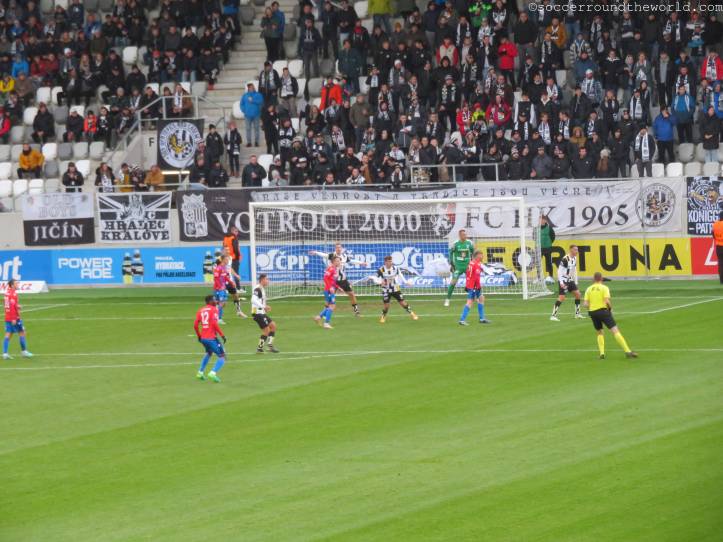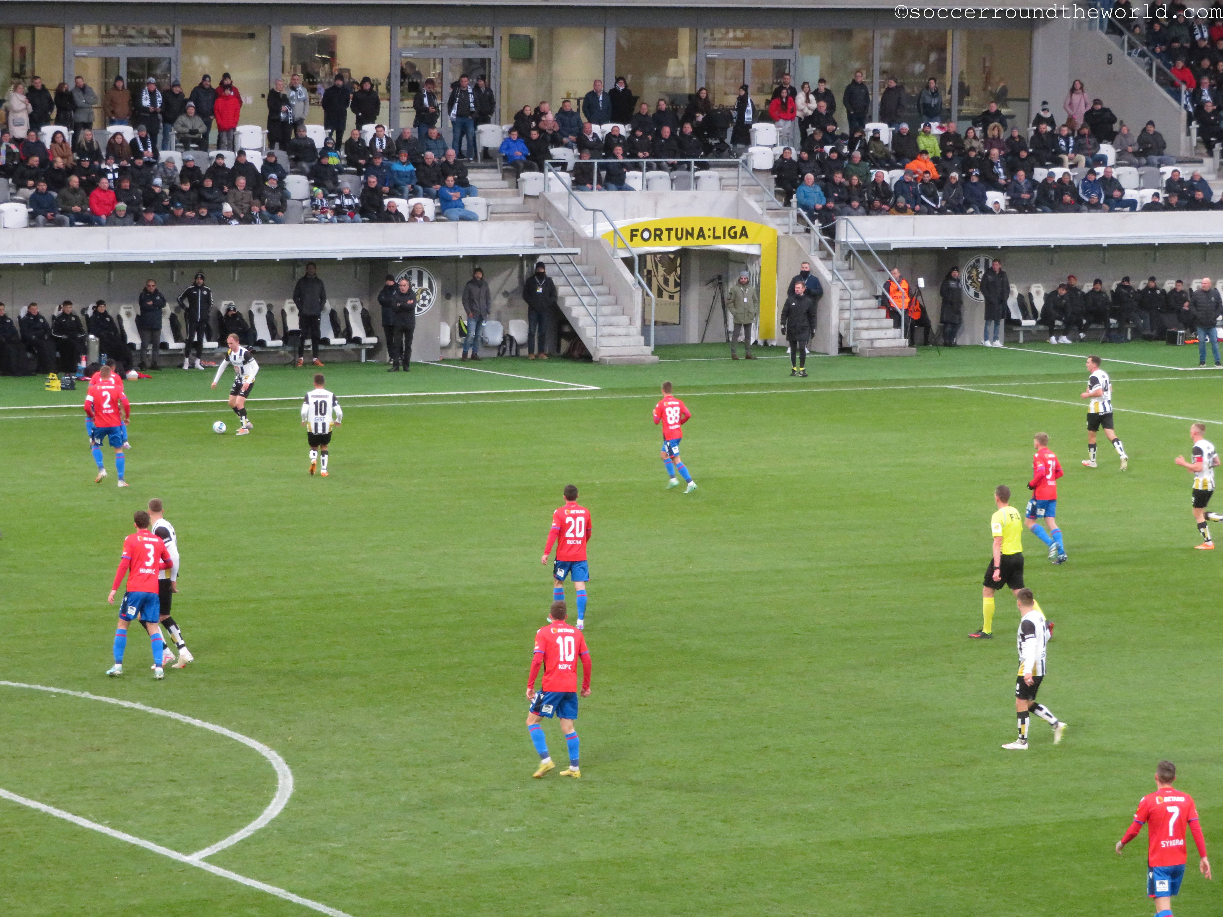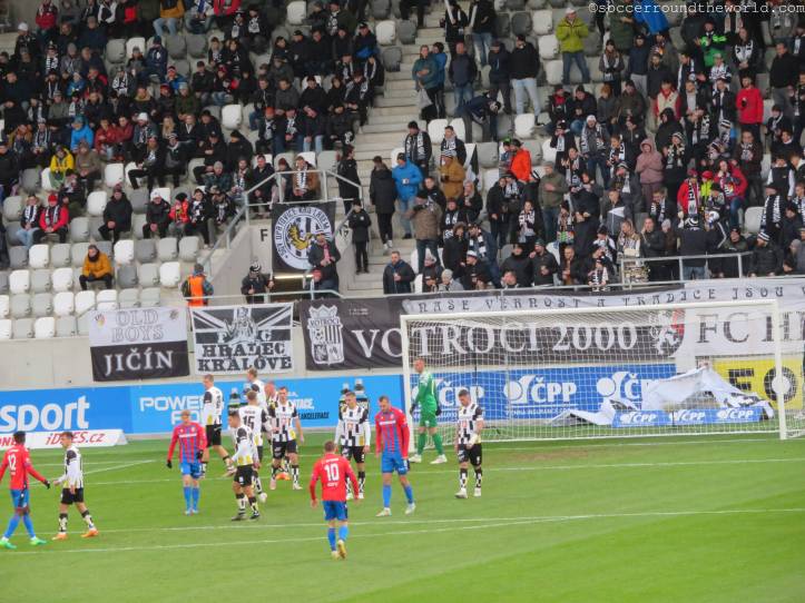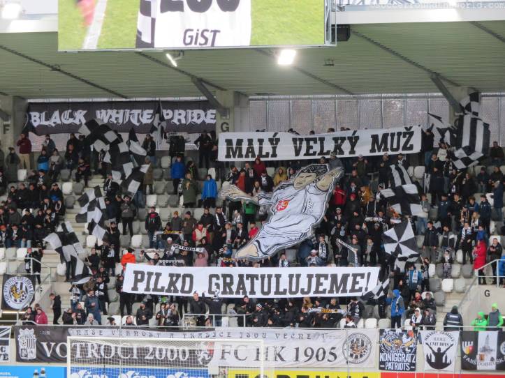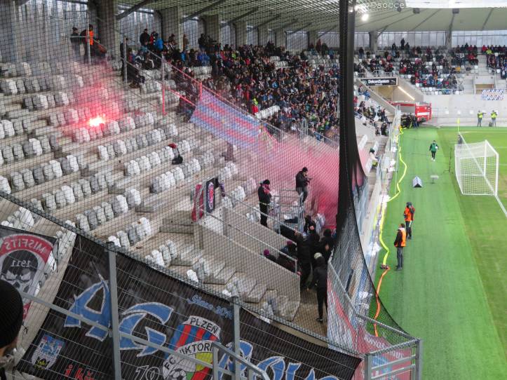 In der durchaus ansehnlich gefüllten Arena geben die Anhänger aus Pilsen heute klar den Ton an, auch wenn wir sie durch unsere örtliche Nähe sicher noch um eine Spur lauter wahrnehmen als sie im gesamten Stadion zu hören sind. Dennoch überzeugen sie durch wechselnde Fangesänge, einer Choreo zu Beginn der zweiten Halbzeit und einigem Einsatz von Pyrotechnik und Rauchtöpfen. Die heimische Kurve wirkt hingegen eher klein und überschaubar, vor allem aber auch gesanglich weit weniger motiviert bzw. organisiert.