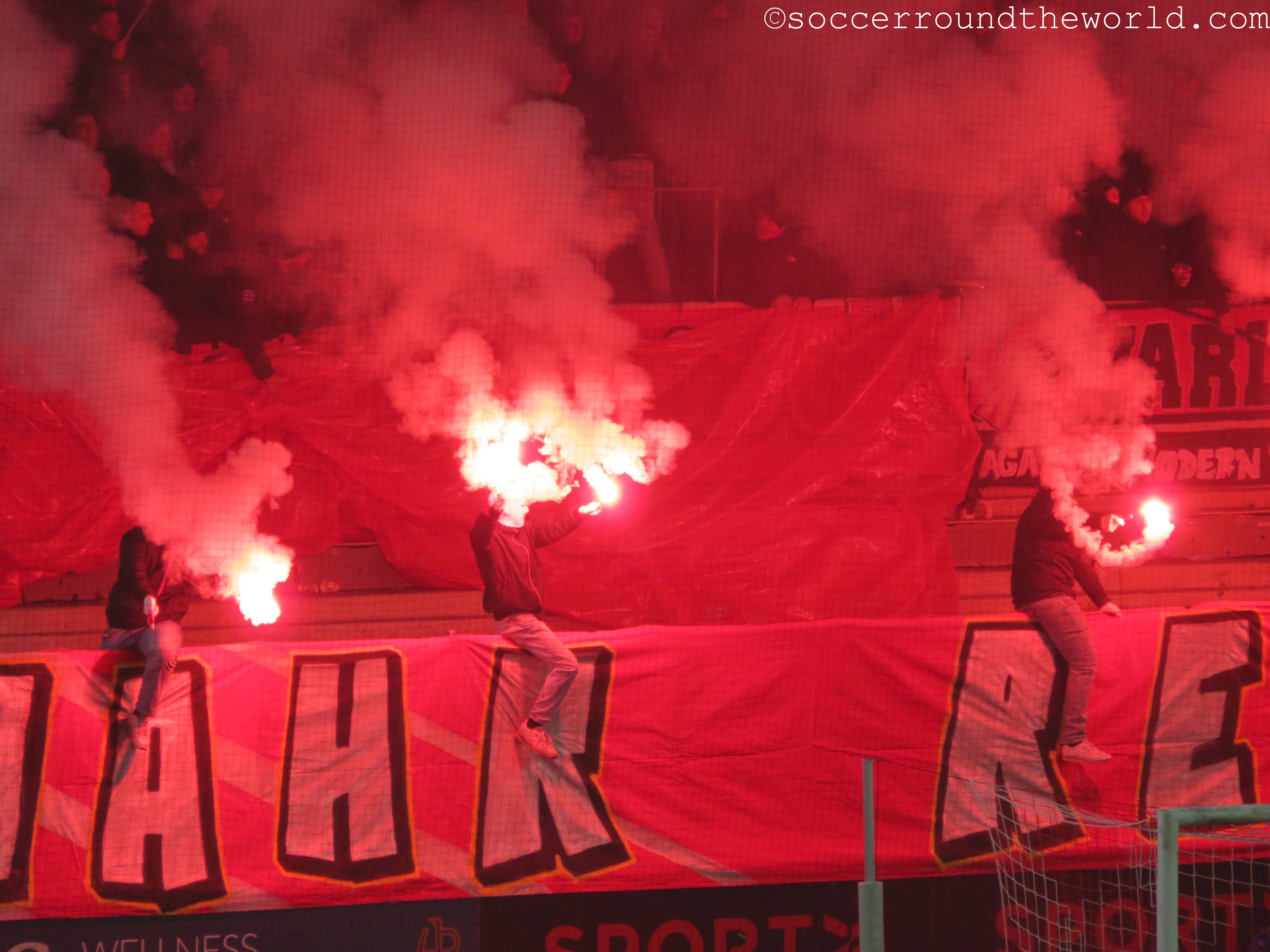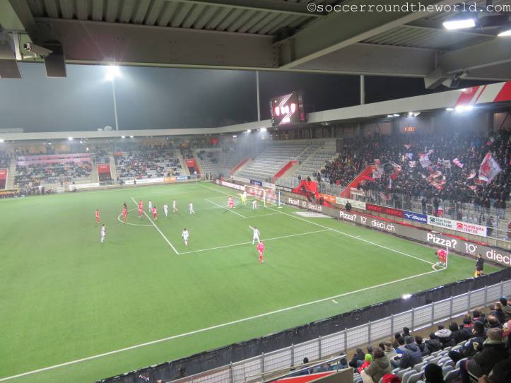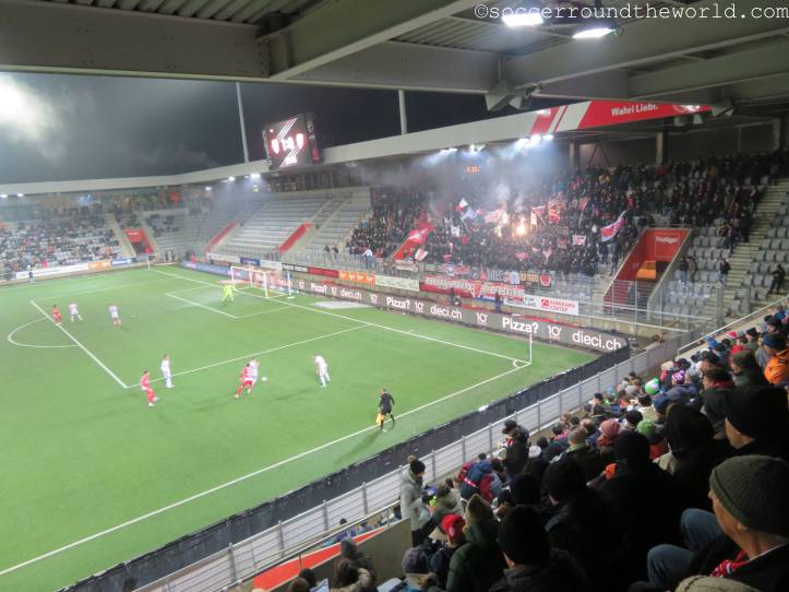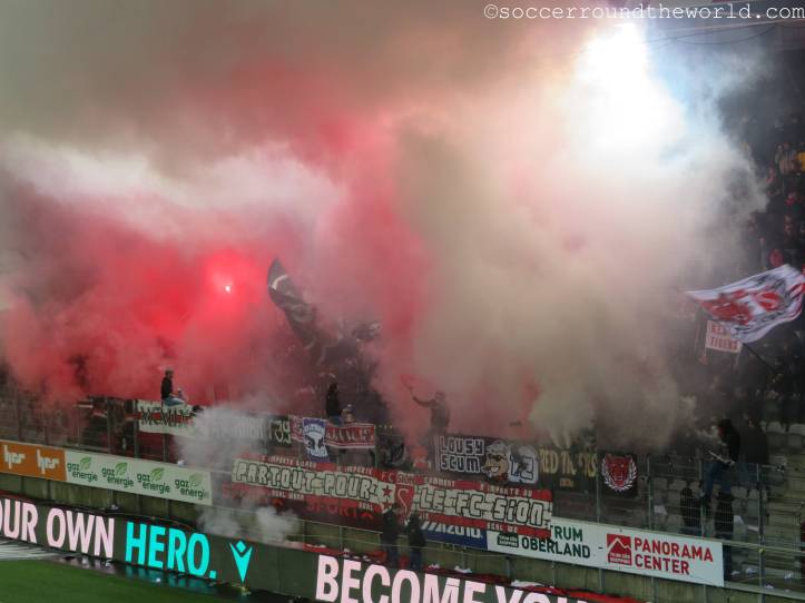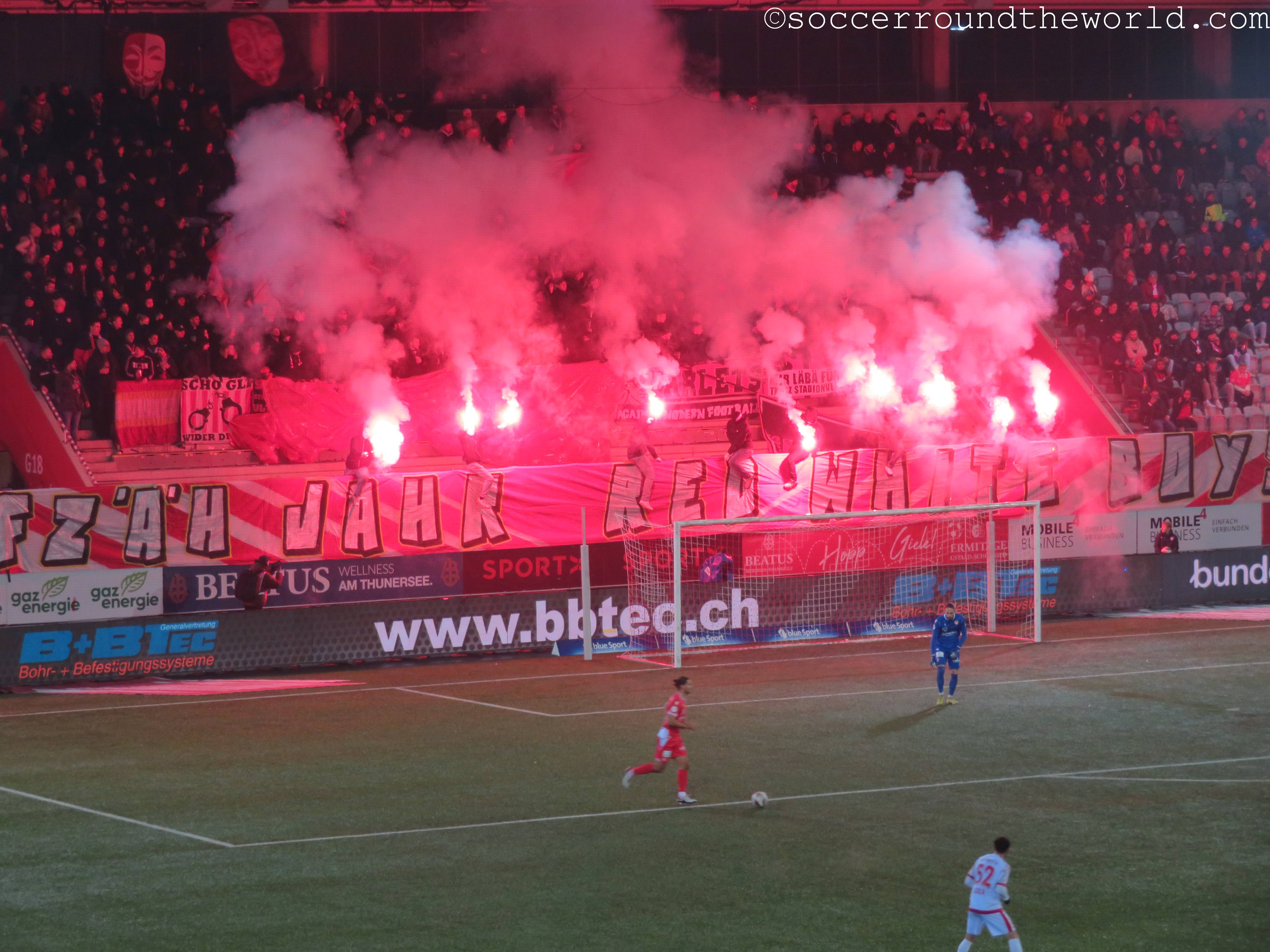 Vom gesanglichen Repertoire und der Lautstärke haben meiner Meinung nach eindeutig die französischsprachigen Anhänger aus Sion die Nase vorne – auch wenn sie als Tabellenführer mit dem 1:1 sicher auch die meiste Freude haben können, während Thun mit dem Remis die Übernahme der Ligaspitze verabsäumt. In beiden Kurven wird allerdings ein beeindruckender pyrotechnischer Aufwand betrieben, wobei mit den Bildern davon ganze Fotoalben gefüllt werden können. Gerade in Hälfte zwei lenken sie damit immerhin vom doch eher eintönigen Geschehen auf dem Spielfeld ab.