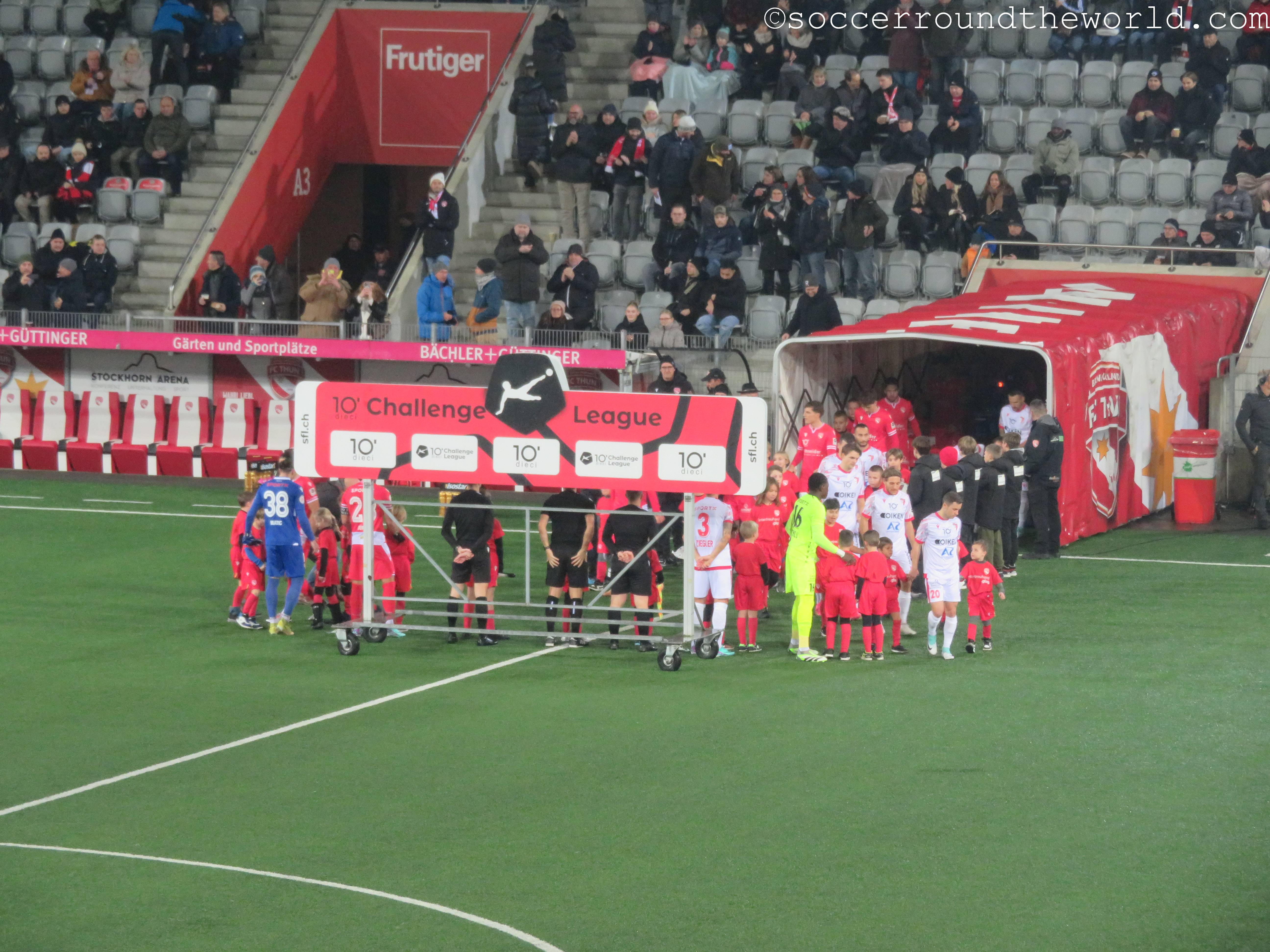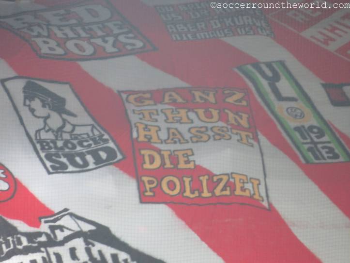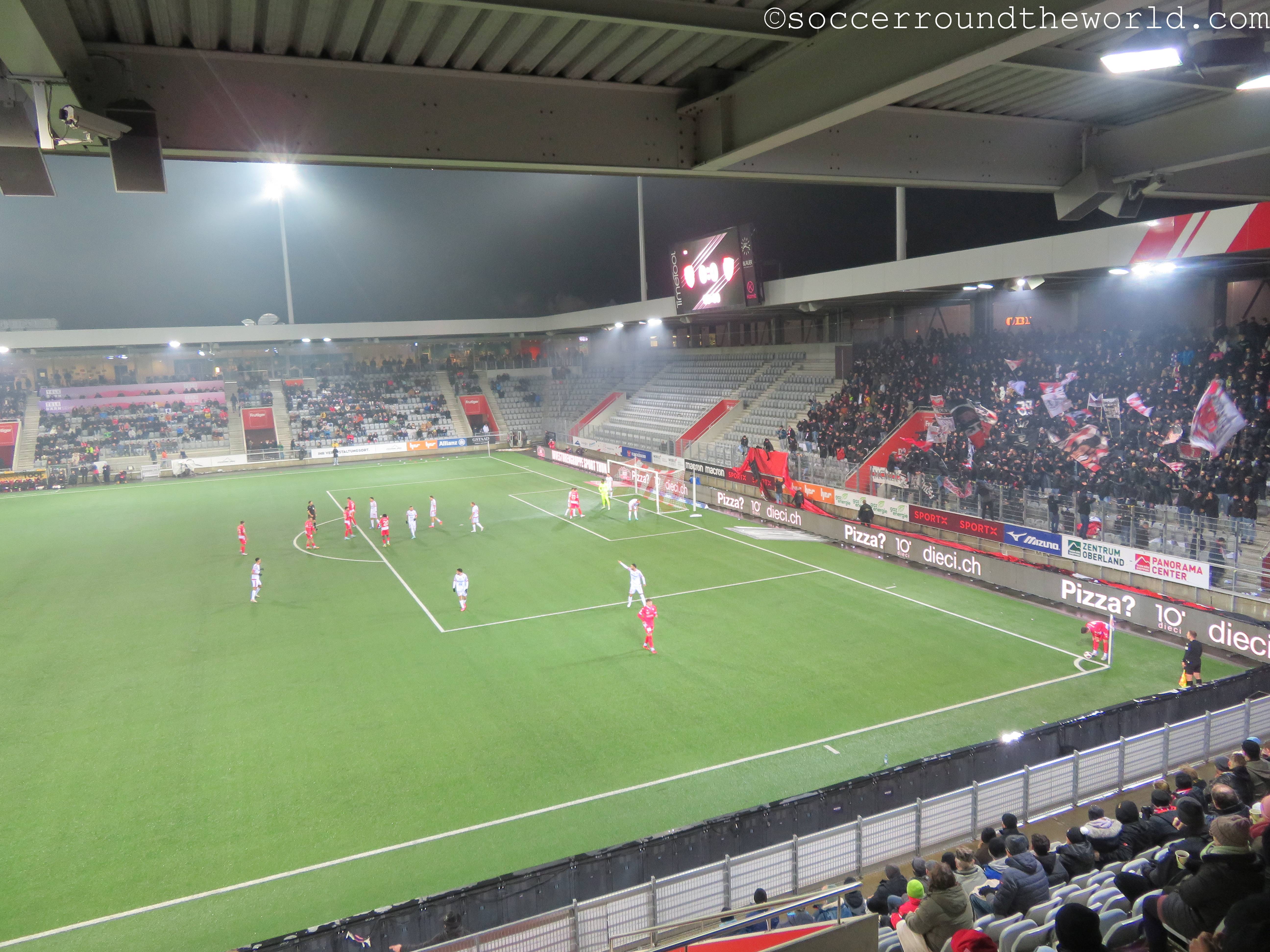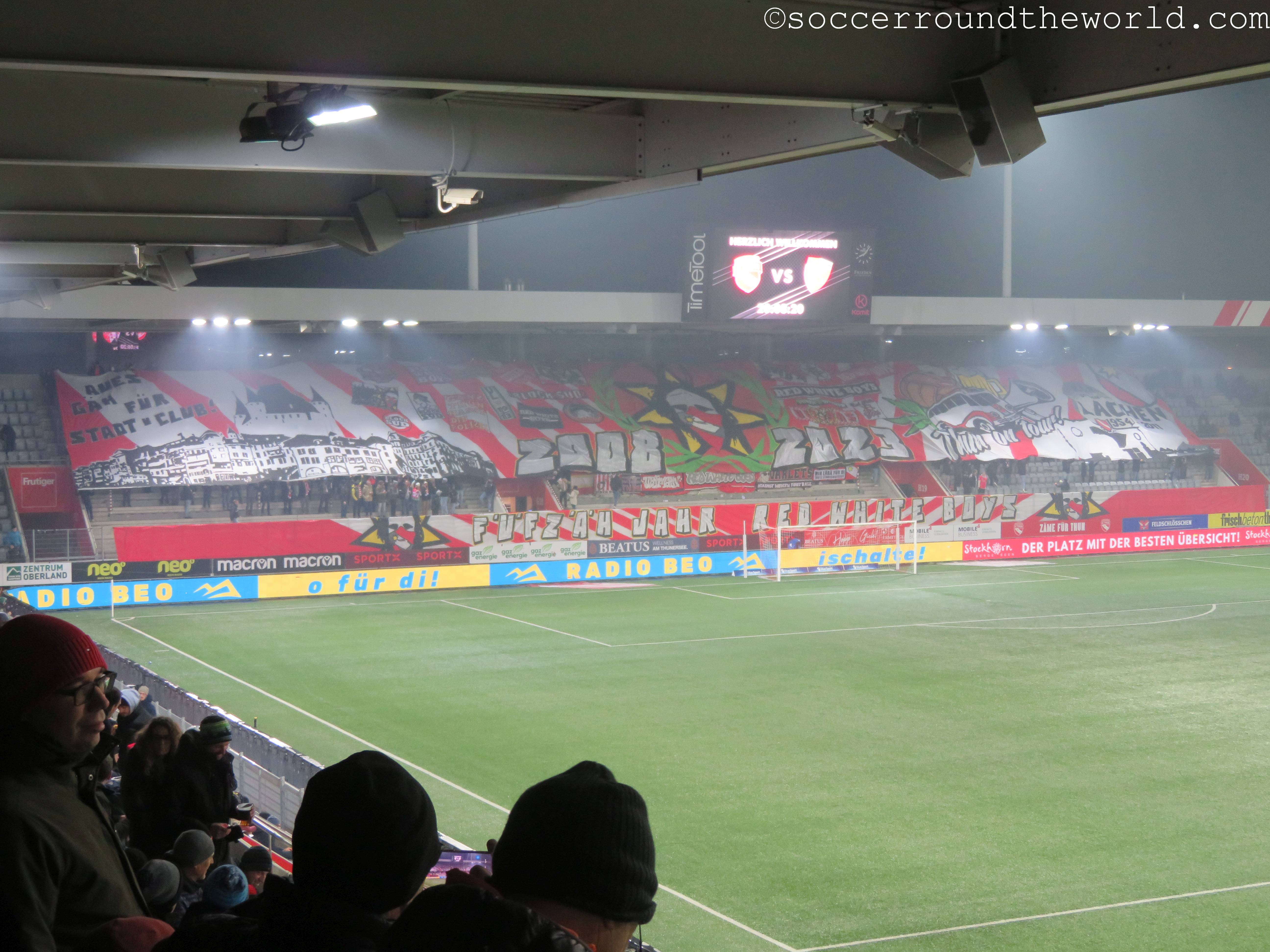 Das heutige Spitzenspiel der zweiten Schweizer Liga hält auf jeden Fall, was es versprochen hatte – wenn auch nicht unbedingt auf dem Rasen. Zwei bis in die Fingerspitzen motivierte Fanlager schenken sich über 90 Minuten nichts. Den Auftakt machen bereits zwei Choreographien zu Spielbeginn, wobei die Thuner Kurve den 15. Geburtstag der führenden Fangruppe feiert. Die riesige Überrollfahne kaschiert dabei die doch eher locker besetzte Hintertortribüne und wird daher auch bis weit in die ersten Minuten des Spieles oben gehalten. Auf der gegenüberliegenden Seite ziehen die Gäste aus Sion vor einem weißen Zettelmeer ein kleines Bergpanorama hoch.