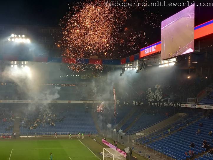 Auch heute sind beide Fanlager äußerst pyrotechnisch veranlagt, wenn auch in der zeitlichen Ausdehnung etwas eingeschränkter. Sowohl die Muttenzerkurve als auch die Gäste aus Zürich sparen zu Beginn nicht mit Leuchtkörpern, verlegen sich danach allerdings wieder eher auf reinen Gesang. Trotz einer auf dem Spielfeld eher bescheidenen Leistung ist die Stimmung durchwegs sehr gut. Für größte Aufregung sorgt vor allem die frühe Rote Karte für Basel. Danach halten die Rot-Blauen lange dennoch erstaunlich gut mit. Der Siegtreffer für Grasshopper fällt erst spät in der zweiten Hälfte.