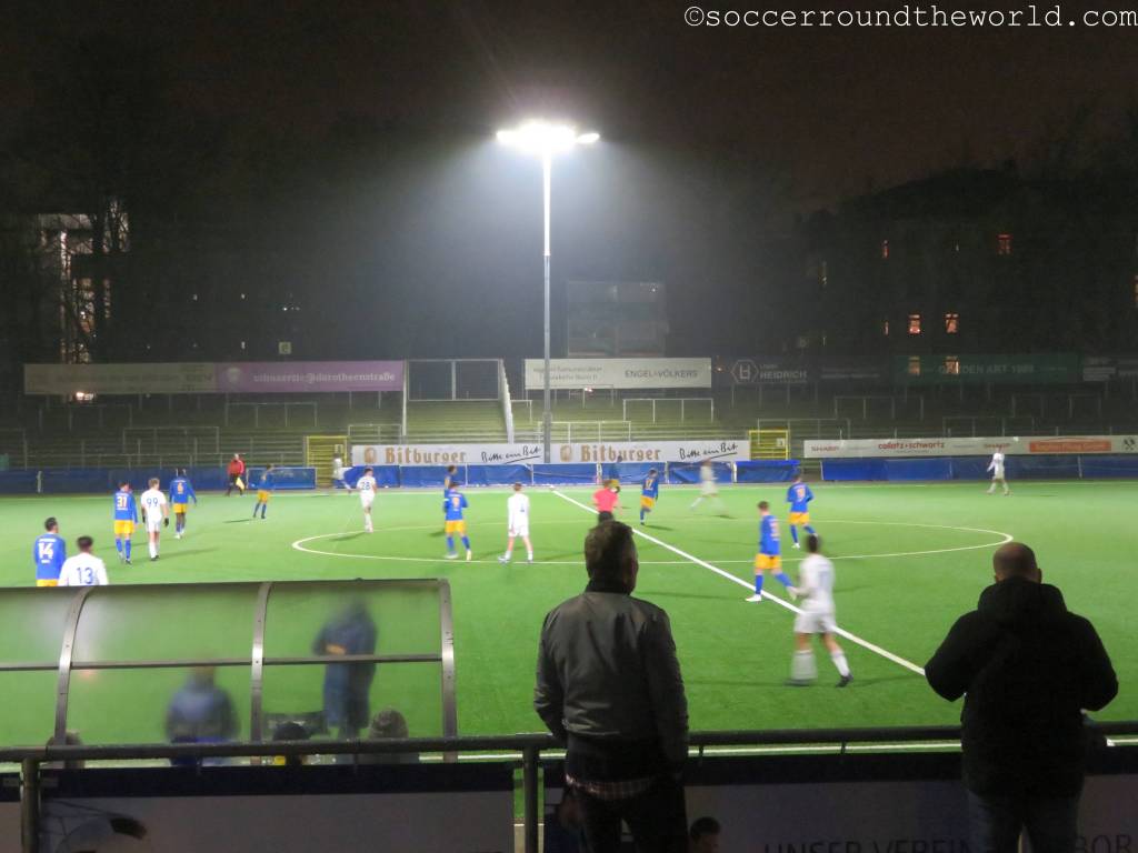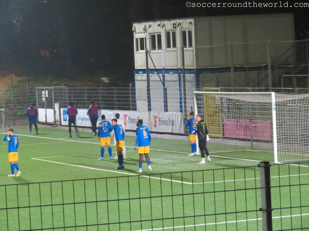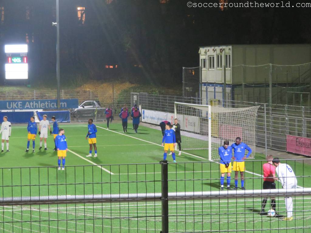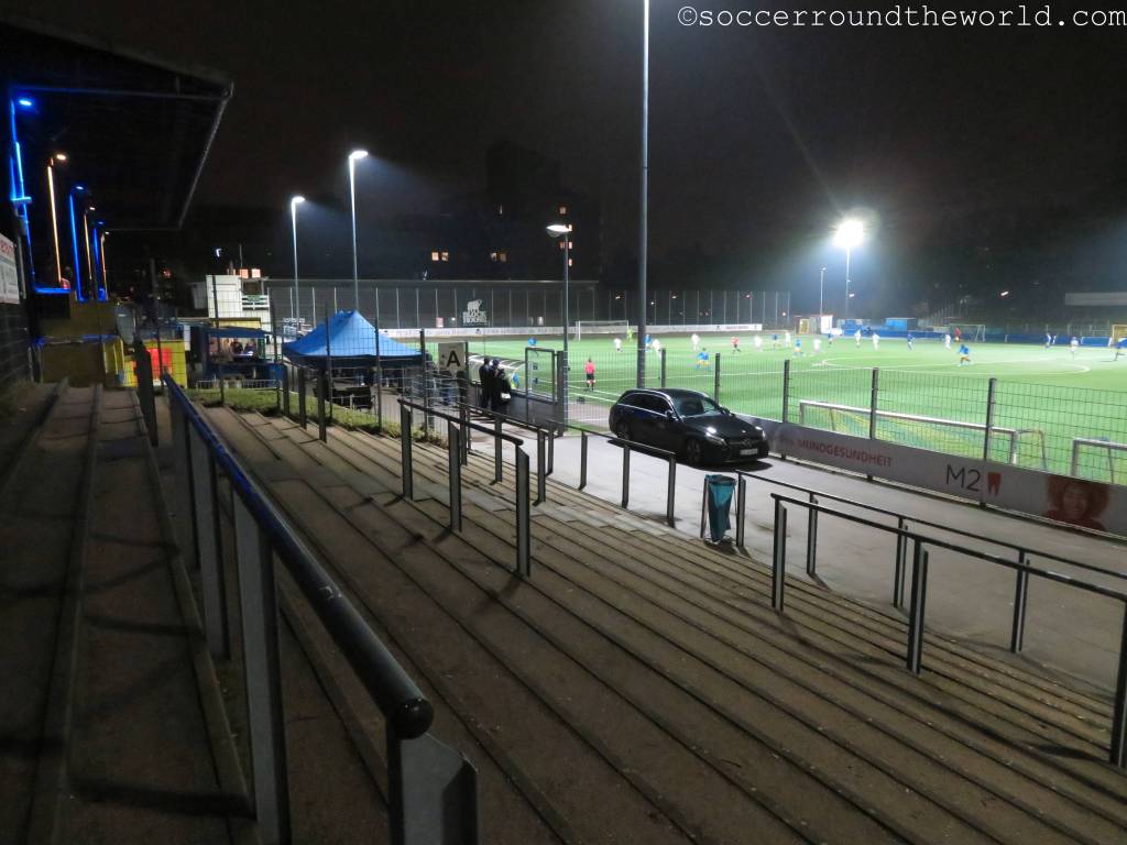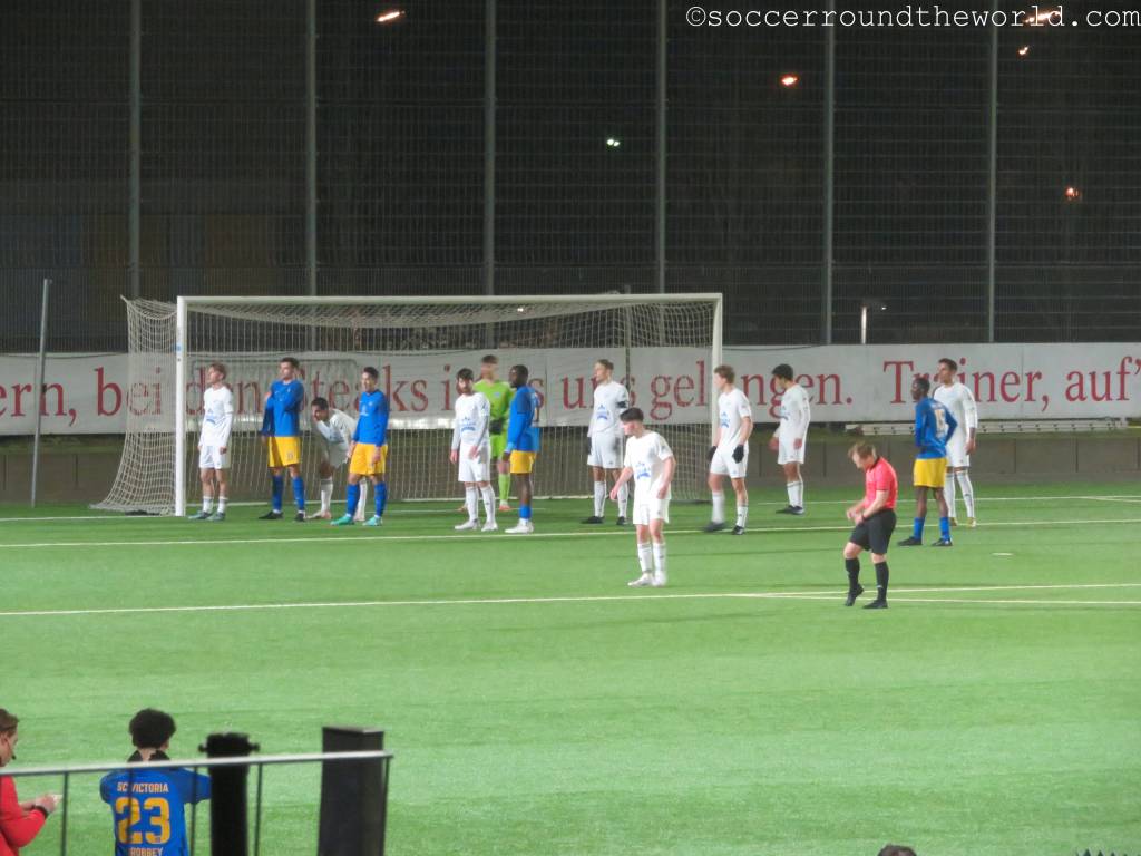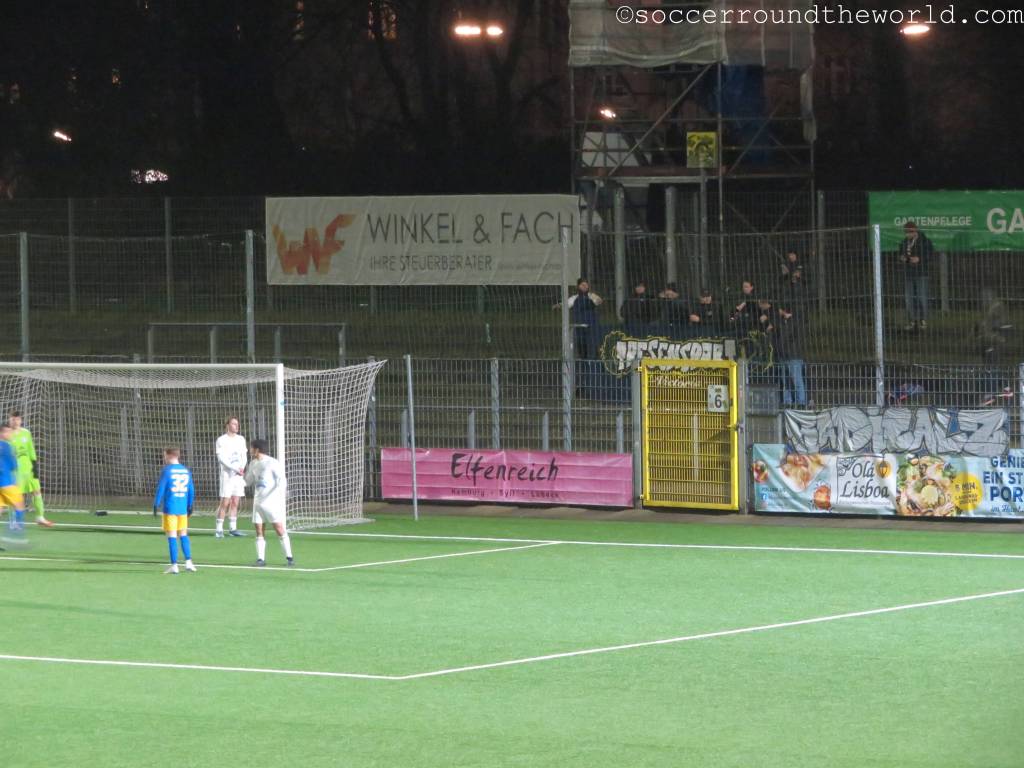 Der Rest bekommt ein durchaus munteres Fußballspiel zu sehen, in dem Victoria vorerst eher unverdient in Führung geht. Mit einem spektakulären Treffer – der blau-gelbe Torhüter erhält ein Gurkerl – können die Gäste aus Holstein allerdings relativ rasch ausgleichen. Hier zeigt sich auch, dass ein nicht unerheblicher Teil der Fans auf Seiten von Tornesch steht. In der zweiten Hälfte kommt Vicky zu mehreren Chancen, der erlösende Führungstreffer fällt aber erst kurz vor Schluss. Von einem Teil der Auswärtsanhänger wird der Torschütze mit Affenlauten bedacht – ein Verhalten, das ich in Deutschland schon länger nicht mehr beobachten musste. Spätestens damit hat Tornesch alle meine (sowieso nicht vorhandenen) Sympathien verspielt.