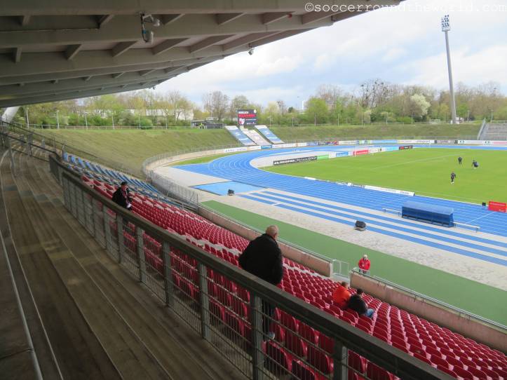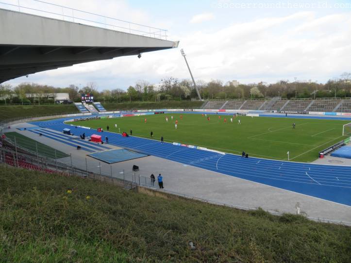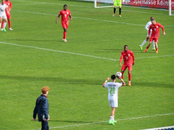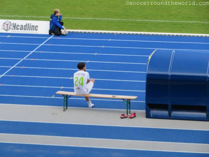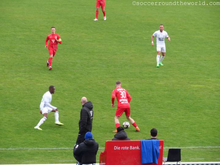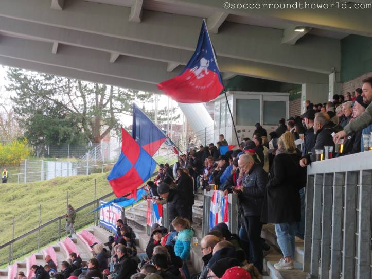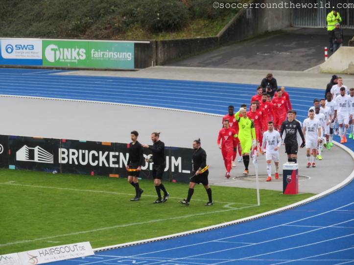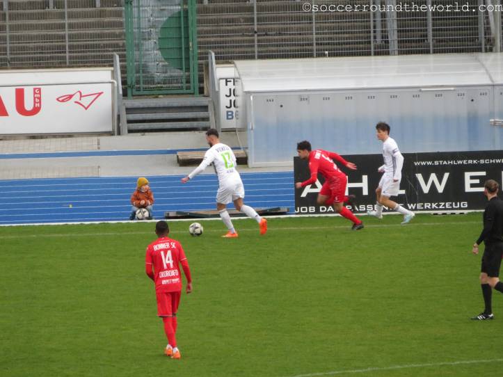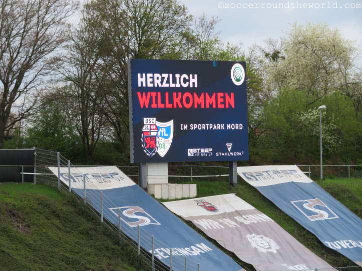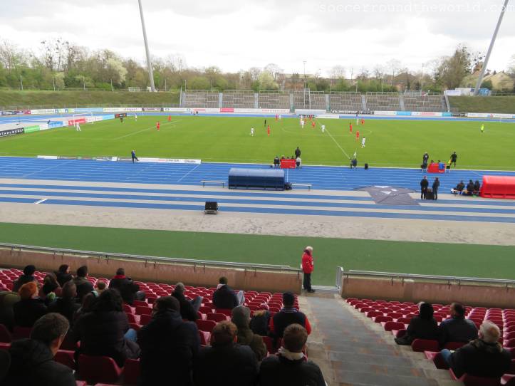 Mit dem „Block A“ verfügt der Verein auch über eine kleine, aber feine Fanszene, die ihn auch heute gegen den aus der Aachener Region kommenden VfL Vichttal unterstützt. Obwohl beide Mannschaften in der Tabelle durchaus in den oberen Rängen zu finden sind, entwickelt sich nie wirklich eine hochklassige Partie. Vor allem in der ersten Hälfte dominieren individuelle Fehler und holpriges Spiel. Etwas mehr Spielkultur entwickelt sich schrägerweise erst, als einer der Heimspieler mit Gelb-Rot vom Platz gestellt wird, was offensichtlich vor allem der Spielstärke des eigentlich geschwächten Teams guttut. Trotz einiger guter Chancen in Hälfte zwei bleibt es aber beim torlosen Unentschieden.