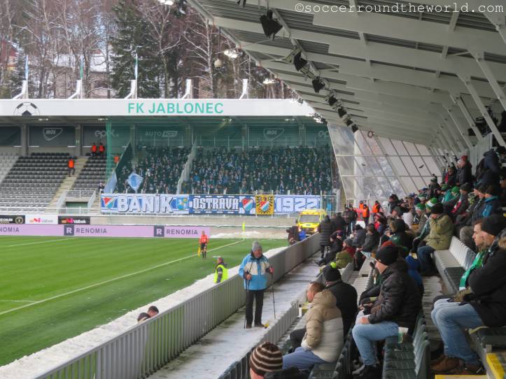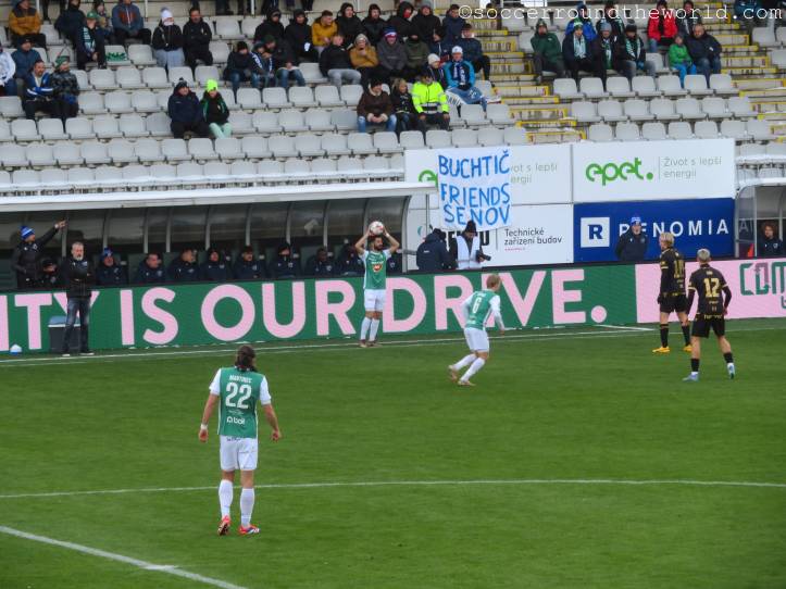 Rund 50 Prozent der Kapazität sind heute ausgelastet, auch wenn es sich doch weniger anfühlt. Dies könnte unter anderem daran liegen, dass die heimischen Fans leider eine eher enttäuschende Performance abliefern. Glücklicherweise heißt der Gegner allerdings Banik Ostrava, dessen Anhänger:innen mir bereits in den letzten Jahren ob ihrer Stimmgewalt positiv aufgefallen sind. Auch heute sind sie durchaus zahlreich erschienen und besetzen neben dem Auswärtssektor auch weite Strecken der kleineren Gegengeraden. Umso schlechter das Spiel für ihre Mannschaft läuft, umso heißblütiger werden sie auf den Rängen. In Hälfte zwei schließt sich sogar ein Großteil des Auswärtsblocks der „Sektion Oberkörper frei“ an – bei Temperaturen rund um den Gefrierpunkt doch durchaus beachtlich.