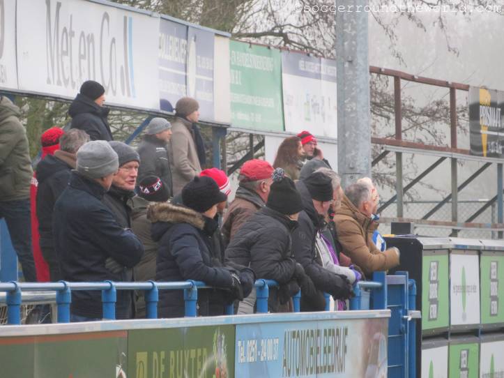 Die aus seinen Berichten guten Zeiten, als noch mehrere Tausend zu Spielen hier kamen, sind wirklich vorbei. Am Schluss verlieren sich ein paar Hundert auf der Anlage mit einer doch nicht unbeachtlichen Sitzplatztribüne. Hälfte zwei verbringt der Großteil der Besucher dann ohnehin im beheizten Klubhaus, wo sich die Countryband (mit Mundharmonika!) schon für den Auftritt nach dem Match warmläuft. Am eiskalten Platz ist derweil für den Tabellenletzten der dritten Liga auch weiterhin nichts zu holen, De Treffers siegt staubtrocken und sicher mit 0:3.