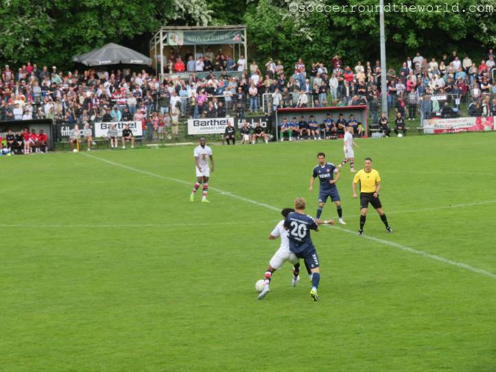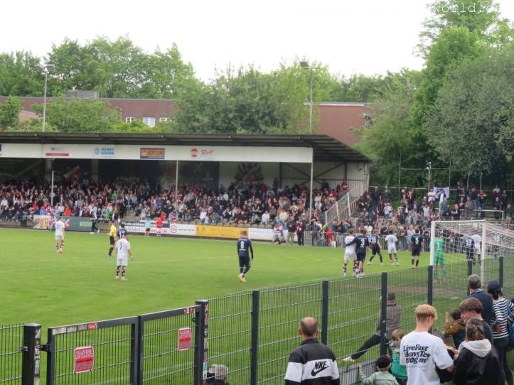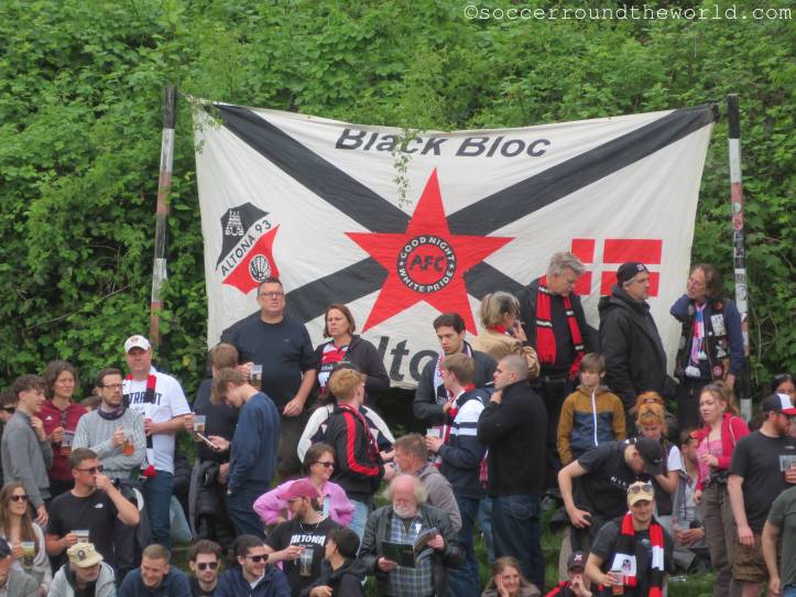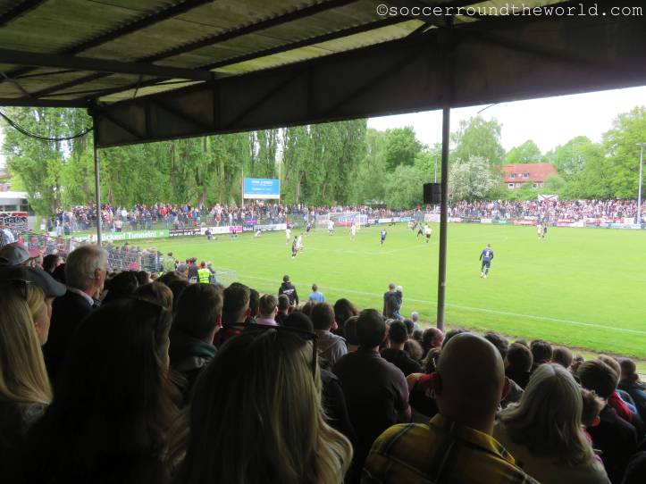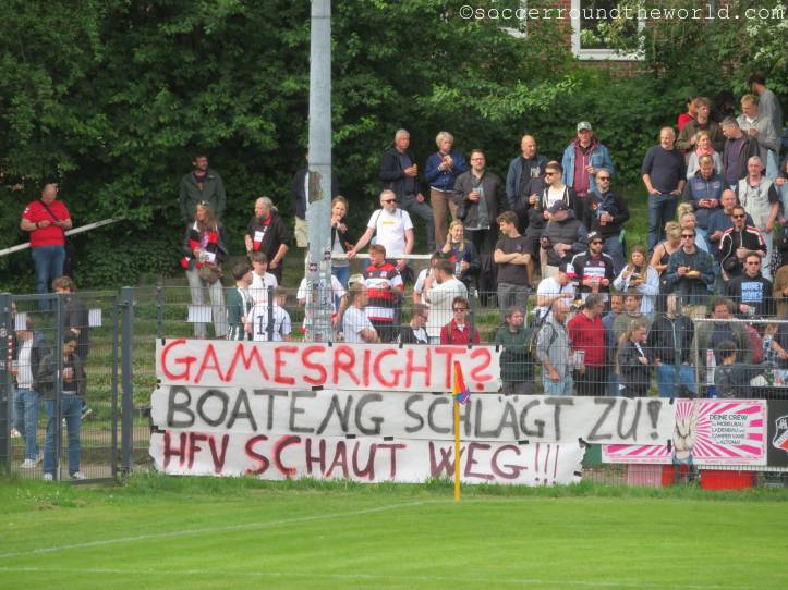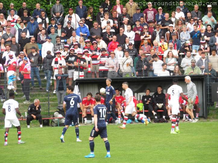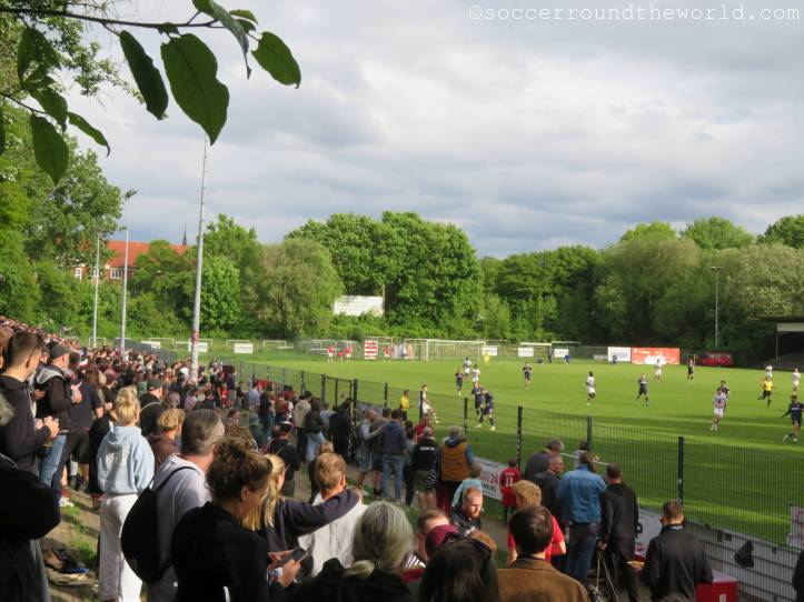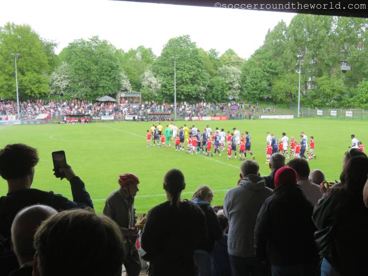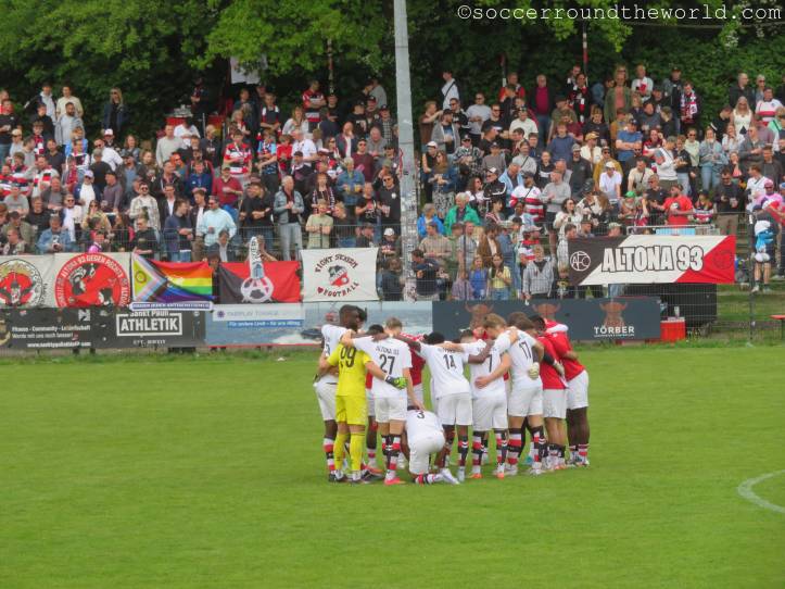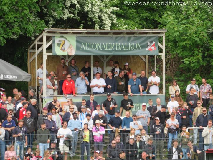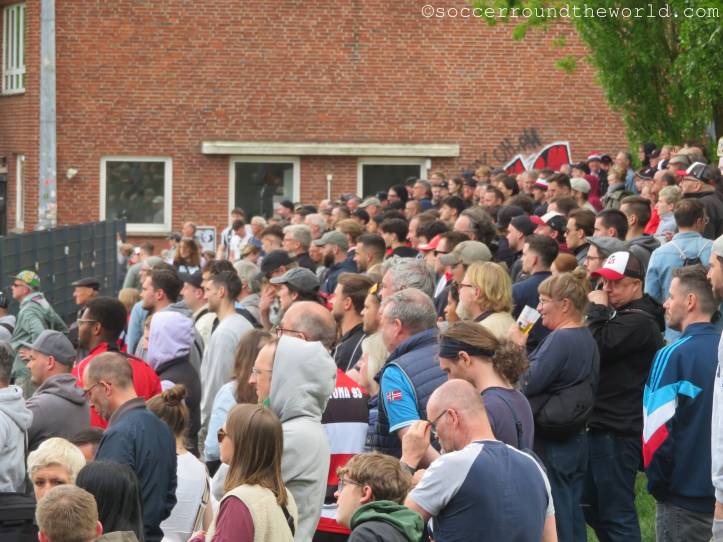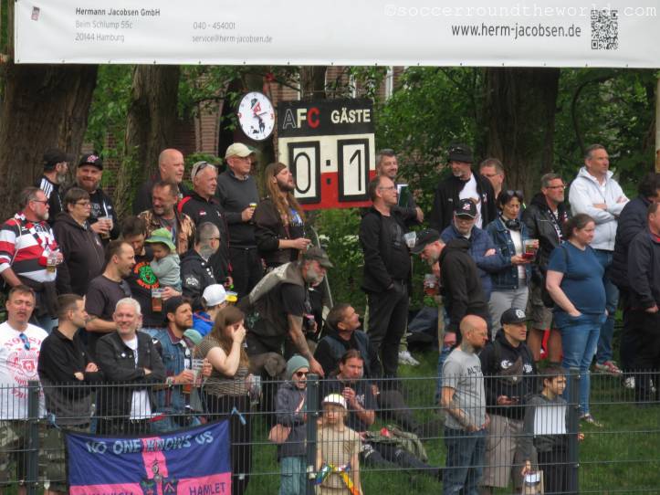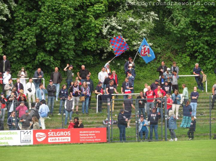 In den letzten Jahren mauserte sich der Verein zu einer Alternative für Fans, denen die Entwicklung beim FC St. Pauli zu stark in Richtung Kommerzialisierung geht. Andererseits merkt man doch auch große Überschneidungen bei den Anhänger:innen: Durch die Bank sind viele Utensilien des Kiezklubs beim heutigen Spiel zu sehen. Bereits im Vorfeld war zu lesen, dass die gleichzeitige Ansetzung des Bundesligaspiels von St. Pauli gegen den VfB Stuttgart die Vereinsverantwortlichen um noch höhere Zusatzeinnahmen fürchten ließ. Immerhin träumte man sogar von einem ausverkauften Haus, dazu hätten allerdings doppelt so viele Menschen erscheinen müssen.
