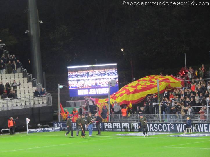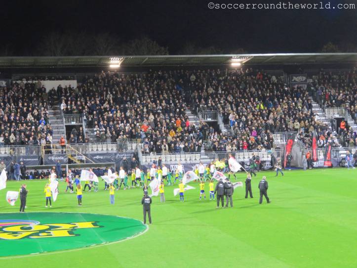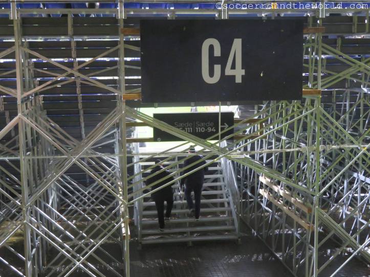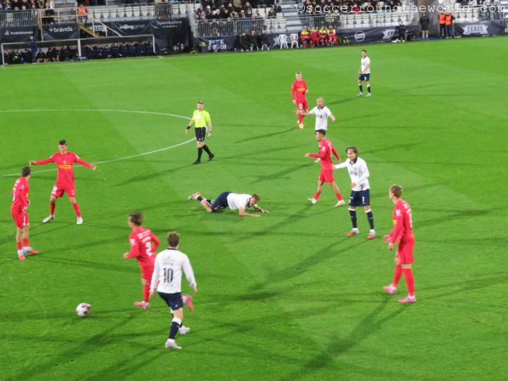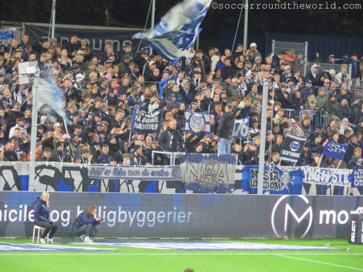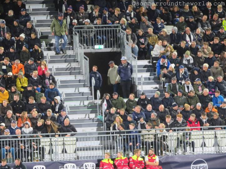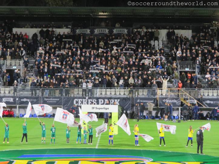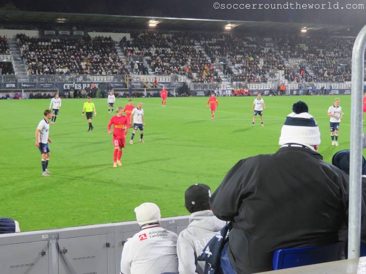 So erlebe ich bei diesem Spiel sehr, sehr viele Fans in sehr ausgelassener Stimmung, auch wenn es heut ein hartes Stück Arbeit war. Aarhus zeigt sehr attraktiven Fußball, bemüht sich, selbst schwierige Situationen spielerisch zu lösen. Das Abwehrbollwerk von Nordsjaelland macht es ihnen aber schwer, erst recht nachdem die Gäste mit einer Roten Karte dezimiert wurden. So steuert alles auf einen Treffer in letzter Minute zu, der doch noch die drei Punkte sichert.