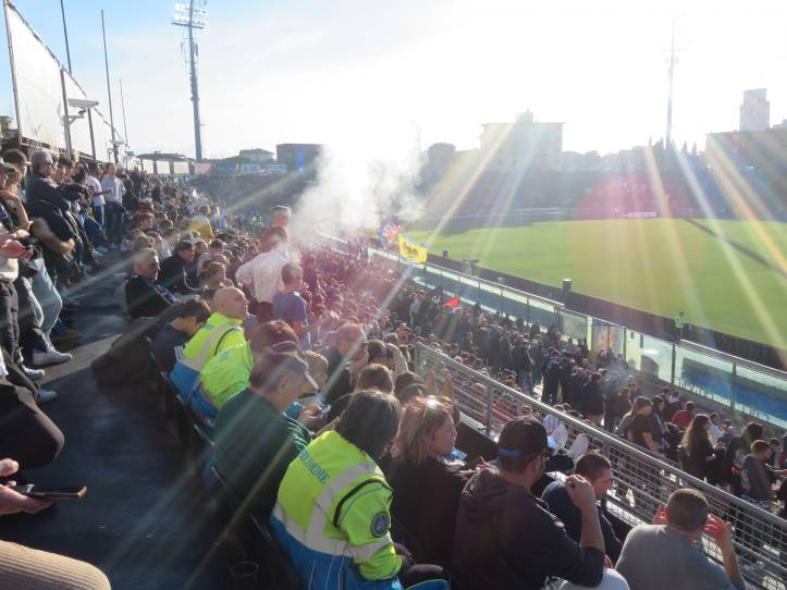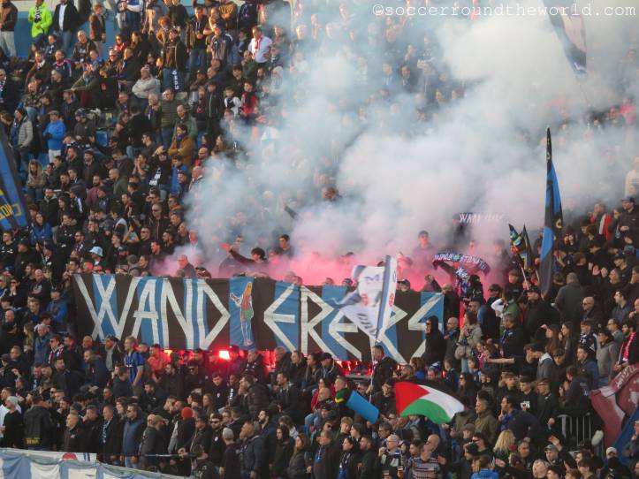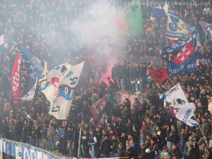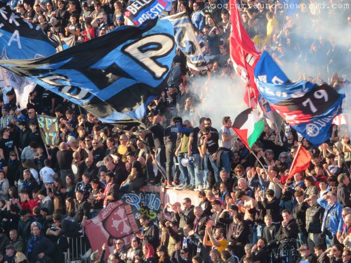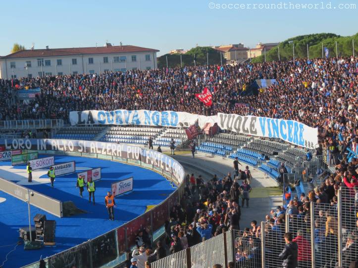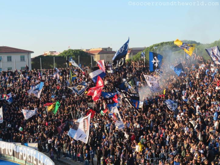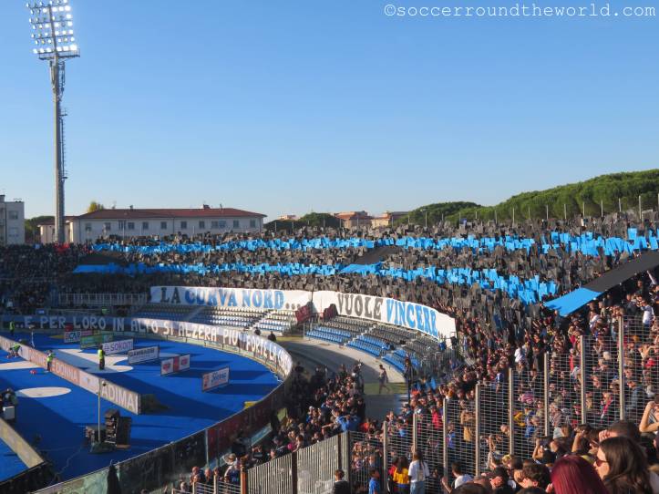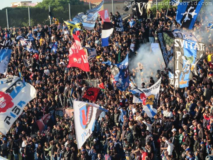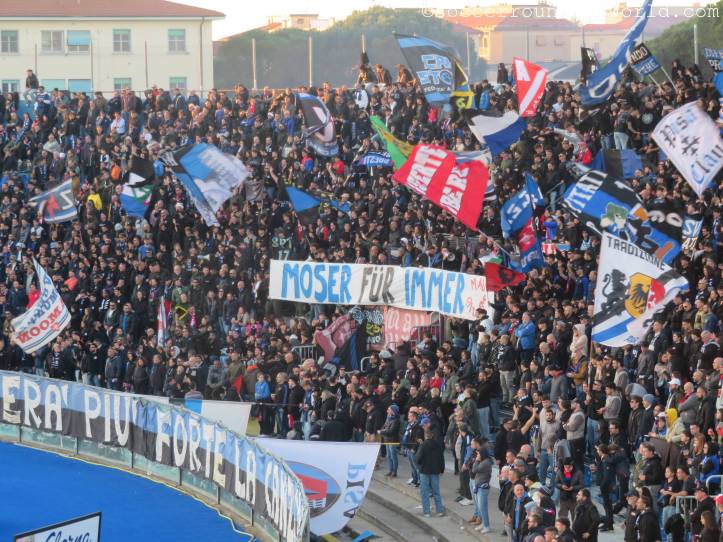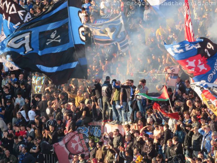 Erfrischender als die Leistung am Rasen ist jedenfalls die Vorstellung auf den Rängen. Auch wenn ich wegen blendender Sonne lange Zeit nur die Heimkurve neben hören auch betrachten kann, so bietet diese doch durchgängig ganz gutes Spektakel. In dieser nun doch schon etwas in die Monate gekommenen Saison wird sie wohl einer der wenigen Gründe sein, im Stadio Garibaldi einen vergnüglichen Nachmittag verbringen zu können. Sportliche Höchstleistungen sind von diesem Team wohl eher nicht mehr zu erwarten – aber wer weiß das schon so genau.